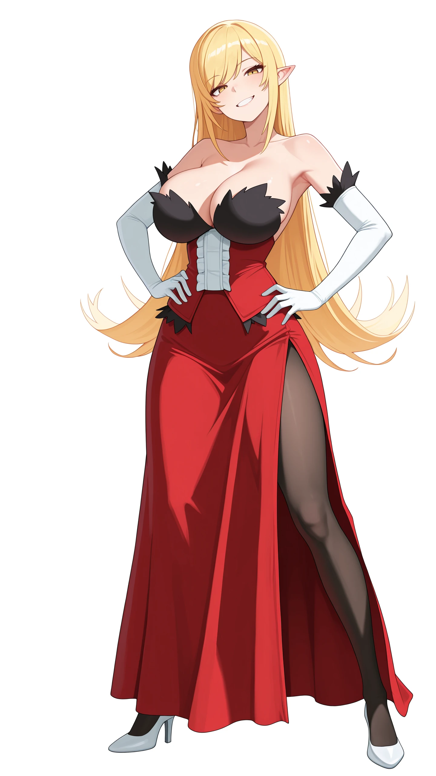 blonde hair, yellow eyes, pointy ears, sh1nobu, petiteRed Dress