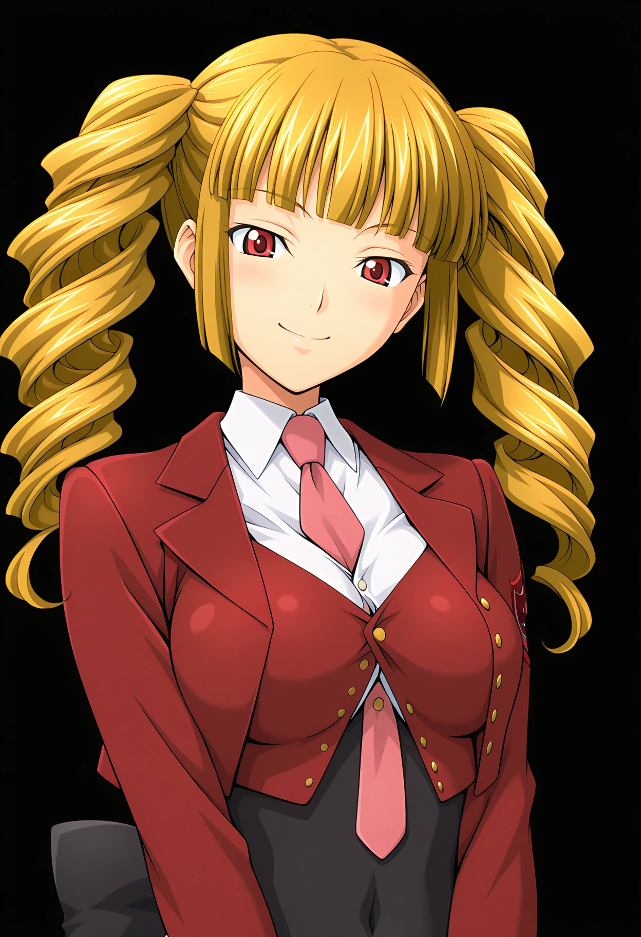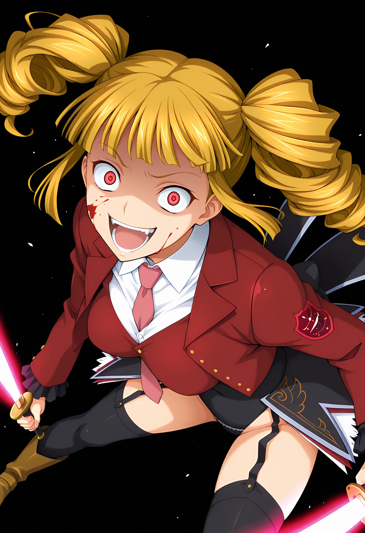 1girl, solo, beelzebub, stakes of purgatory, blonde hair, drill hair, twintails, long hair, twin drills, bangs, red eyes