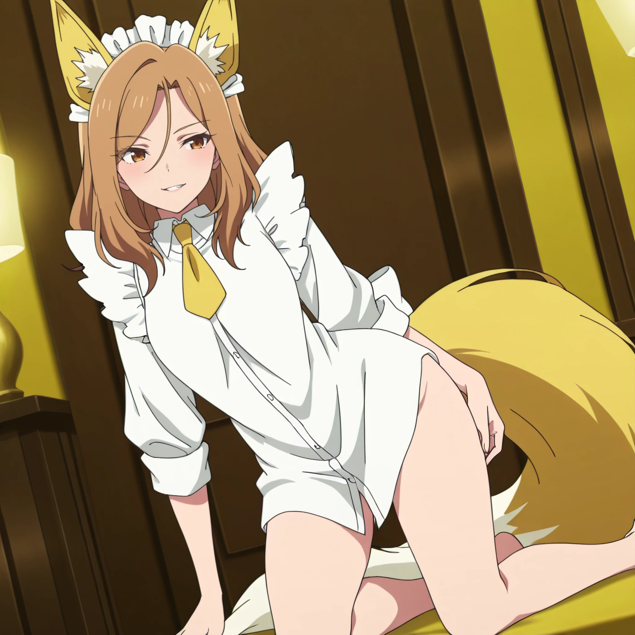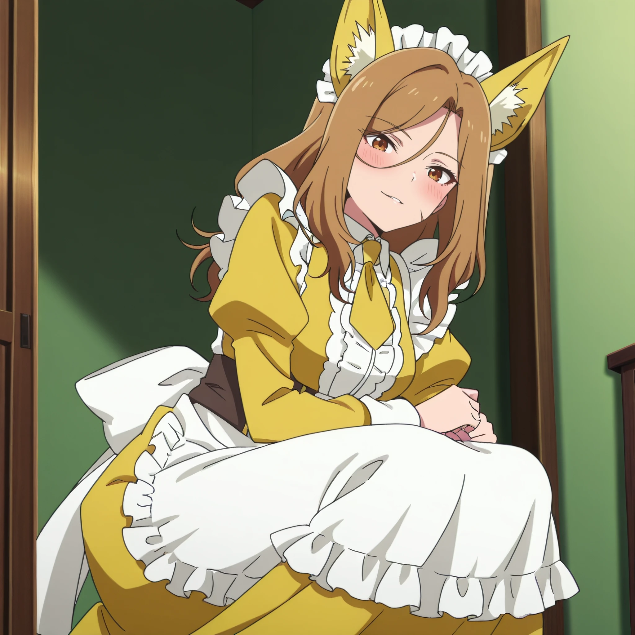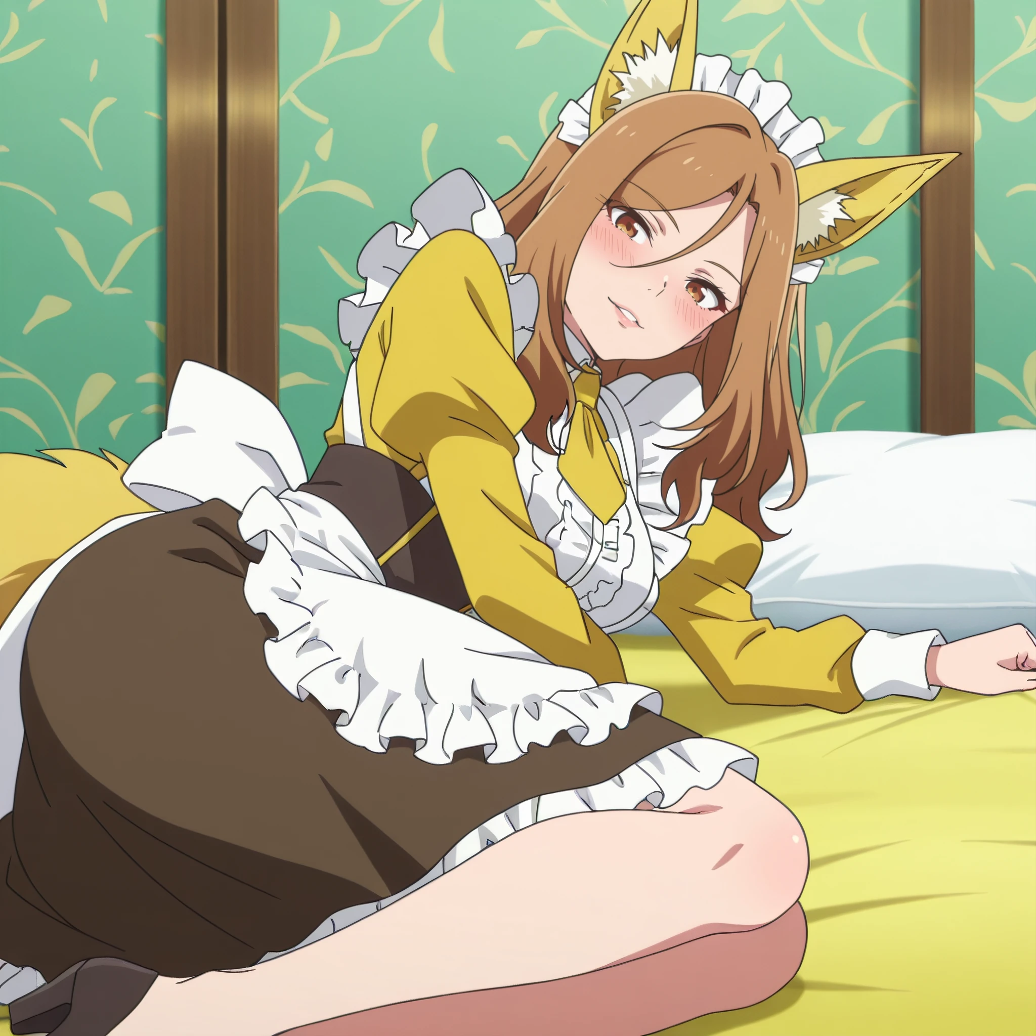 AMWFoxMaid, animal ears, brown hair, long hair, brown eyes, yellow bow, bow, yellow bowtie, bowtie, fox ears, yellow ribbon,