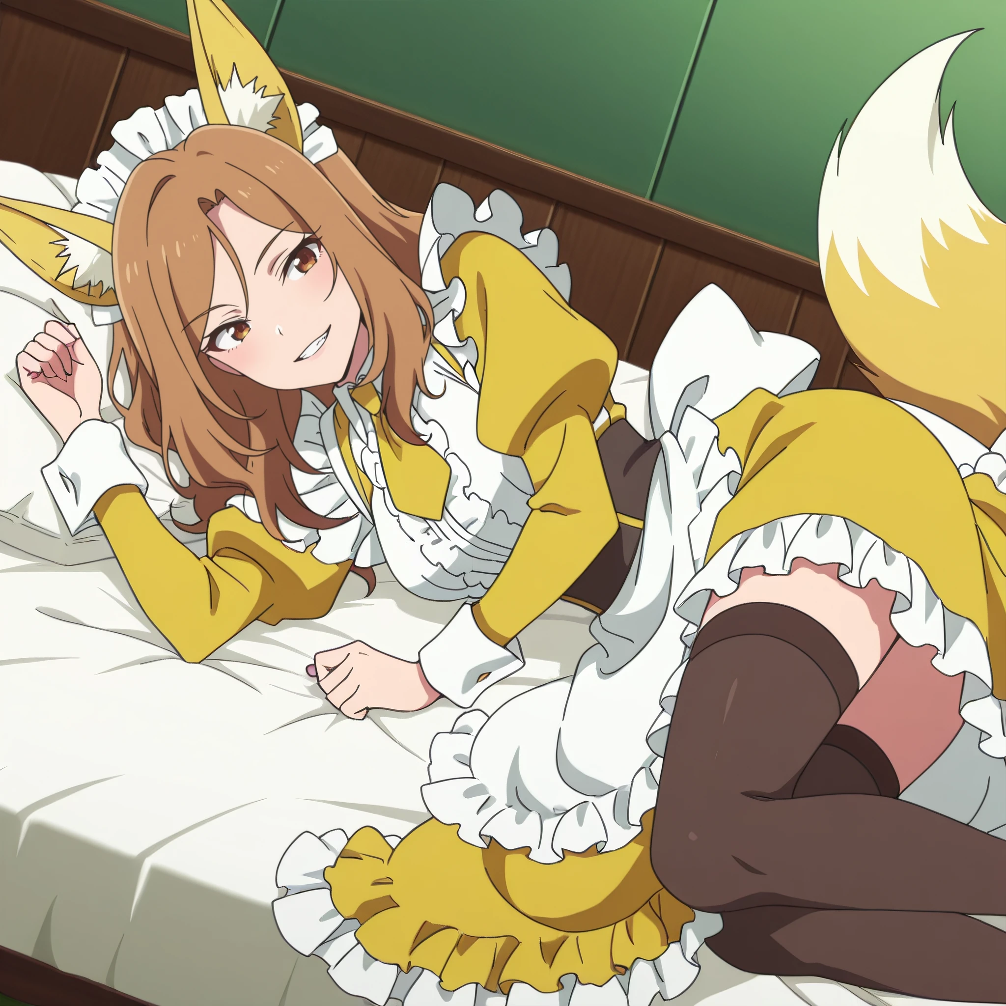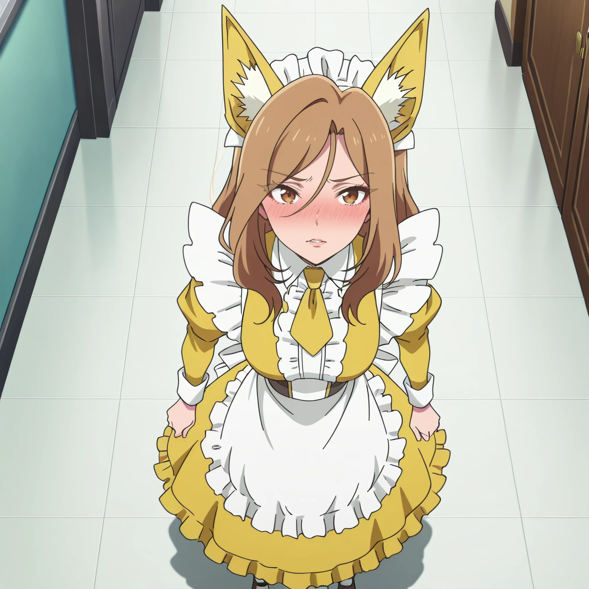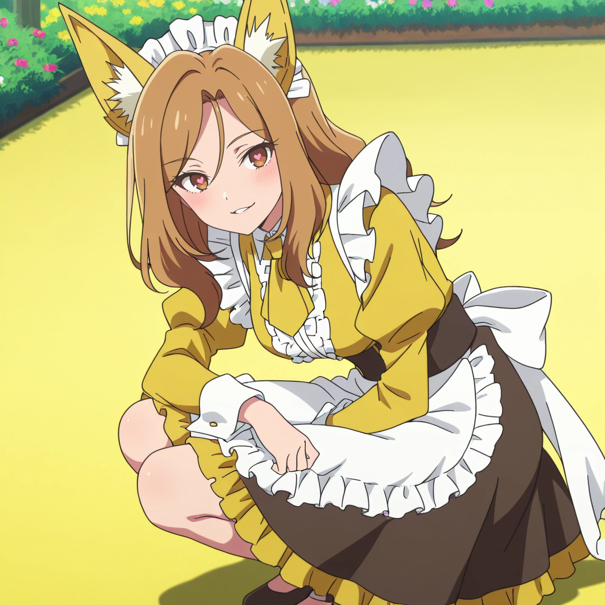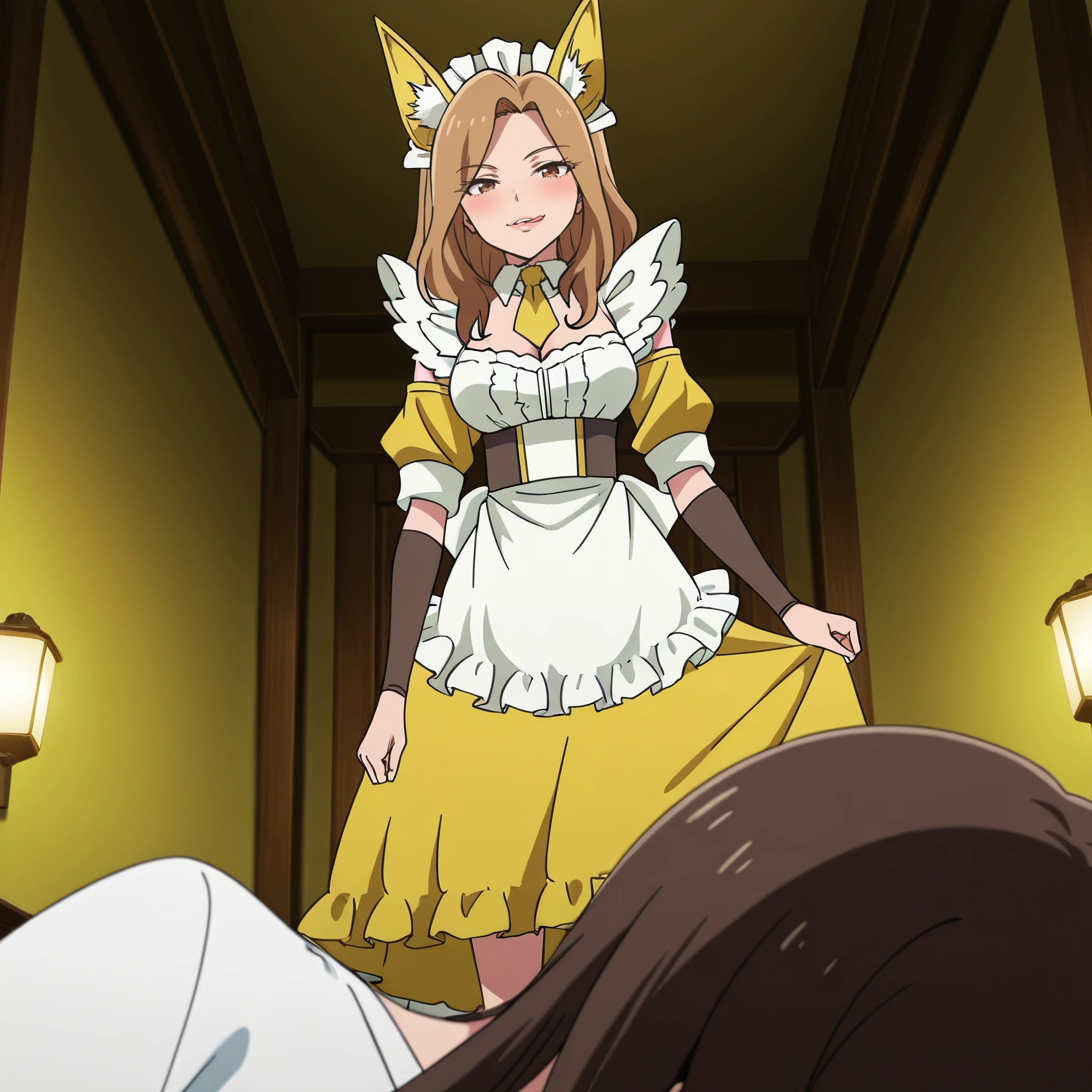 AMWFoxMaid, animal ears, brown hair, long hair, brown eyes, yellow bow, bow, yellow bowtie, bowtie, fox ears, yellow ribbon,