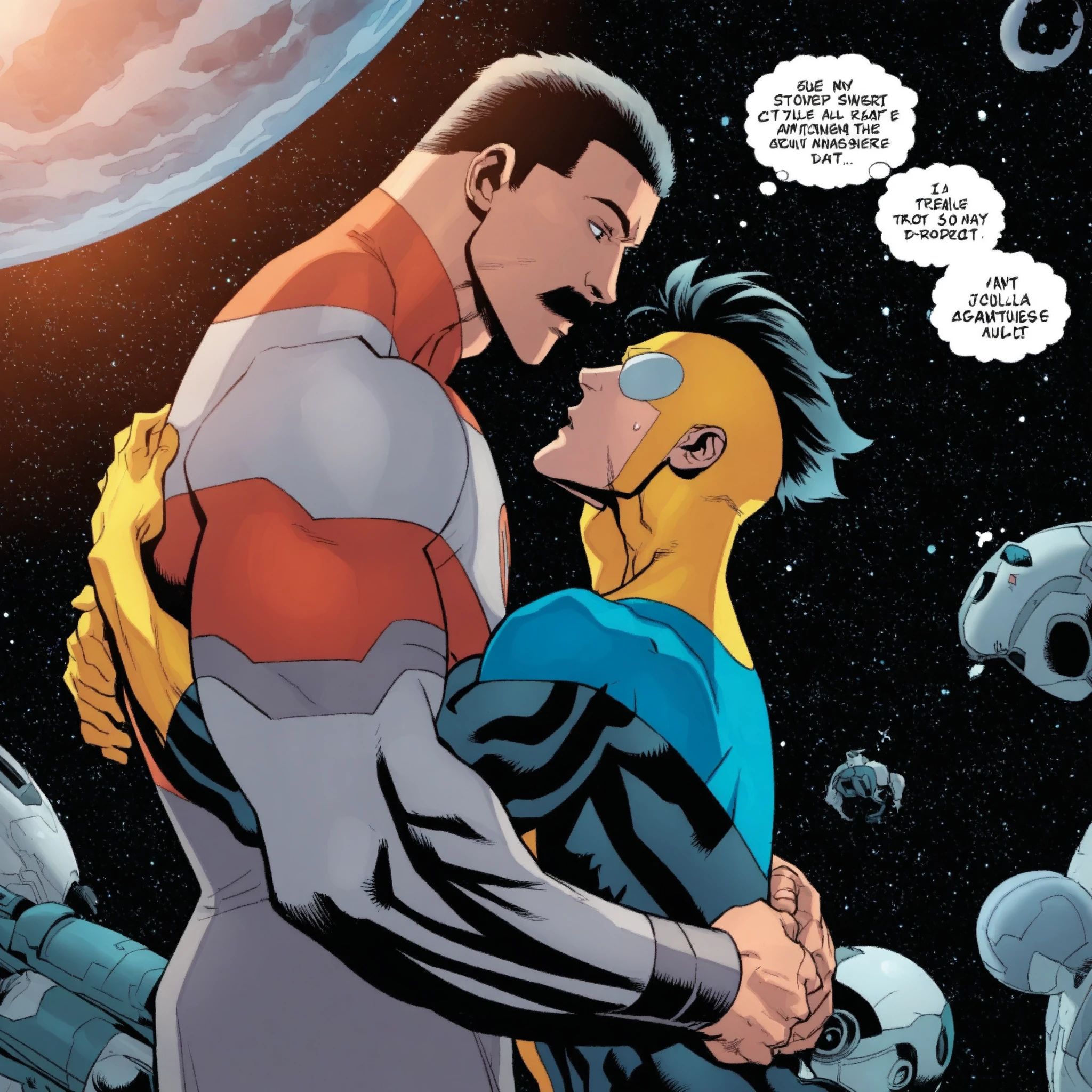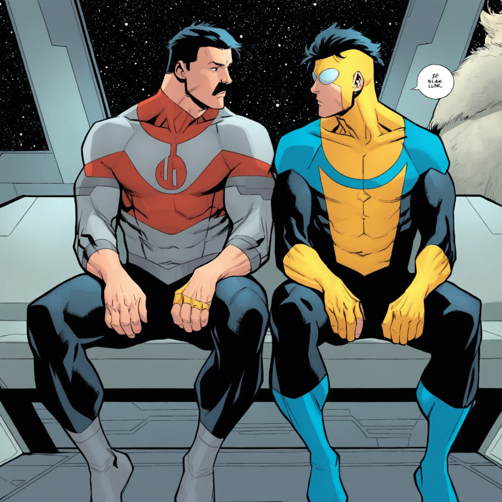 invincible has black hair and mask and multi-colored blue-black-yellow suit