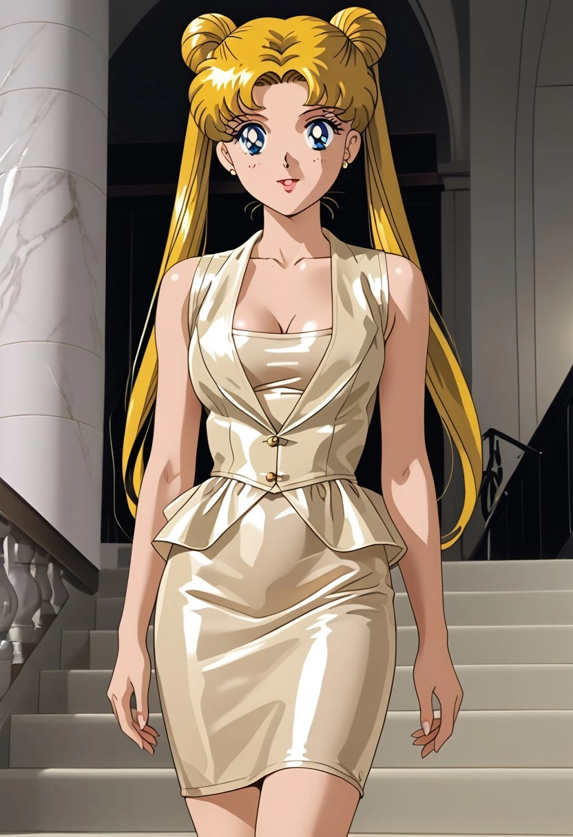 (strapless dress, bodycon dress, latex dress, beige dress, sheer sheer, knee-length dress, corset vest, sleeveless, plunging neckline, V-neck, fitted at the waist, fitted silhouette, peplum detail, flared waist, silver sandals, heels)