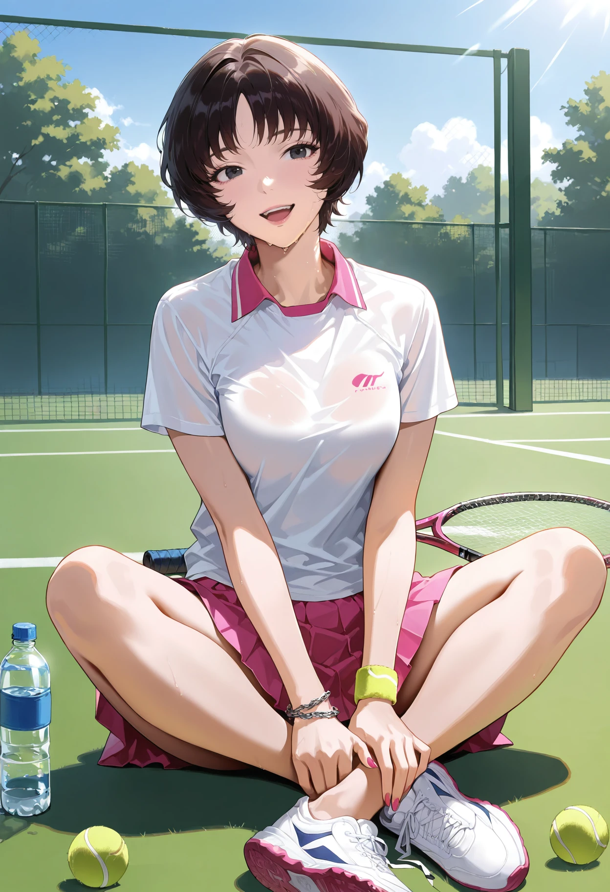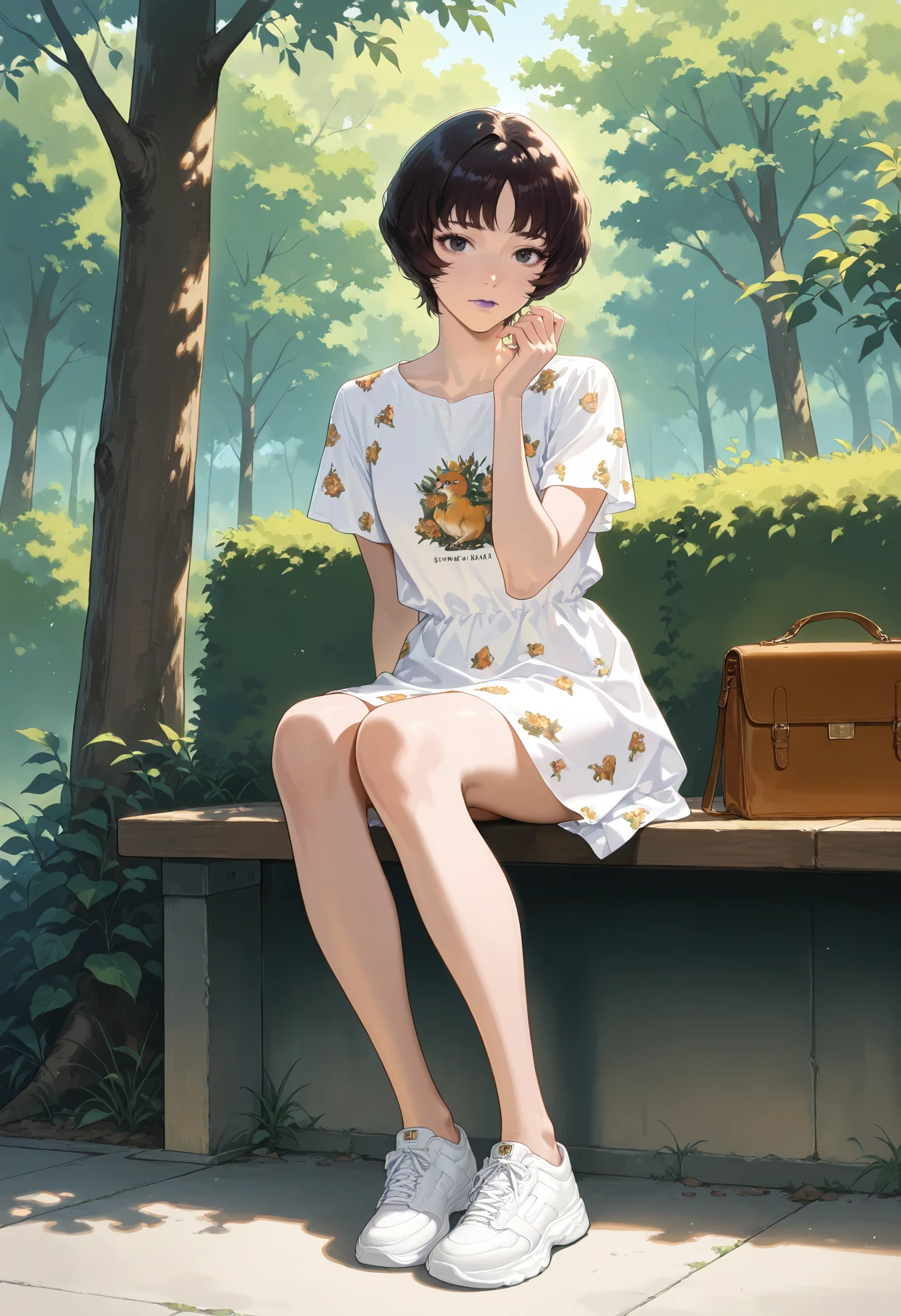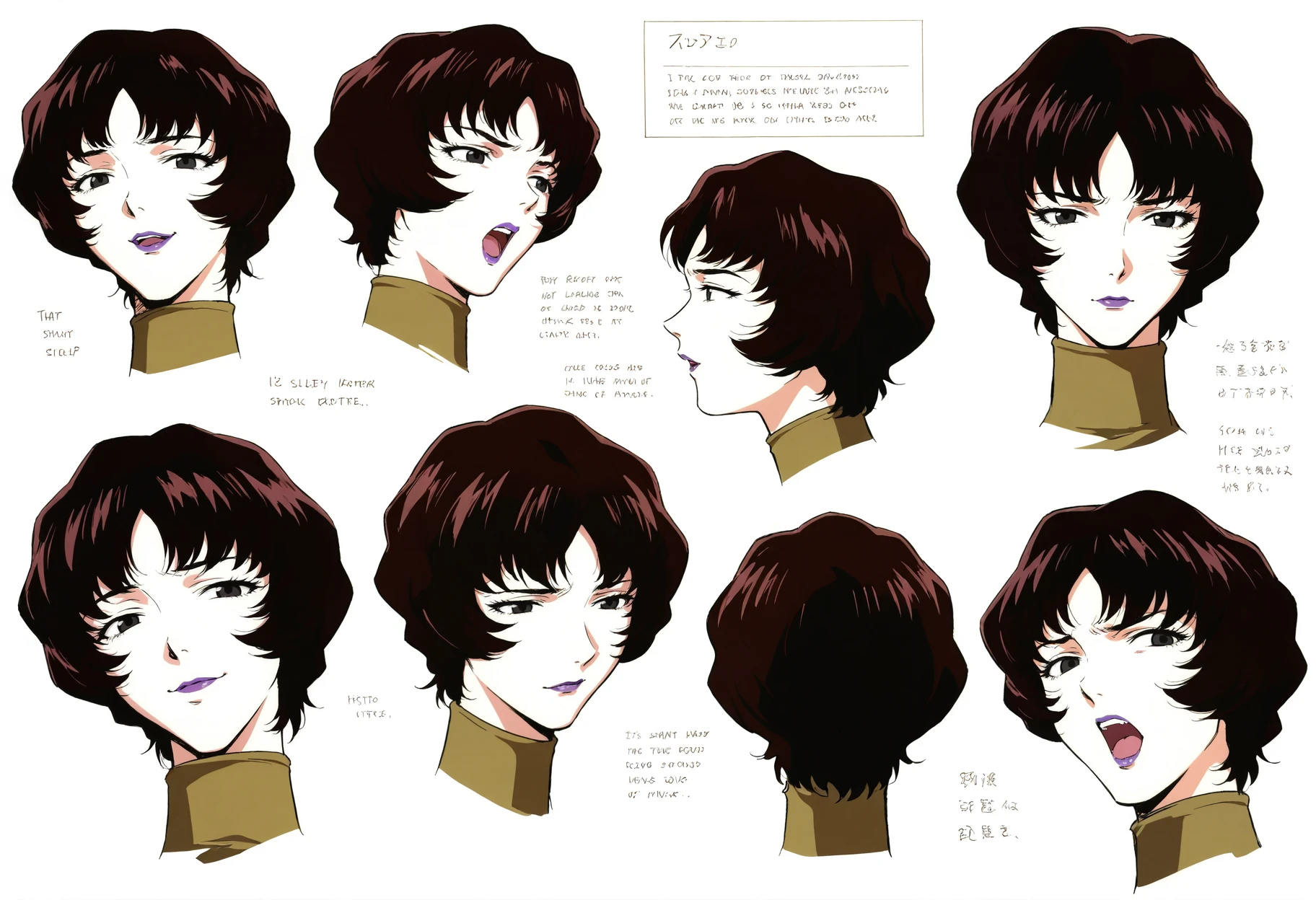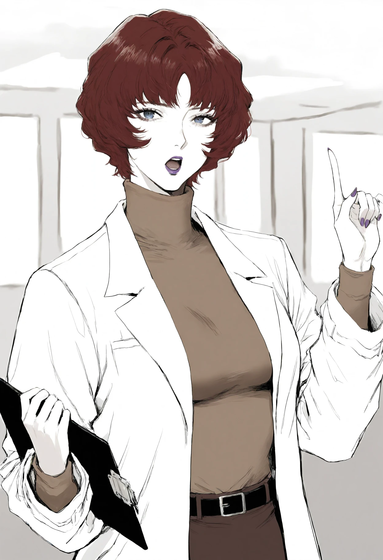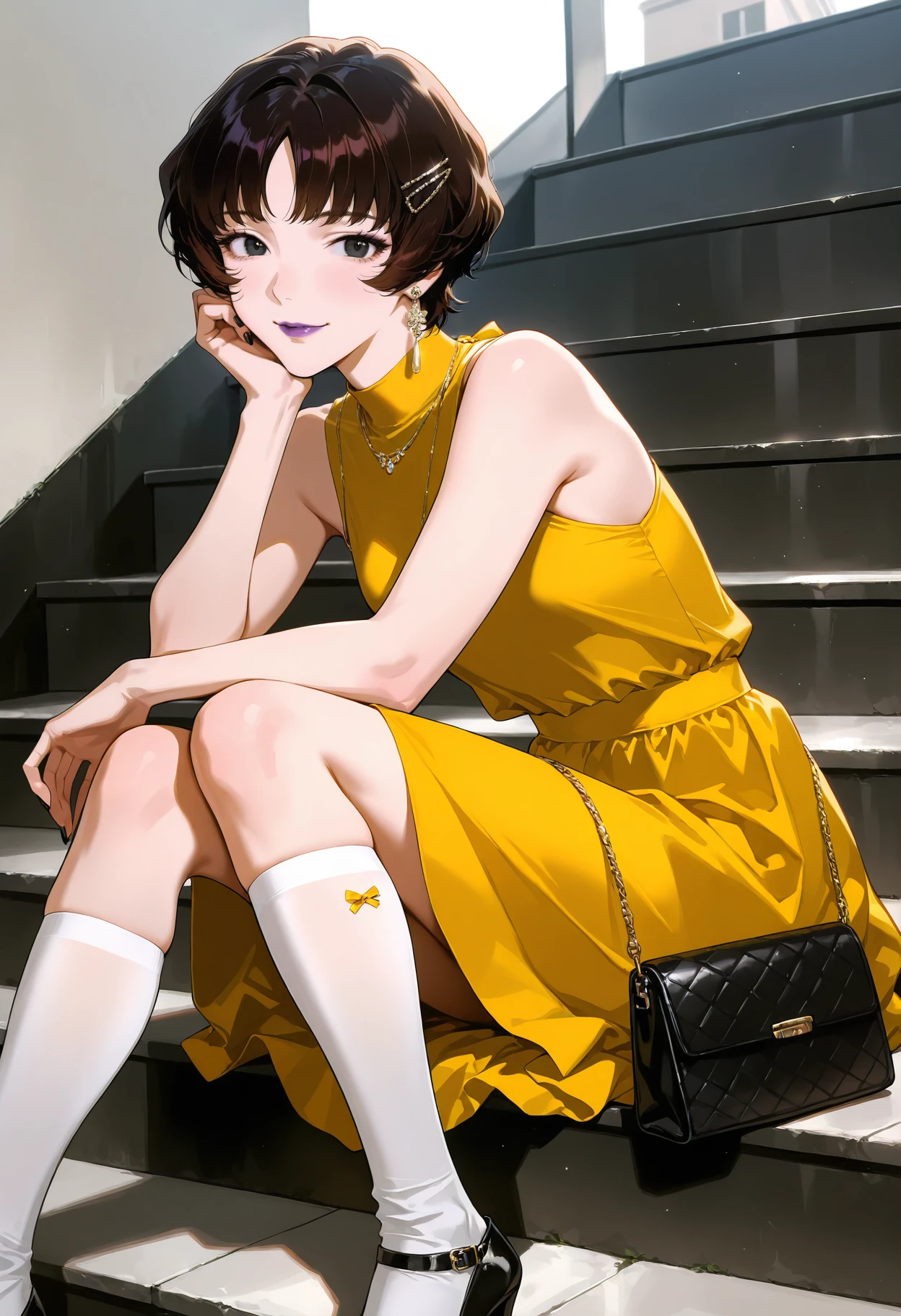 1girl,black eyes,short hair,black hair,bangs,brown hair,lipstick,purple lips