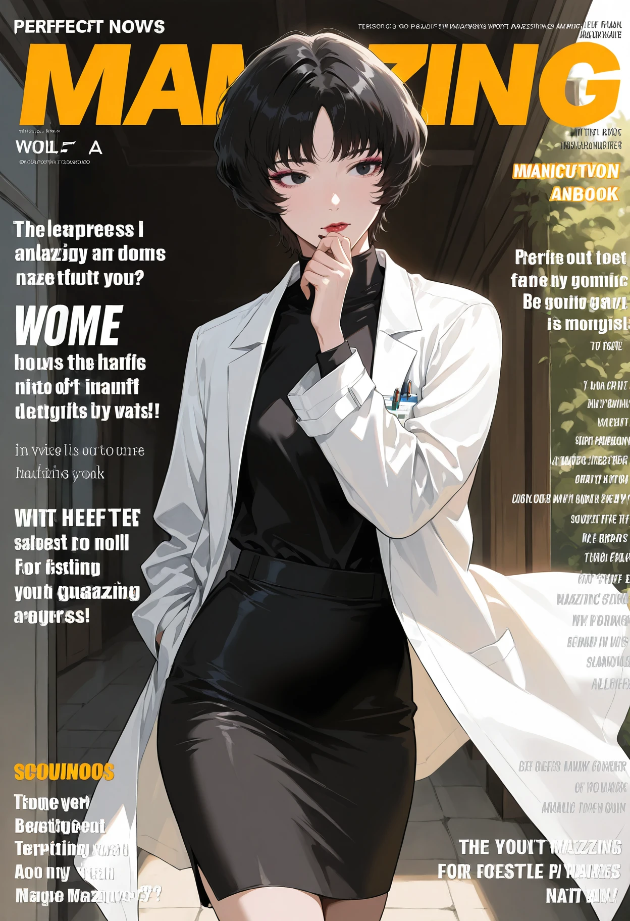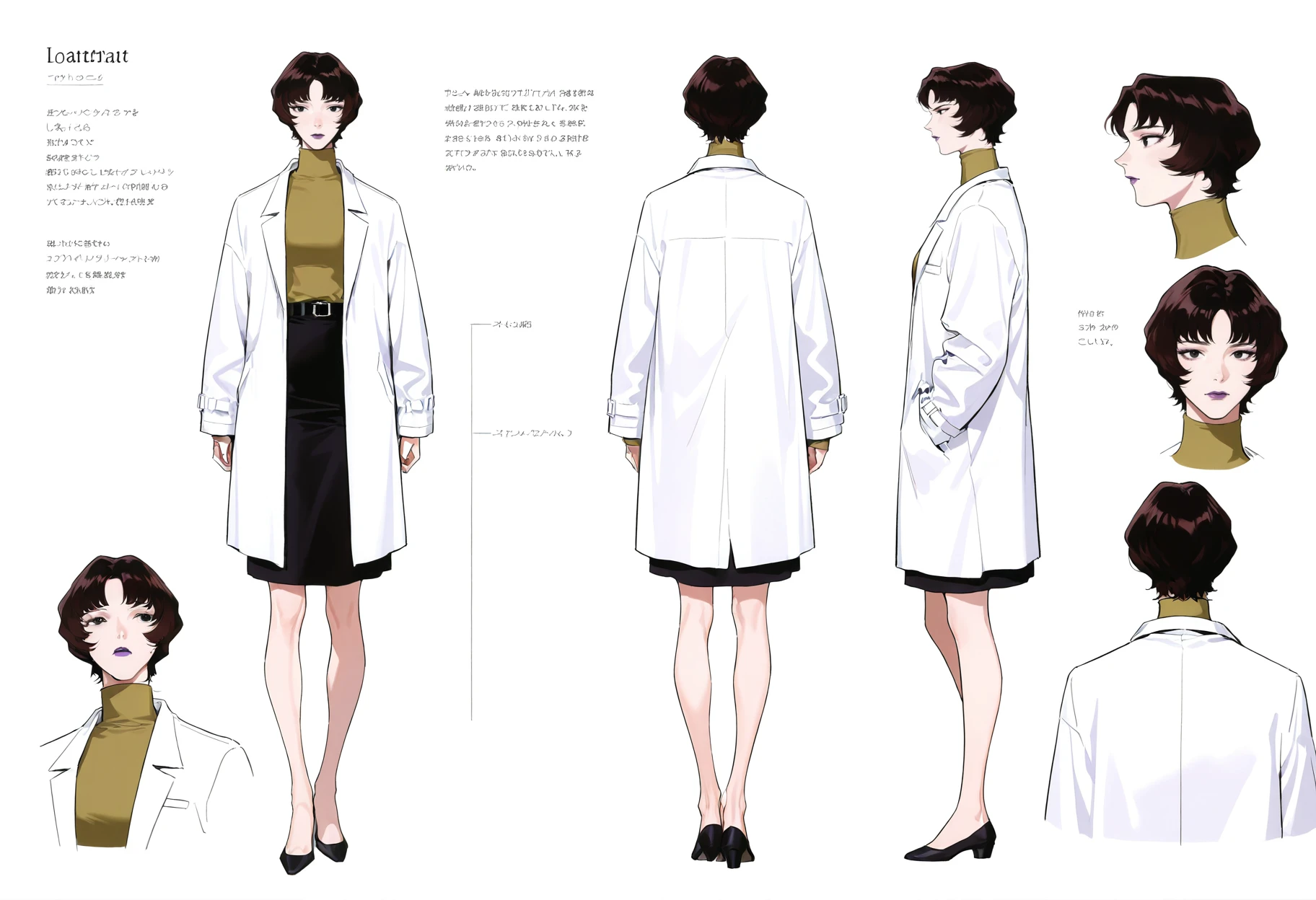 skirt,labcoat,black skirt,black footwear,belt,sweater,long sleeves,turtleneck,shirt,coat,shoes,high heels,white coat,pencil skirt,black belt