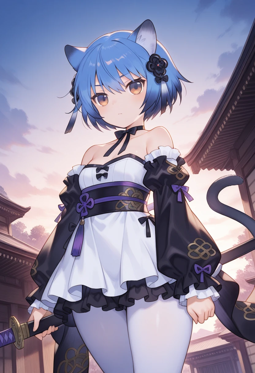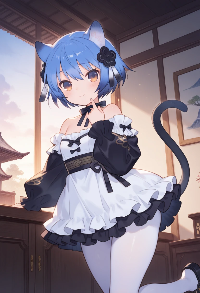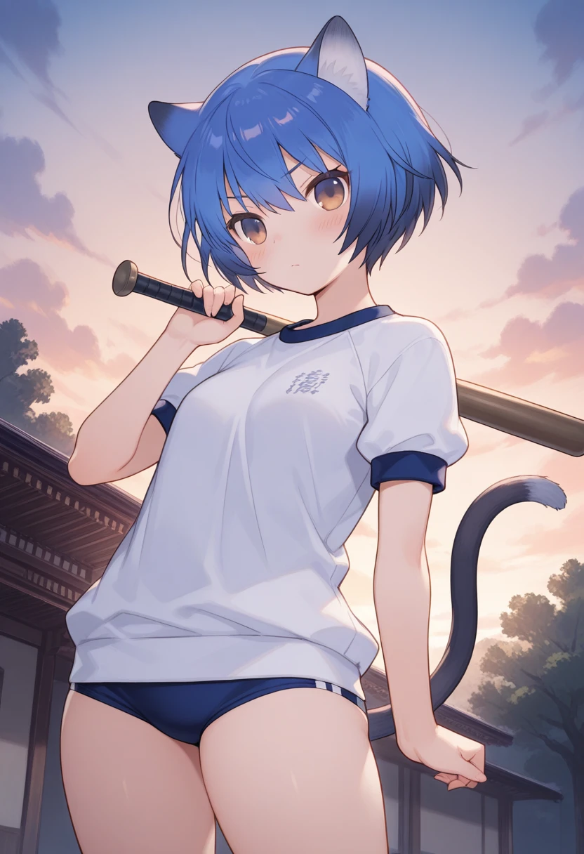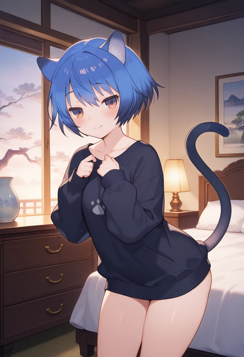 katsushige_muramasa, blue hair, brown eyes, cat ears, cat tail, short hair