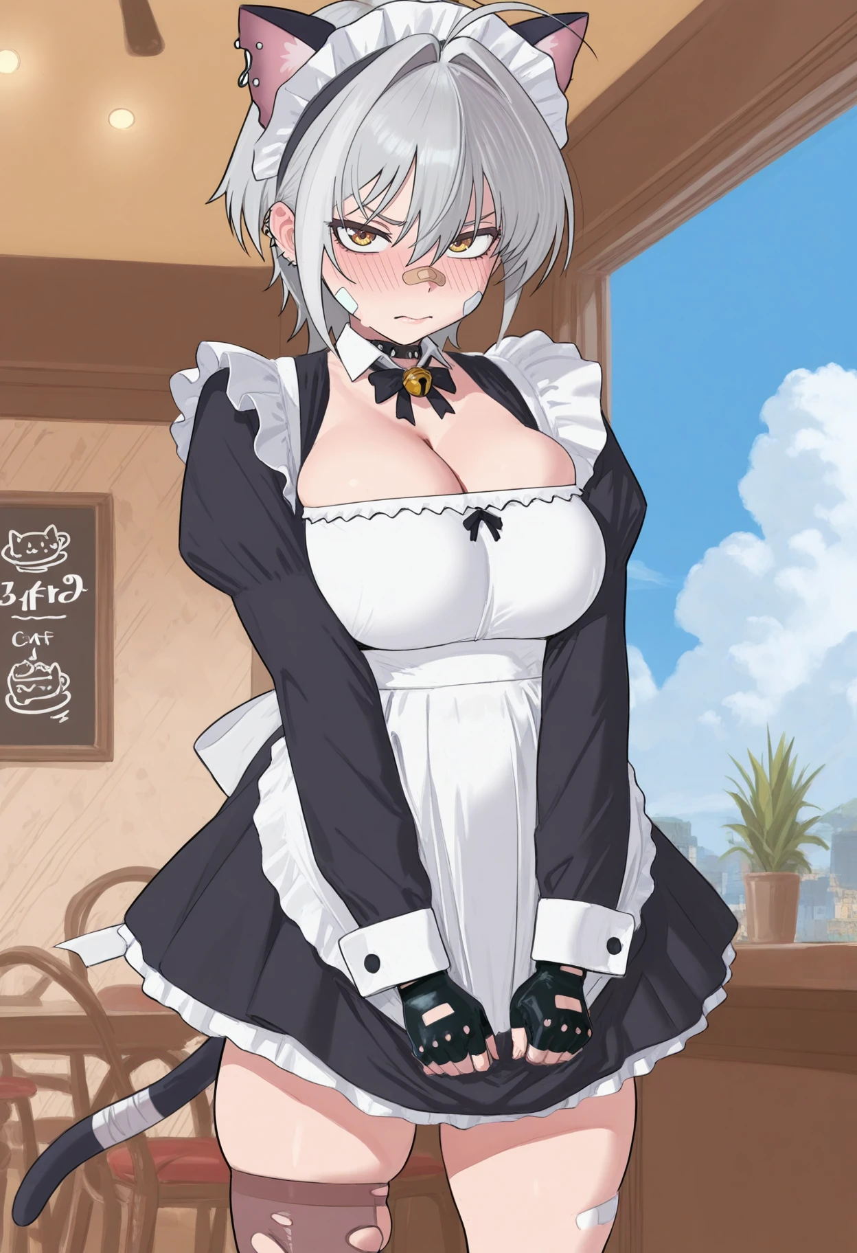 maid, neck bell, cat ear hairband, long sleeves, fingerless gloves, single thighhigh, torn thighhigh, cat tail, boots,Gold Bikini: