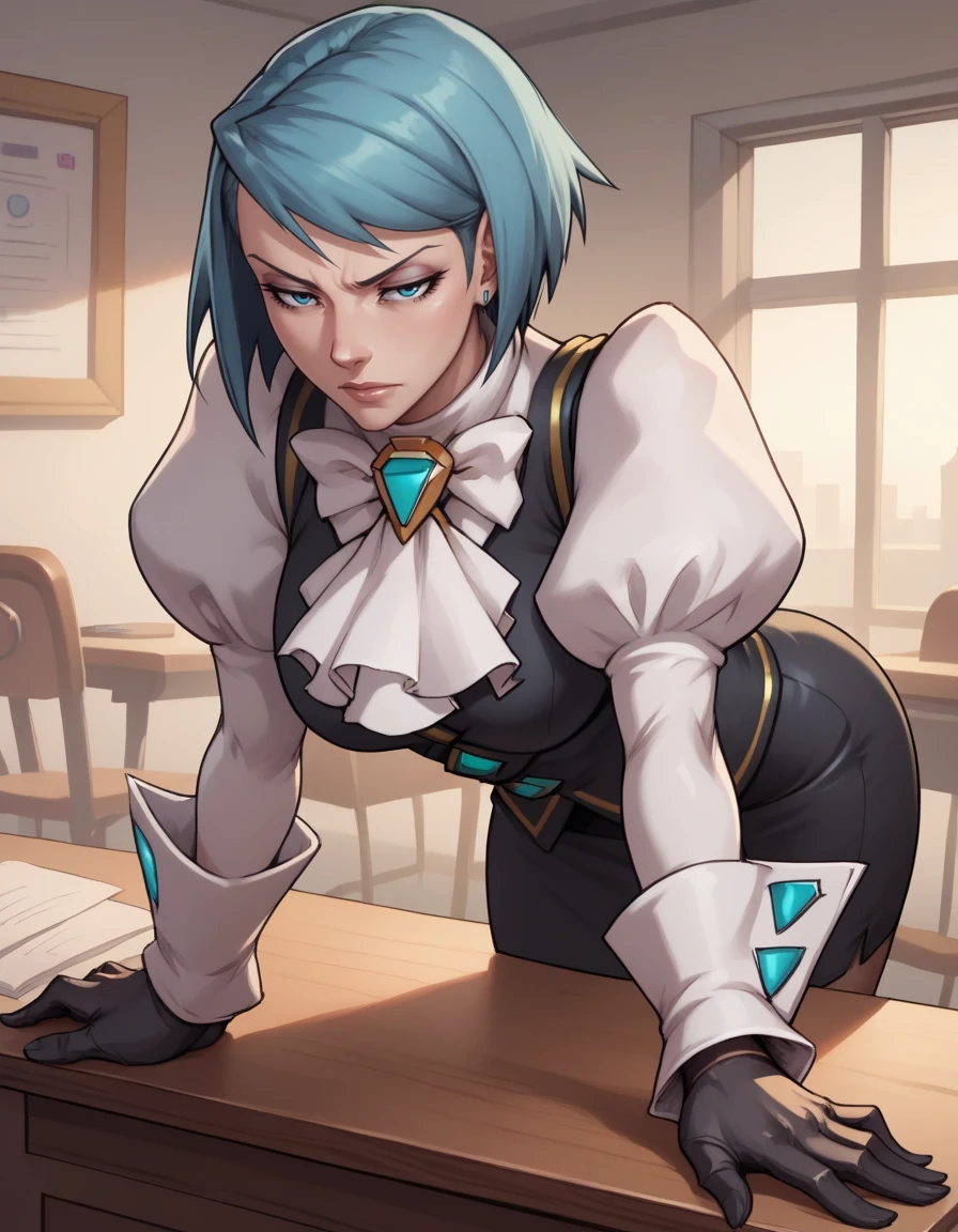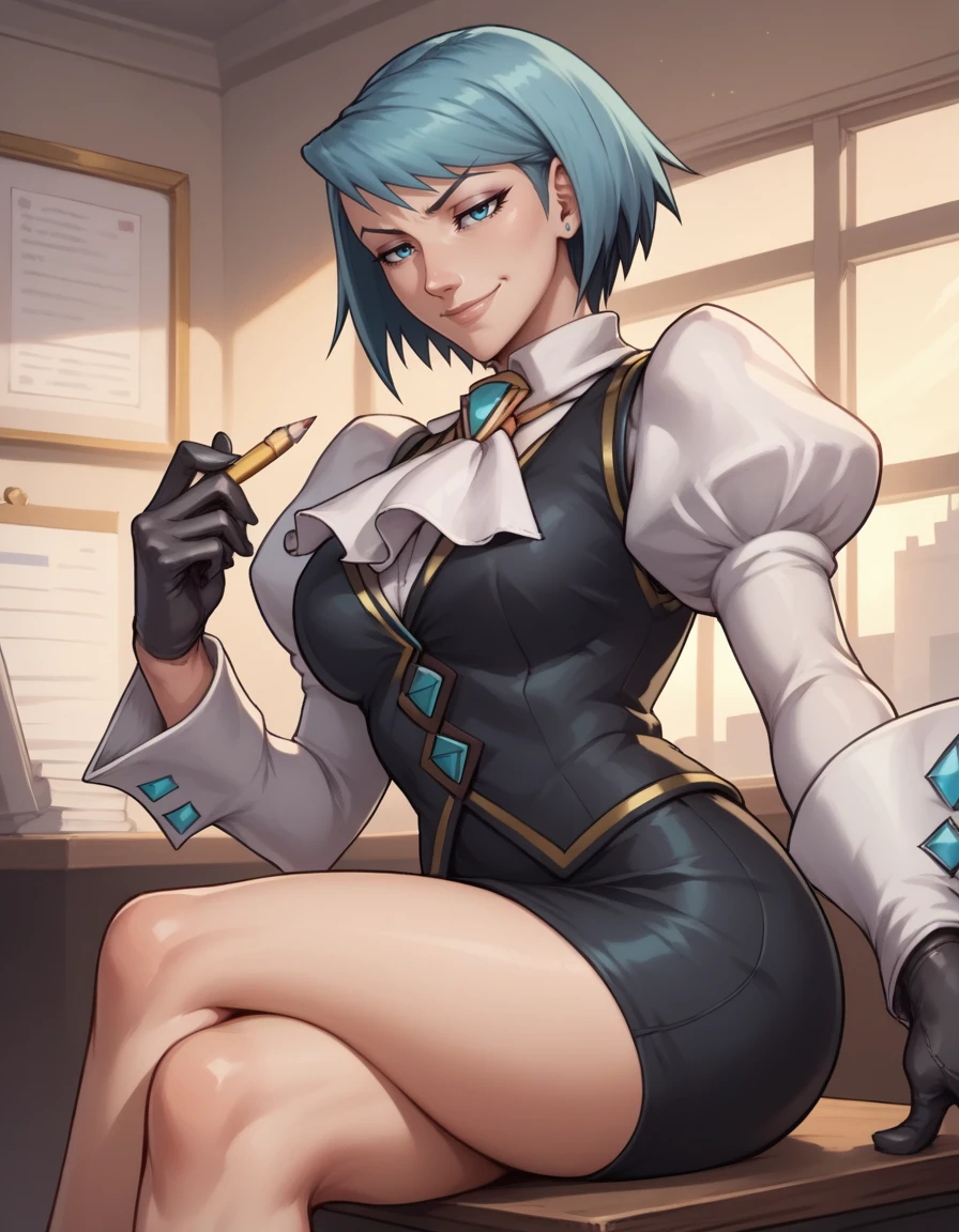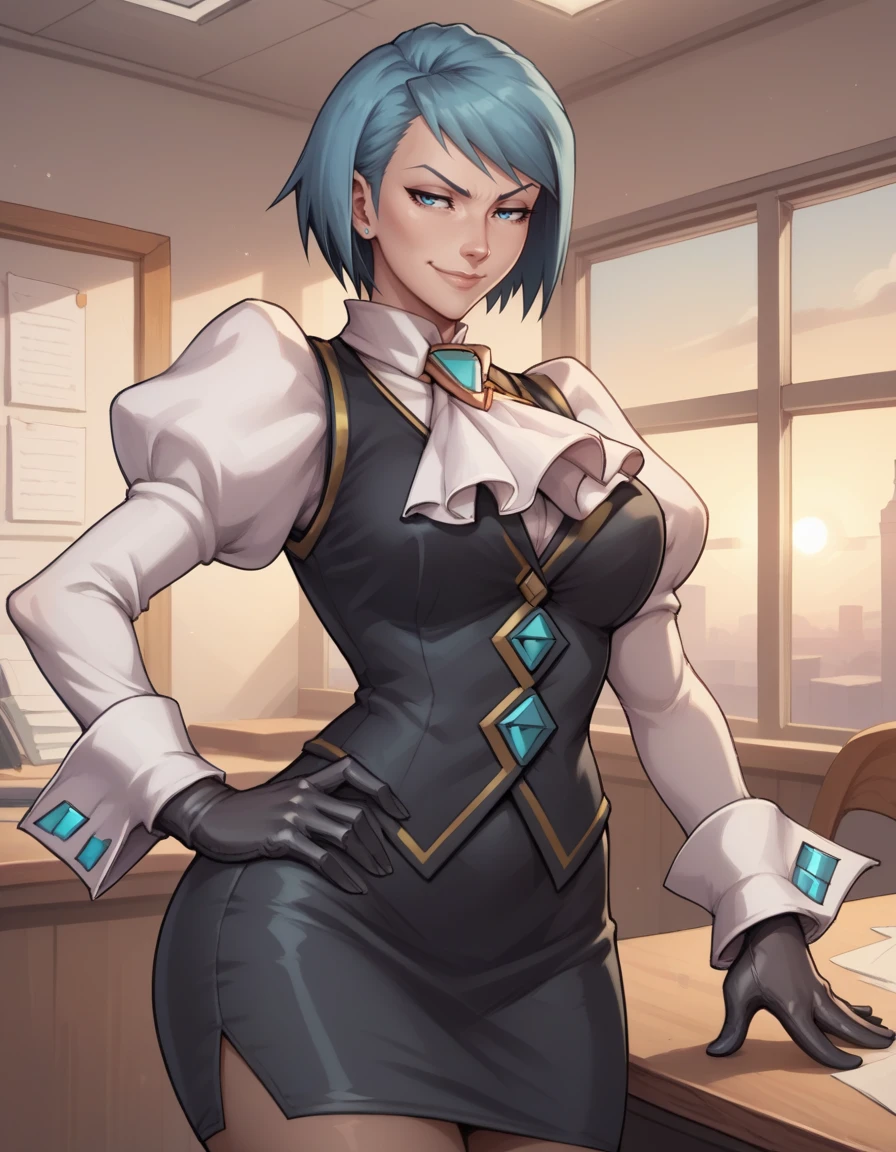 miniskirt, puffy sleeves, black skirt, gloves,ascot, black vest,