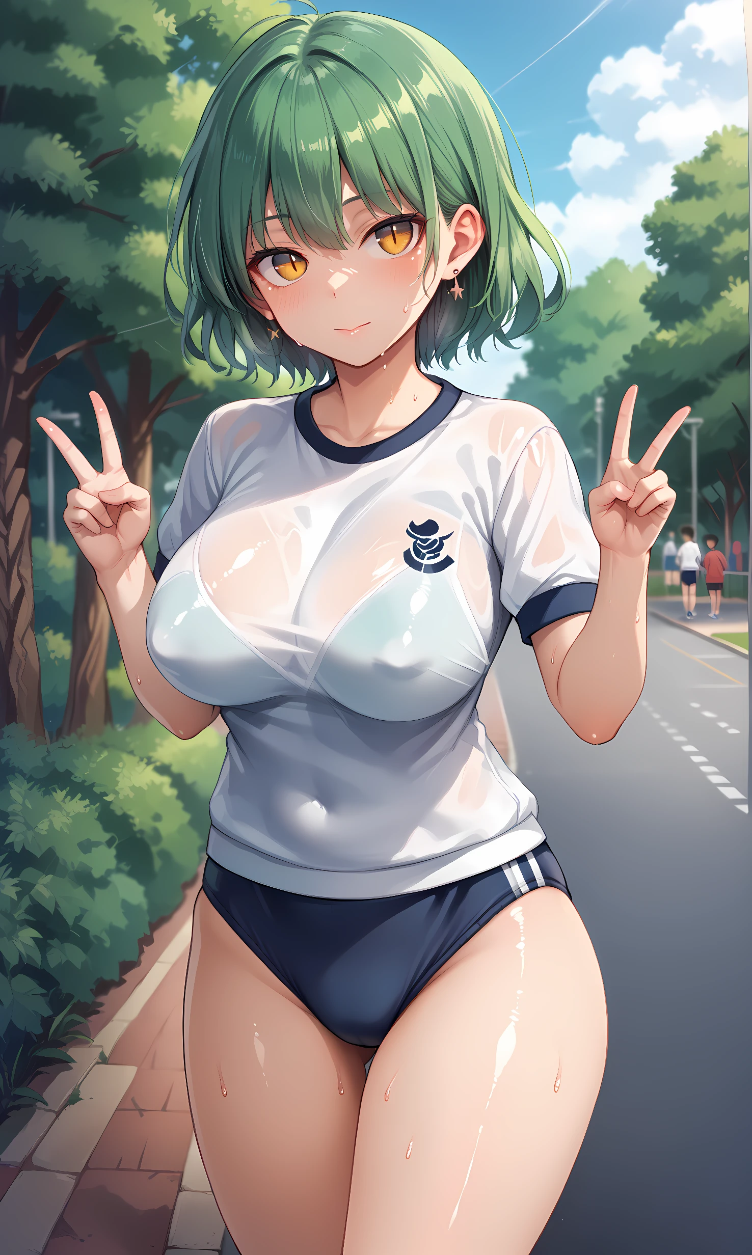 hikage, yellow eyes, slit pupils, green hair, short hair, earrings, choker