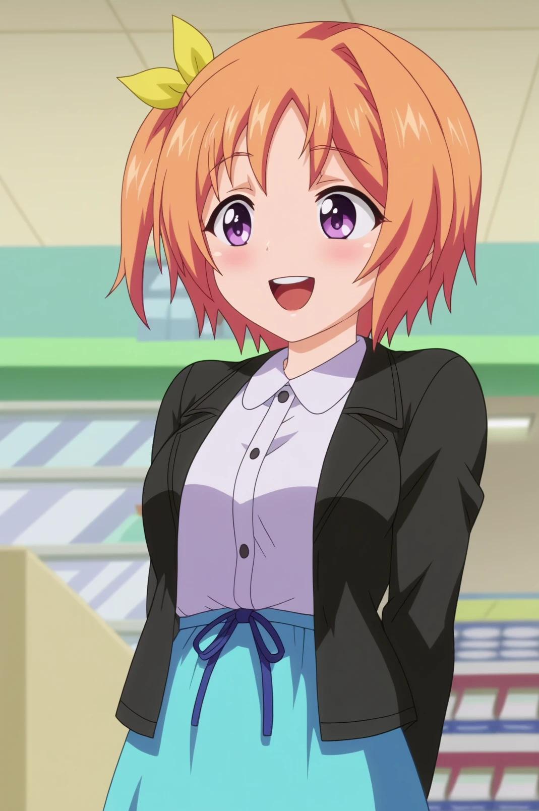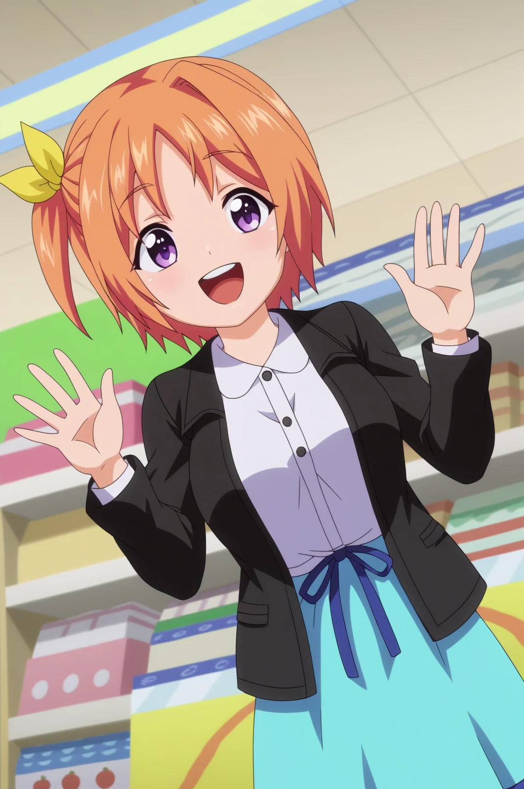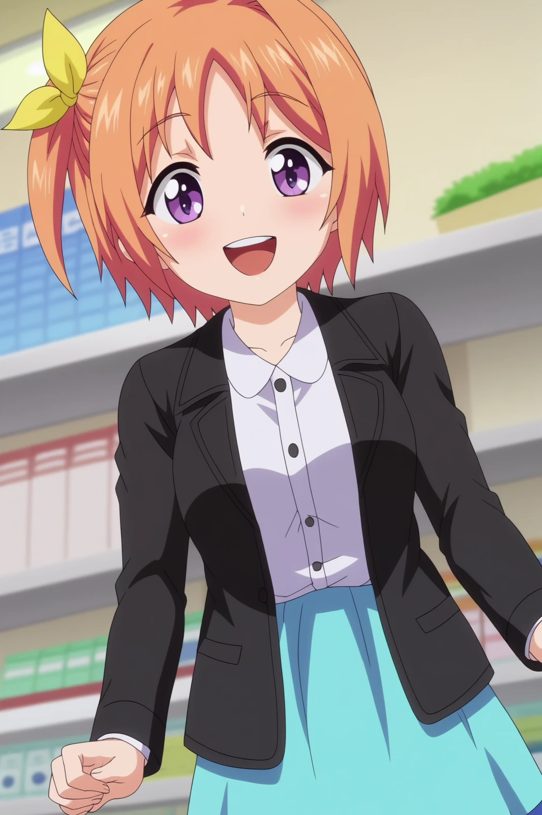 kururu hiiragi,short hair,side ponytail,black blazer,blue skirt, white shirt,yellow hair bow