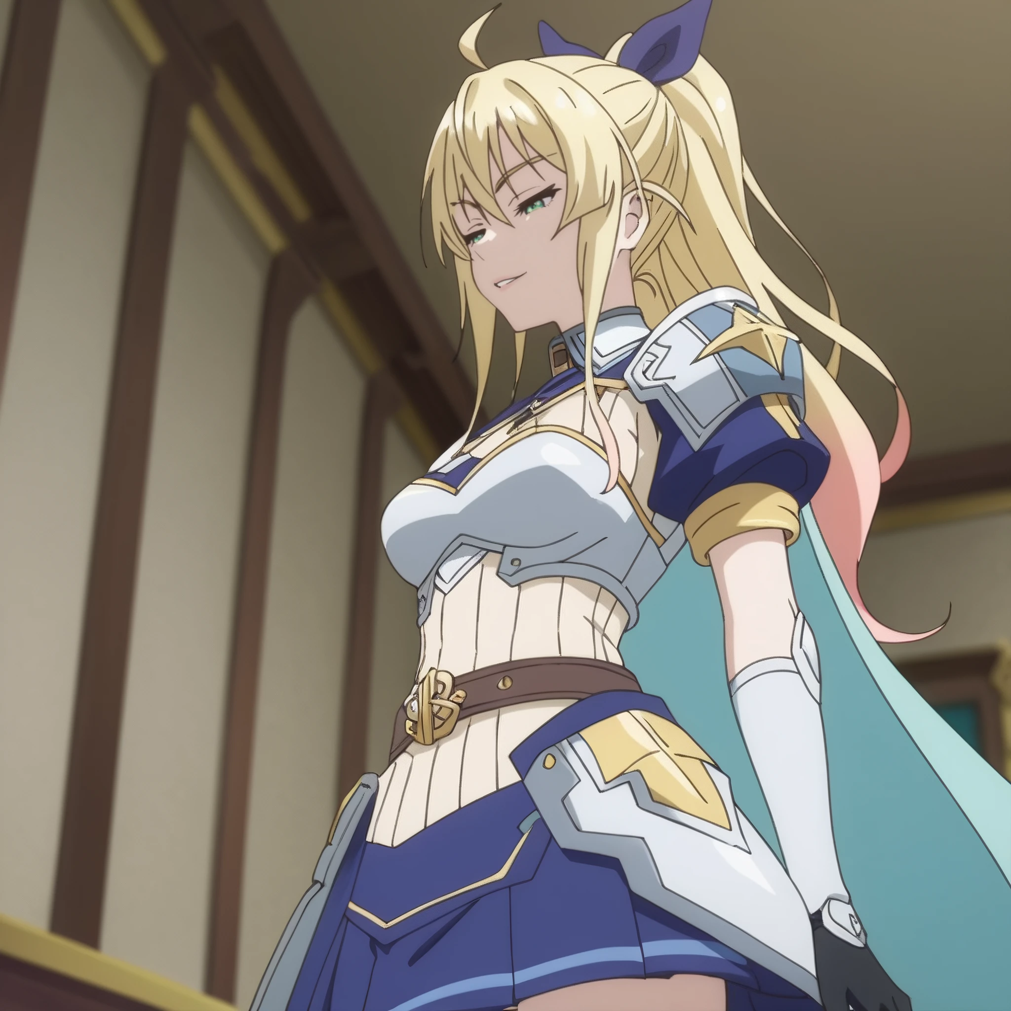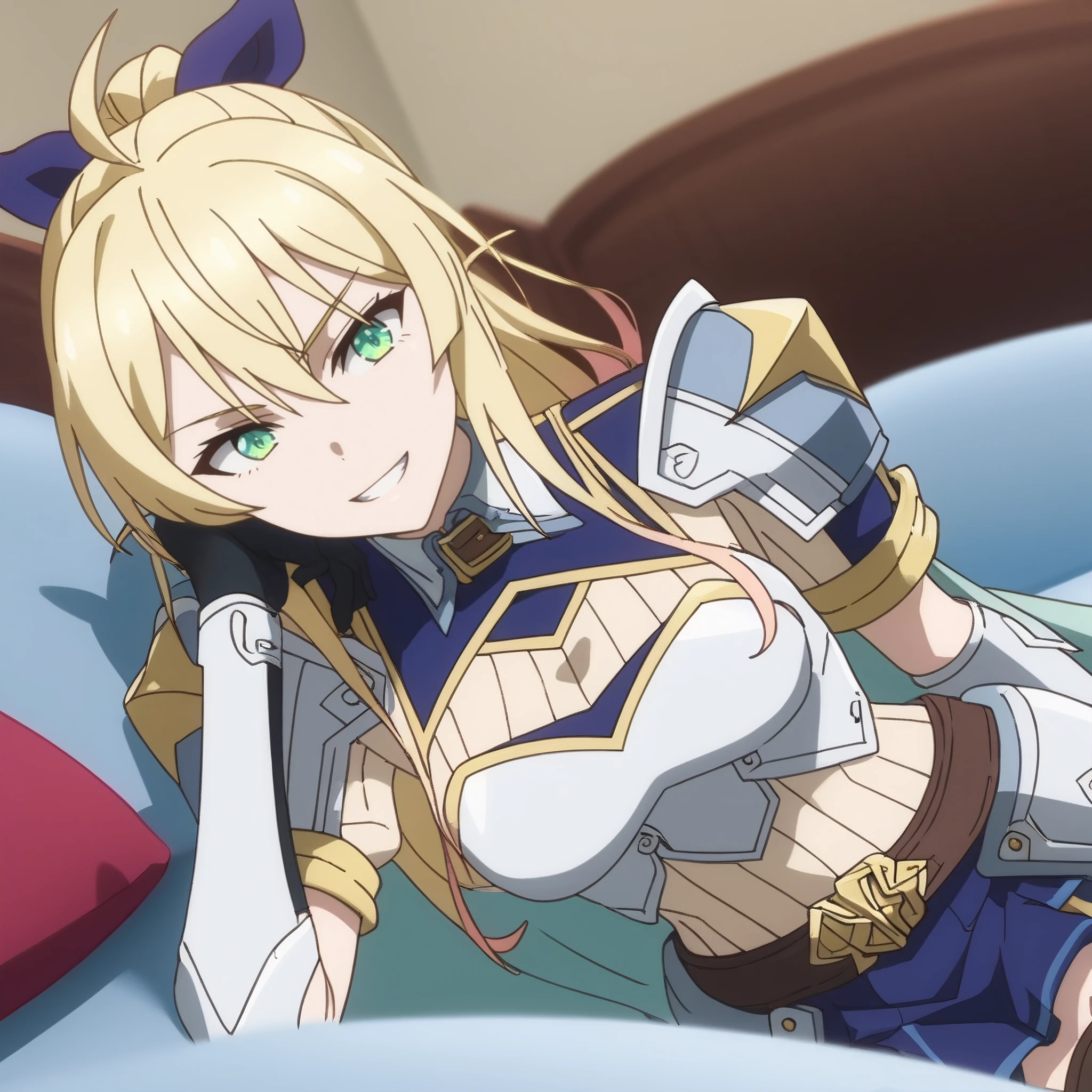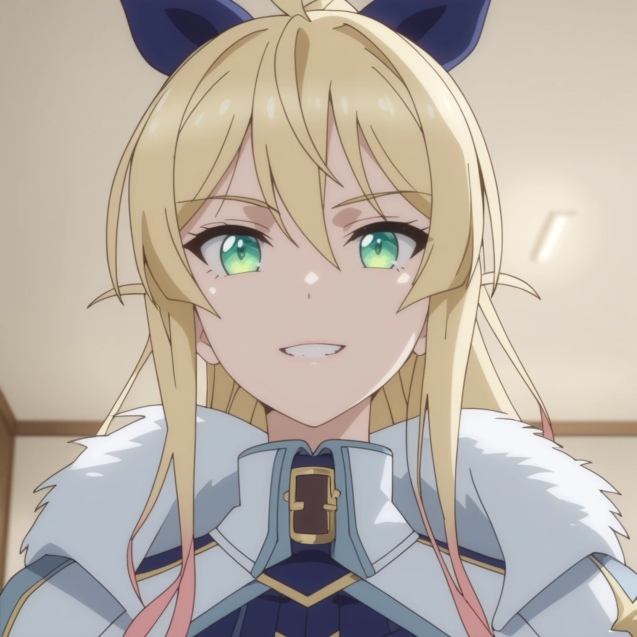 SRALina, blonde hair, long hair, green eyes, ponytail, ahoge, hair between eyes, blue hair bow, sidelocks,