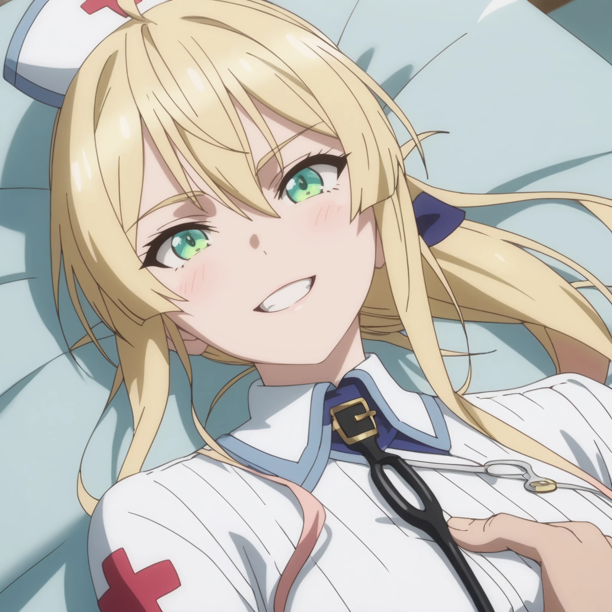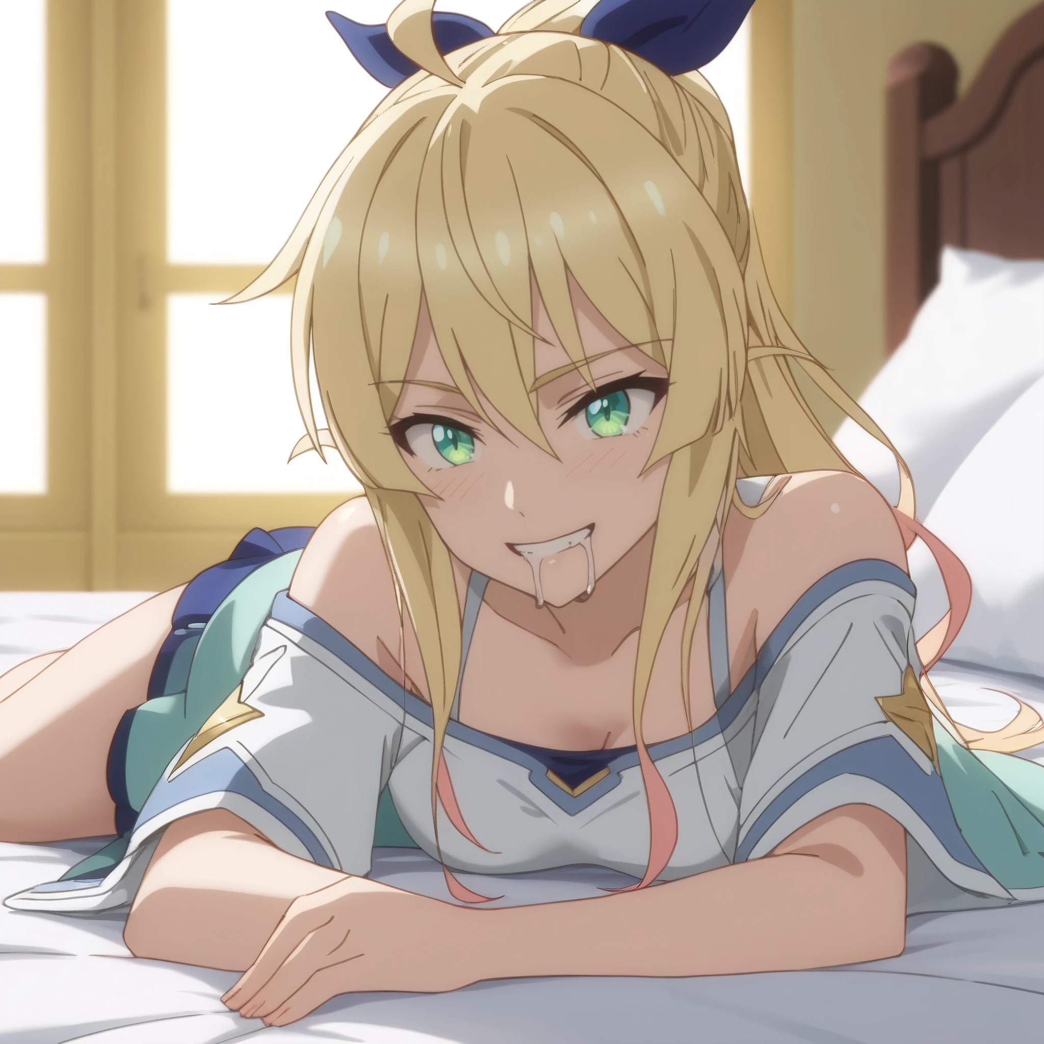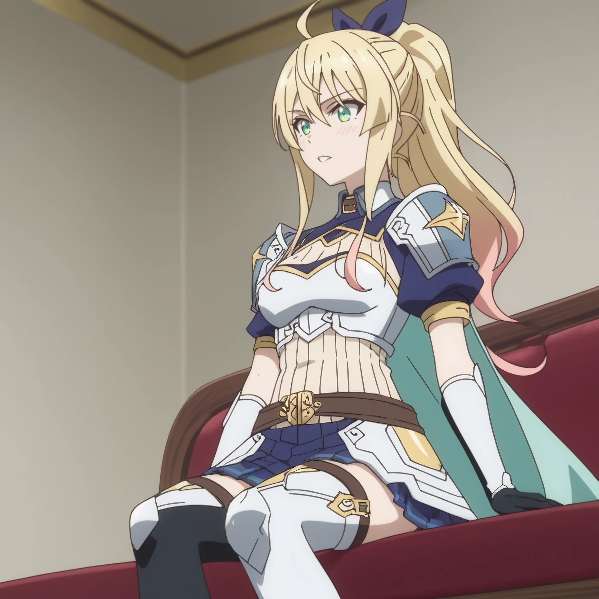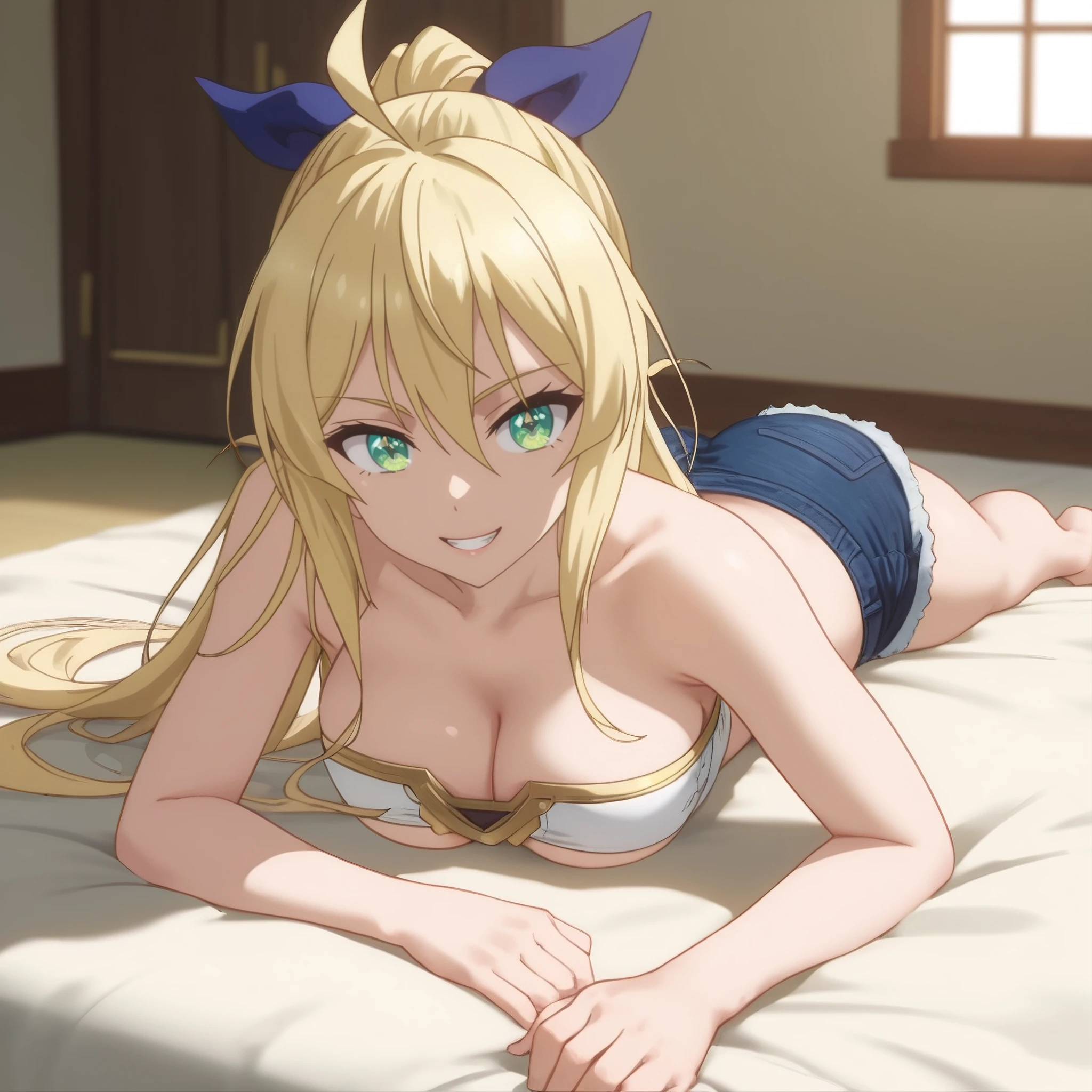 SRALina, blonde hair, long hair, green eyes, ponytail, ahoge, hair between eyes, blue hair bow, sidelocks,