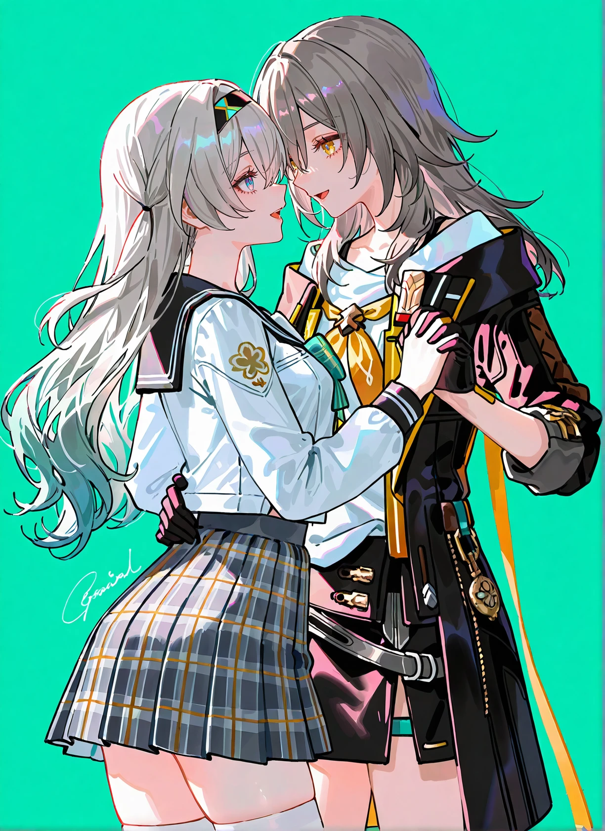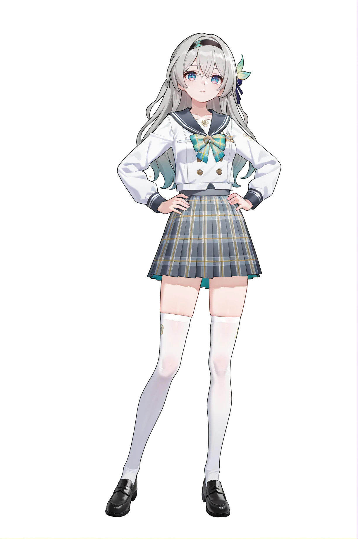 Firefly \(honkai: star rail\), Fireflychun, clothes: Fireflychun school uniform, 1girl, Fireflychun grey plaid skirt, long hair, white thighhighs, grey hair, blue eyes, sailor collar, long sleeves, hairband, bowtie