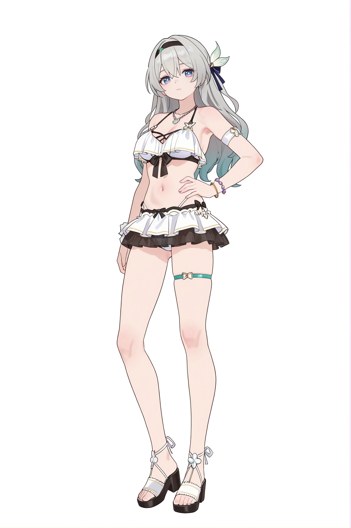 Firefly \(honkai: star rail\),Fireflysw clothes: Fireflysw white swimsuit,Fireflysw bikini skirt,Fireflysw white frilled bikini,1girl,long hair,blue eyes,jewelry,grey hair,necklace,bracelet,breasts,black hairband,see-through open shirt,