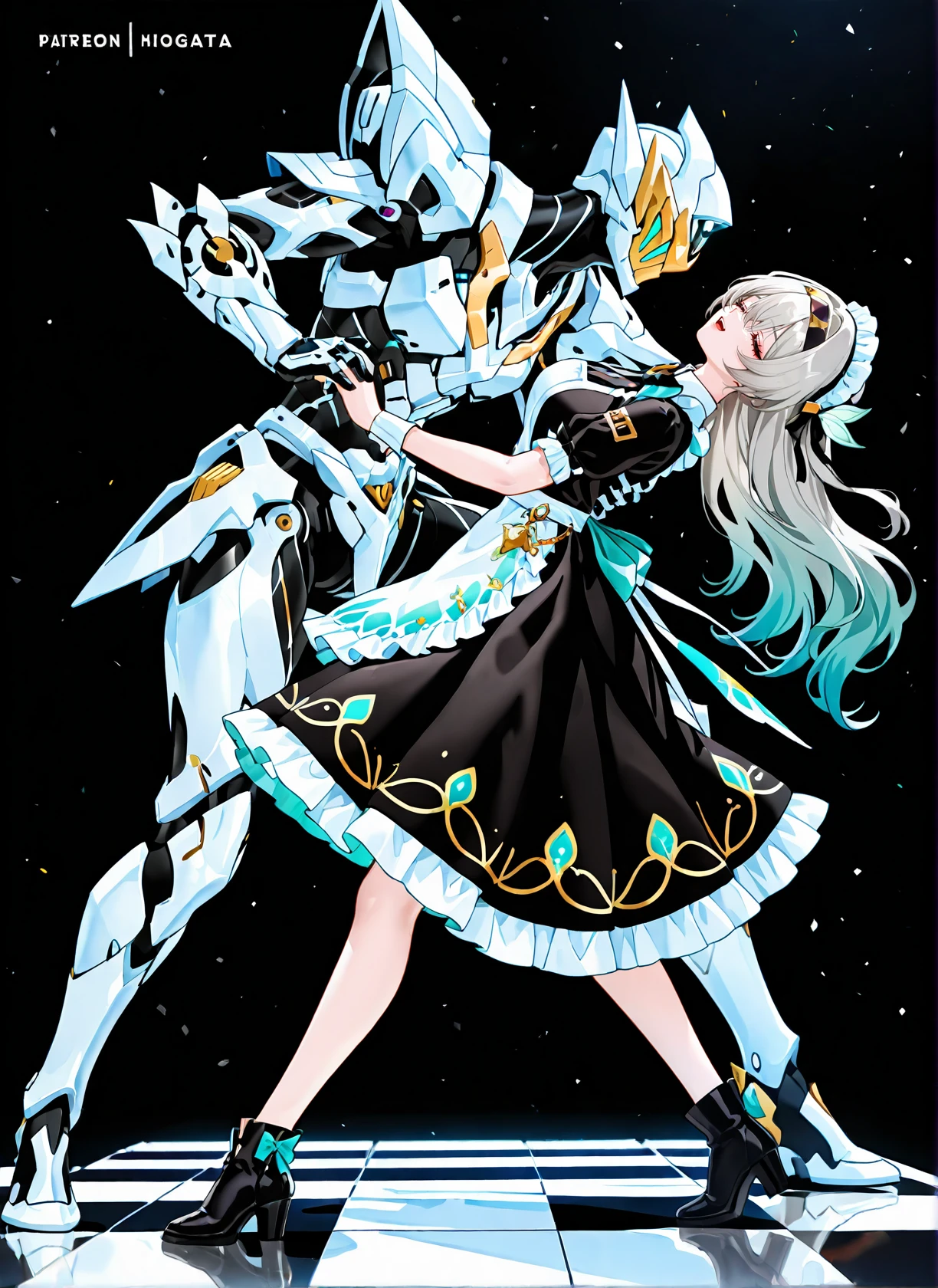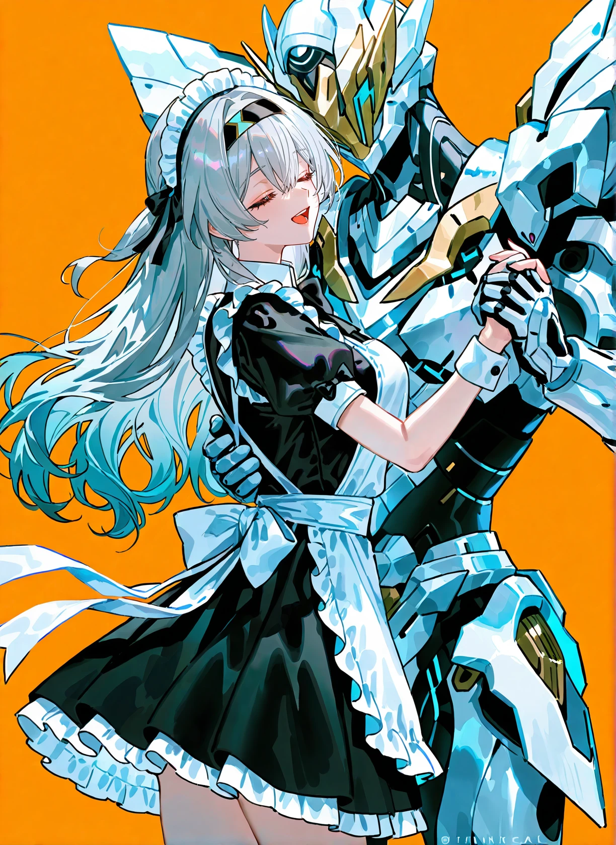 Firefly \(honkai: star rail\), Fireflymaid, clothes: Fireflymaid maid dress, 1girl, long hair, breasts, maid headdress, grey hair, blue eyes, white thighhighs, maid,