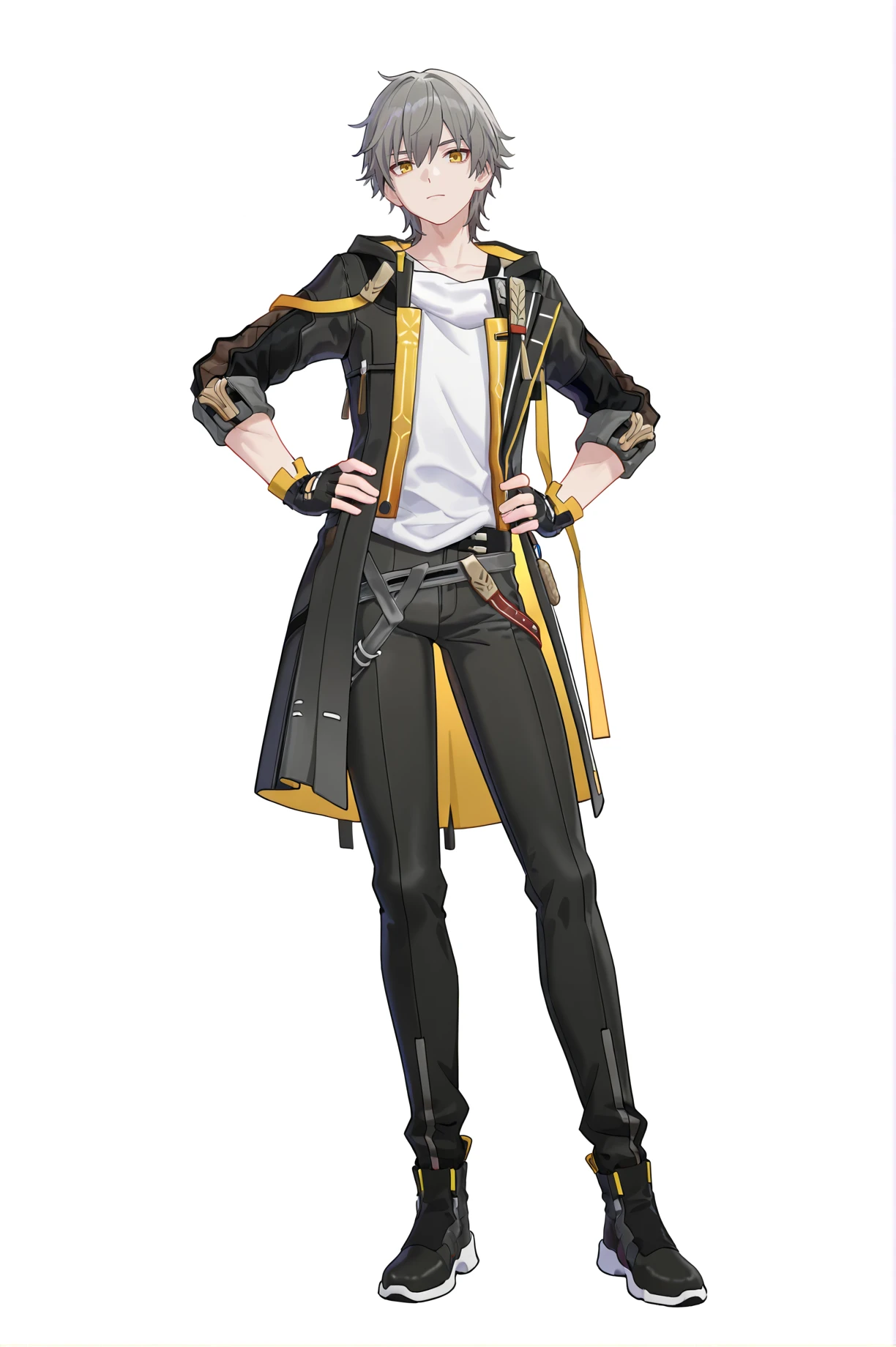caelus \(honkai: star rail\),clothes: caelusdef clothes,caelusdef open jacket,caelusdef white shirt,1boy,male focus,black fingerless gloves,grey hair,caelusdef black pants,yellow eyes,