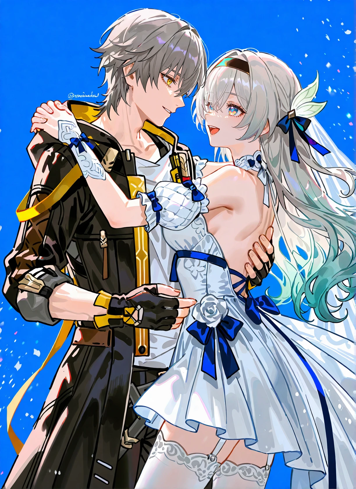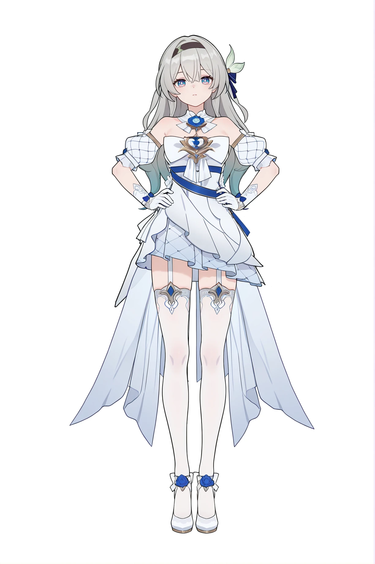 Firefly \(honkai: star rail\), Fireflywed, clothes: Fireflywed white wedding dress, 1girl, white gloves, long hair, Fireflywed white thighhighs, grey hair, bare shoulders,blue eyes, bangs
