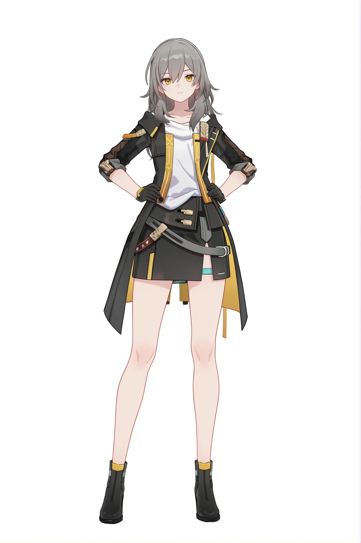 stelle \(honkai: star rail\), clothes: stelledef clothes, stelledef jacket, stelledef white shirt, 1girl, gloves, yellow eyes, grey hair, black gloves,stelledef black skirt, open clothes,