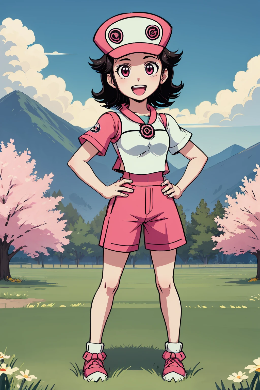 Prompt is "pinktrainer". For outfit "hat,short sleeves,shorts" and possibly "backpack". "Black Hair" and eye color is recommended if the model doesn't do it. "Monochrome" in the negative prompts is recommended as the original image was intended to mimic the Gameboy style.