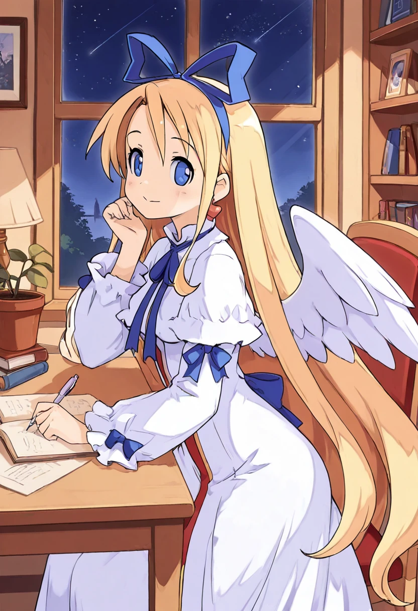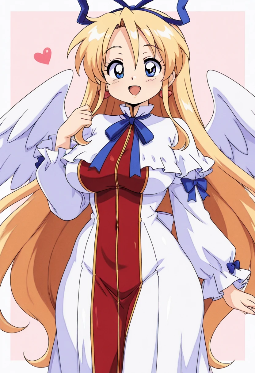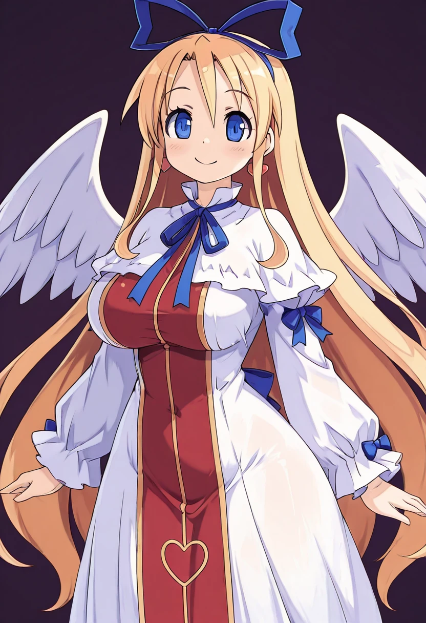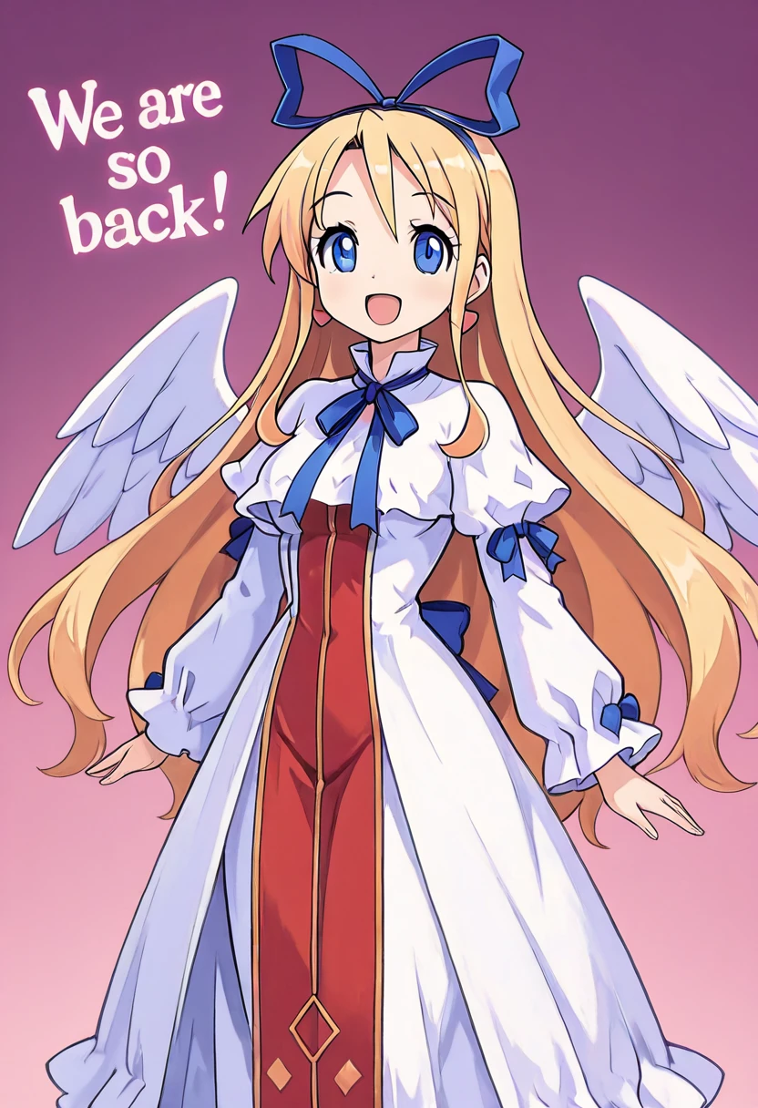 zzFlonne, blue eyes, blonde hair, long hair, angel wings, dress, long sleeves, heart earrings, blue ribbon, hair ribbon,