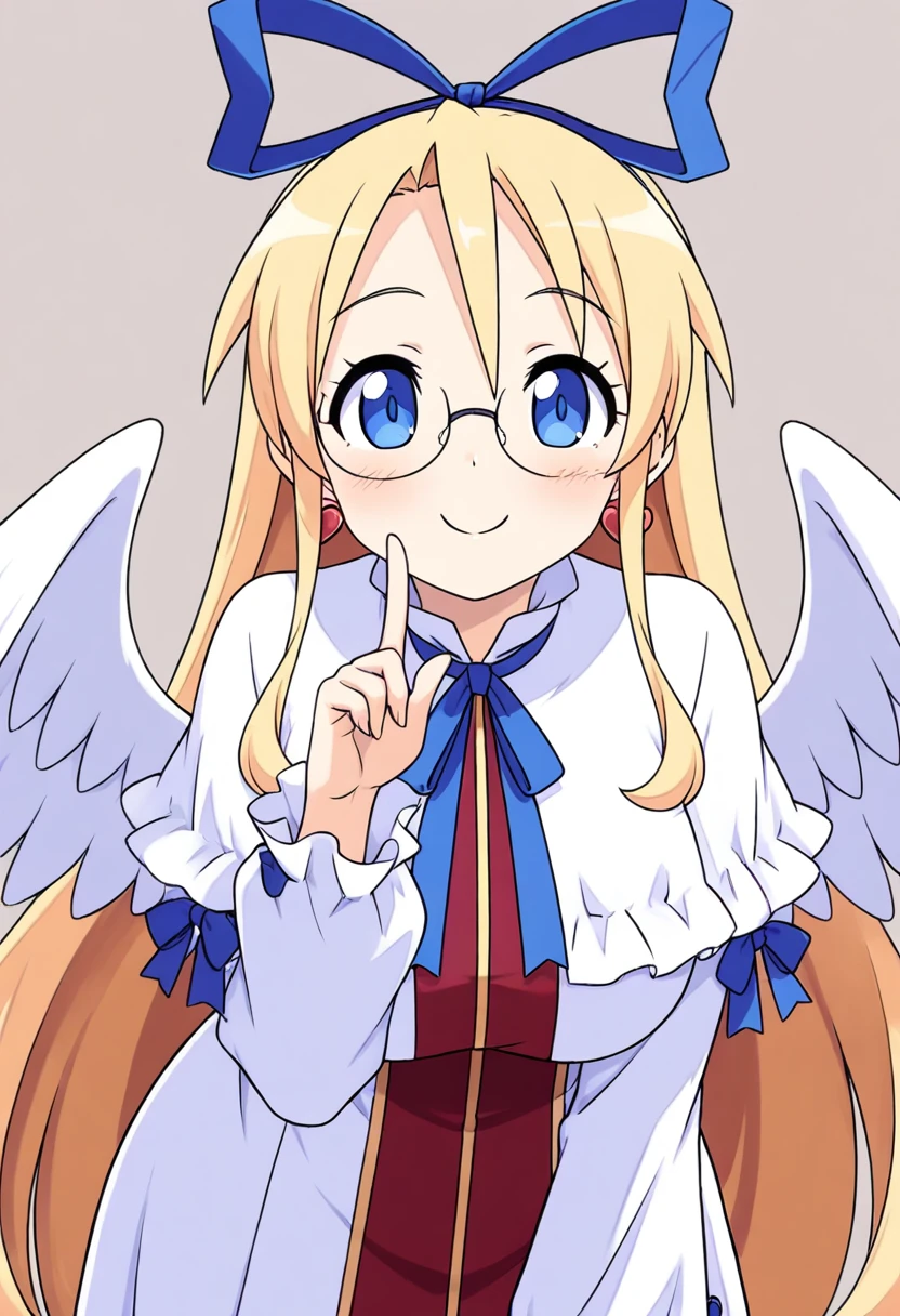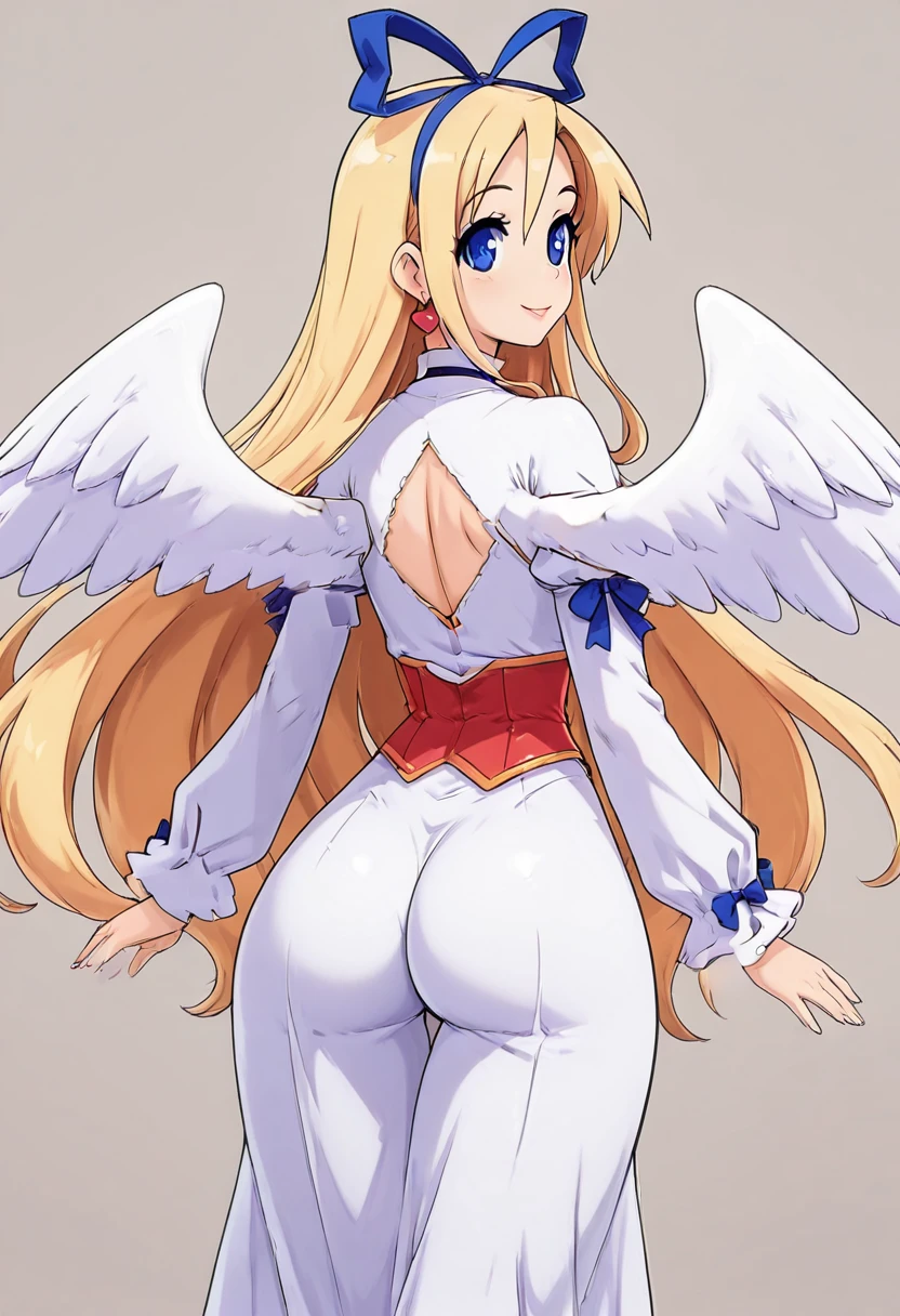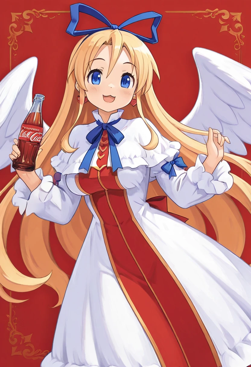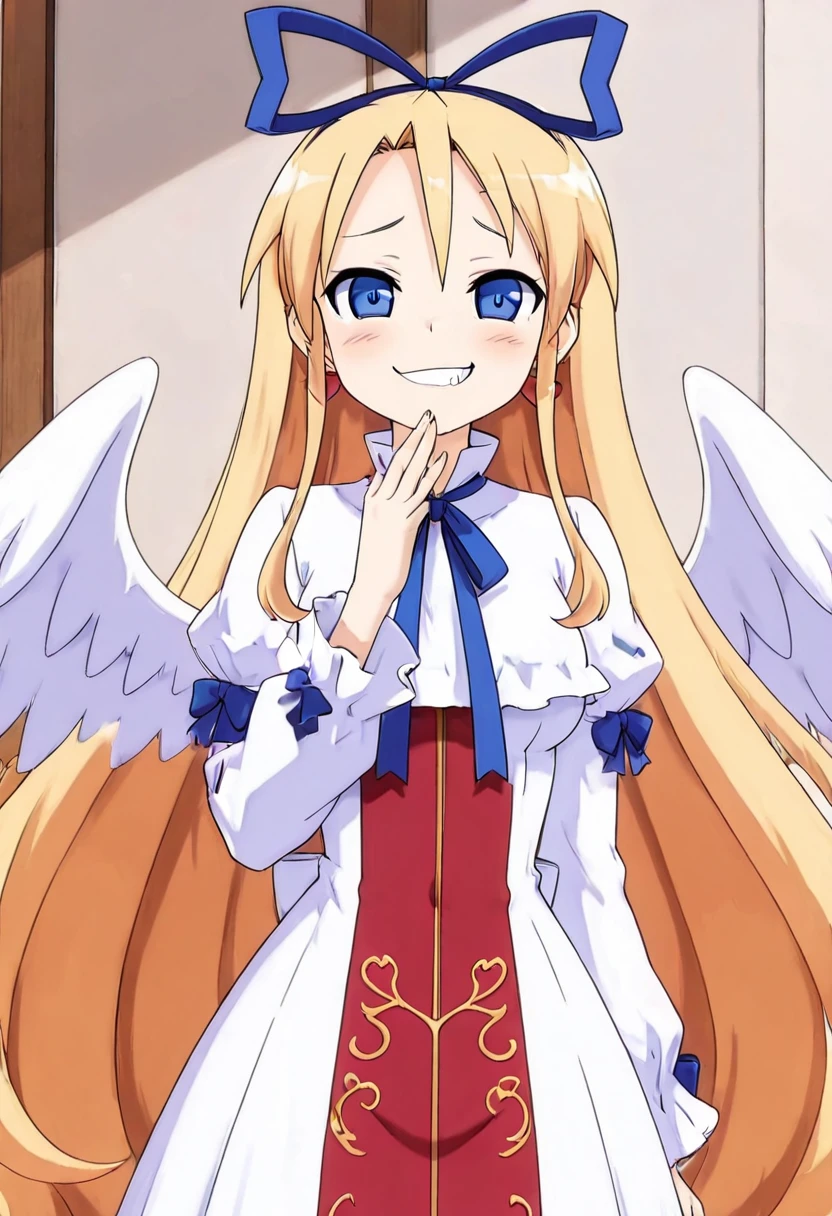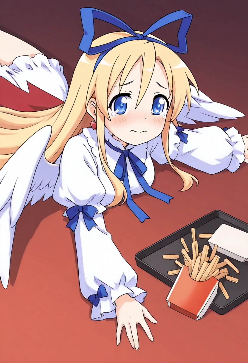 zzFlonne, blue eyes, blonde hair, long hair, angel wings, dress, long sleeves, heart earrings, blue ribbon, hair ribbon,