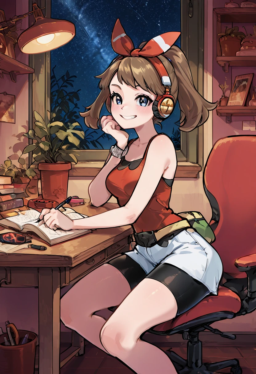 zzMayOras, blue eyes, brown hair, medium hair, red hairband, red shirt, bracelet, sleeveless shirt, bike shorts, white shorts, fanny pack,
