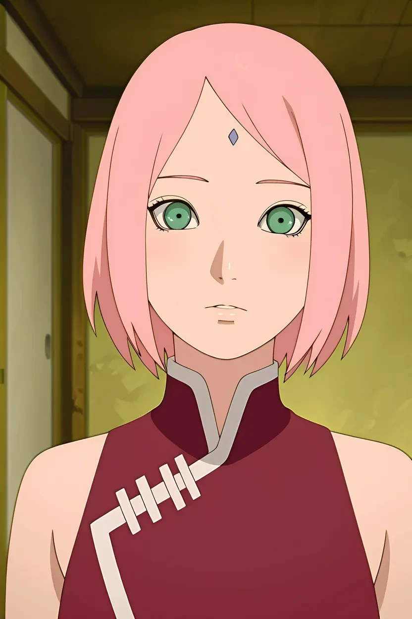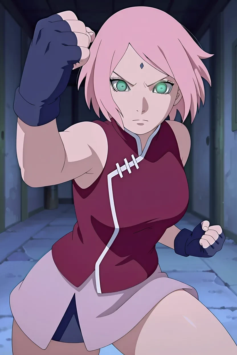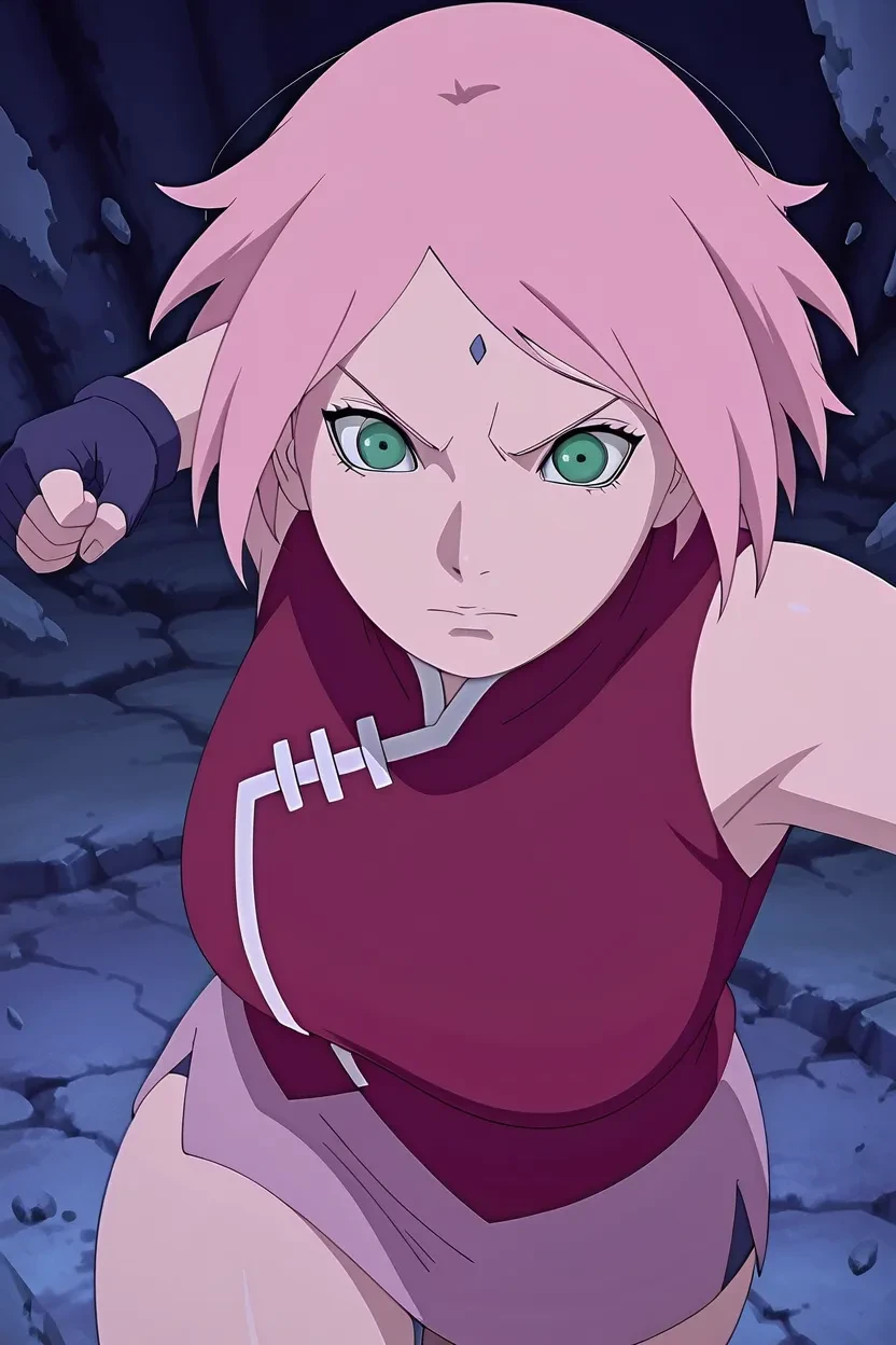 1girl, Sakura Uchiha (Naruto Shippuden), pink_hair, short hair, green_eyes, forehead mark, glossy lips, large breasts, curvy, sexy, wide hips, thick thighs, , fully , , , Naruto Shippuden_art_style, HD, High-res, excellent quality, no flaws