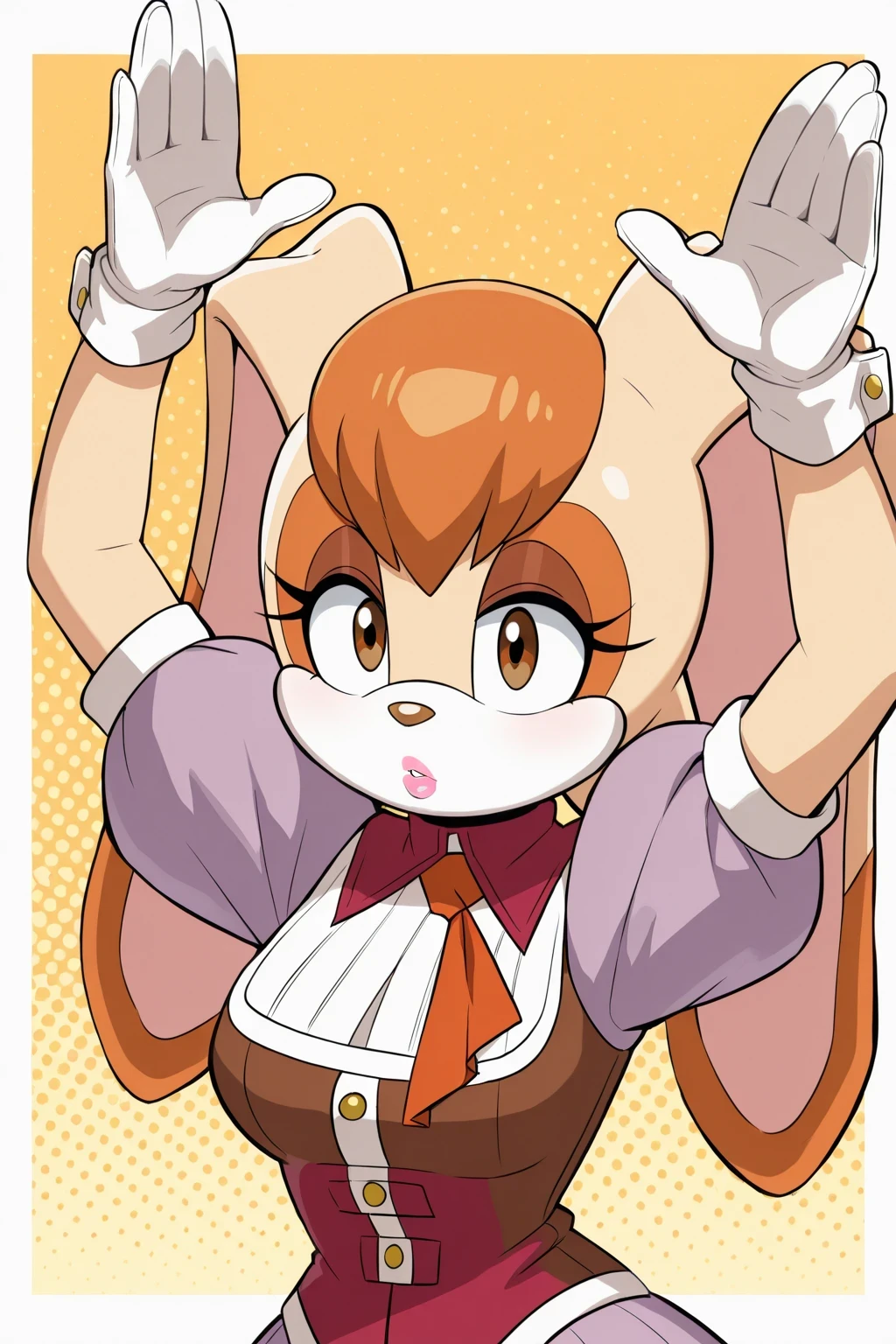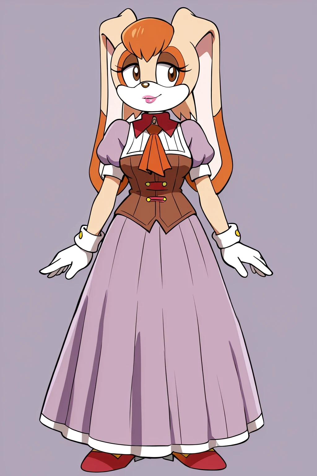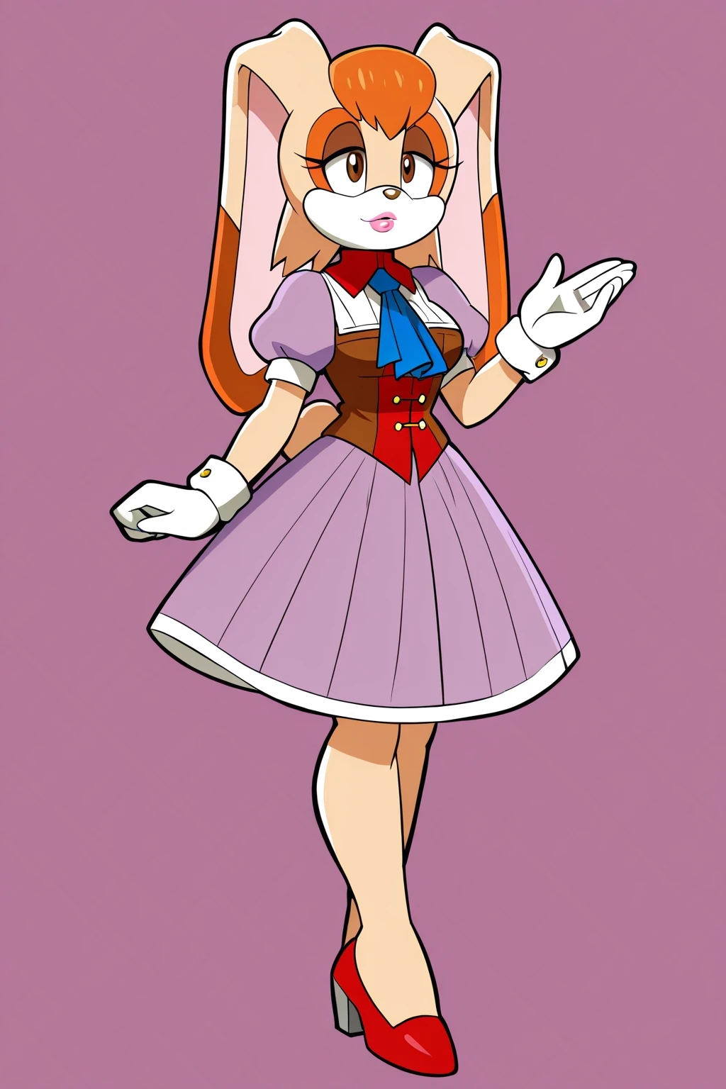 VanillaTheRabbitSX, beige fur, 1girl, light purple dress, white hemline, brown-maroon bodice, orange neck tie, long rabbit ears, orange hair, white gloves, red high-heeled shoes, brown eyes, brown nose, pink lips, lipstick, vanilla the rabbit,