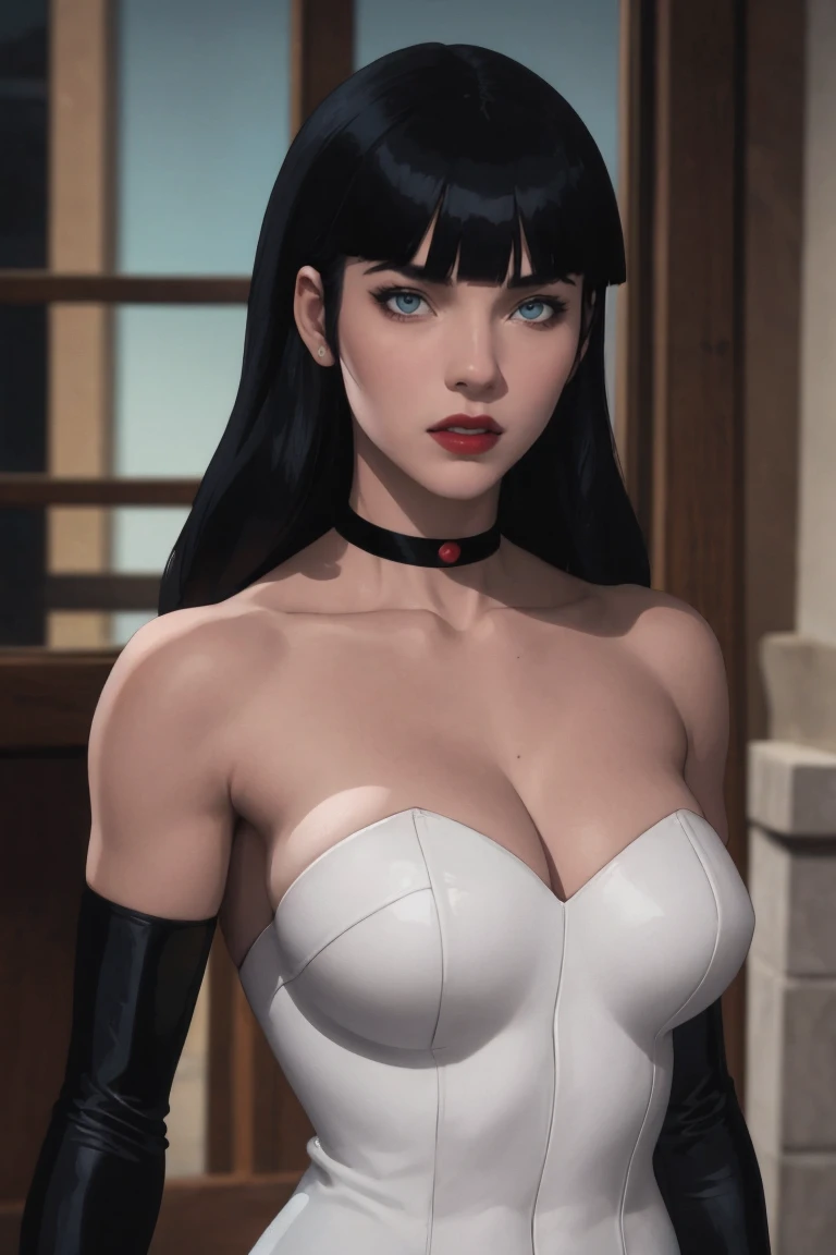 1girl, black hair, long hair, breasts, bangs, blunt bangs, blue eyes, lipstick, dress, makeup, large breasts, collarbone, hime cut, lips, black lips, white dress, toned, muscular,
