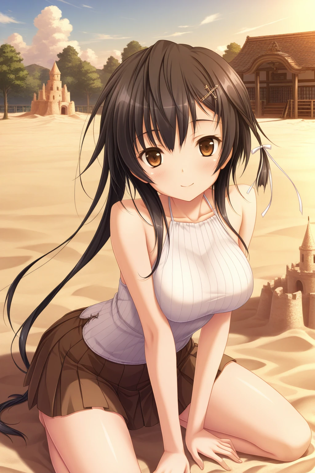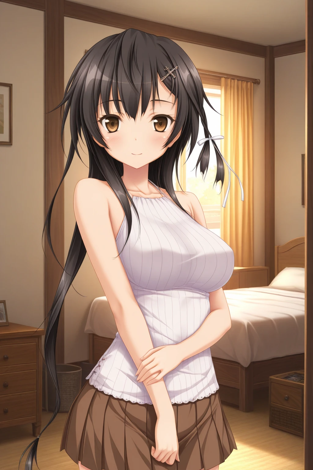aakyouko, brown eyes, black hair, long hair, white ribbon, ribbed shirt, white shirt, halterneck, sleeveless shirt, brown skirt, pleated skirt,Description