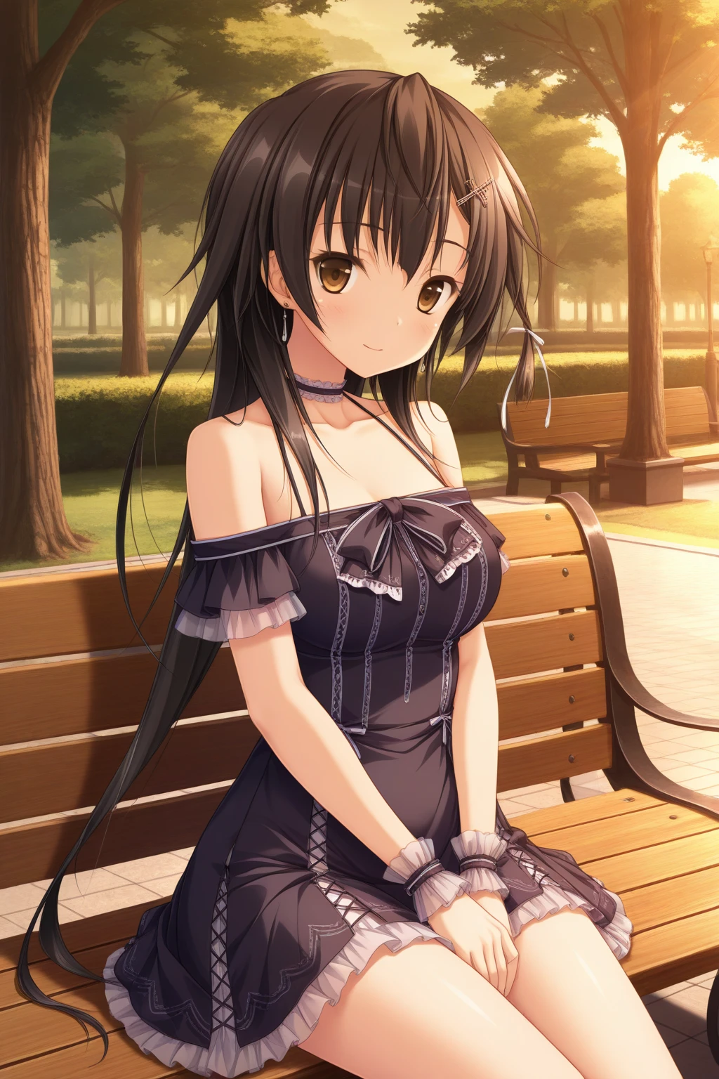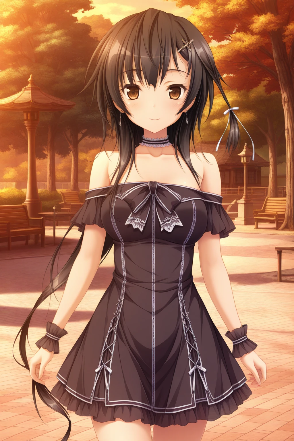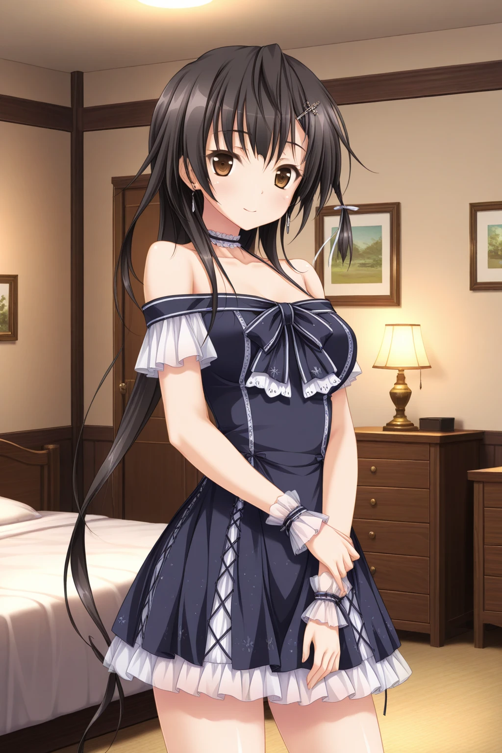 aakyouko, brown eyes, black hair, long hair, white ribbon, earrings, frilled choker, bare shoulders, wrist cuffs, dress, black dress,