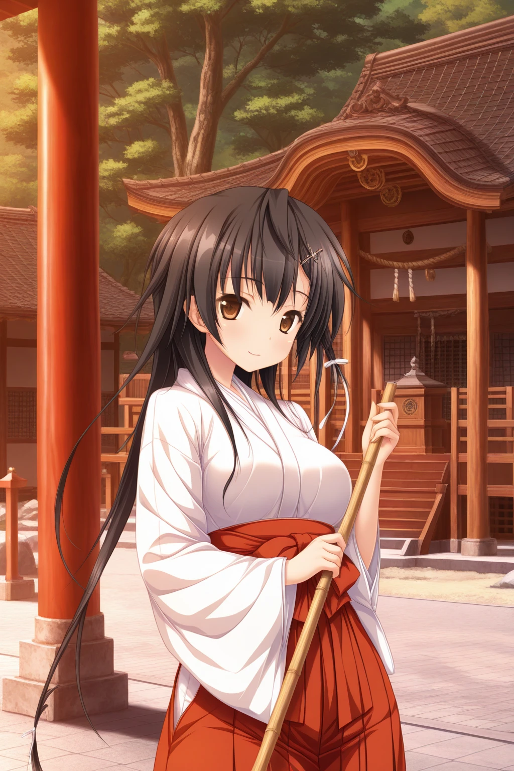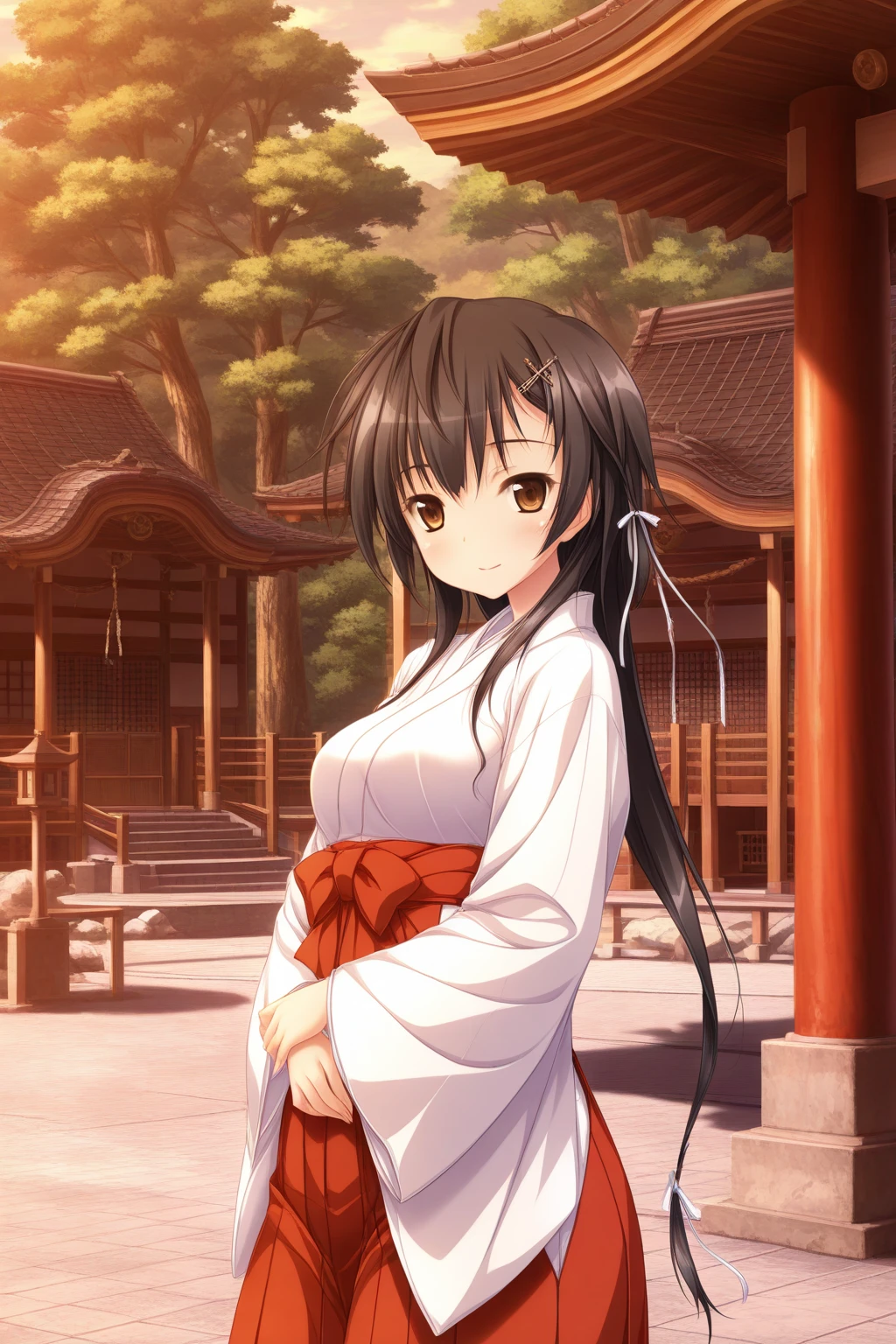 aakyouko, brown eyes, black hair, long hair, white ribbon, miko, japanese clothes, long sleeves, wide sleeves, red hakama, hakama skirt,