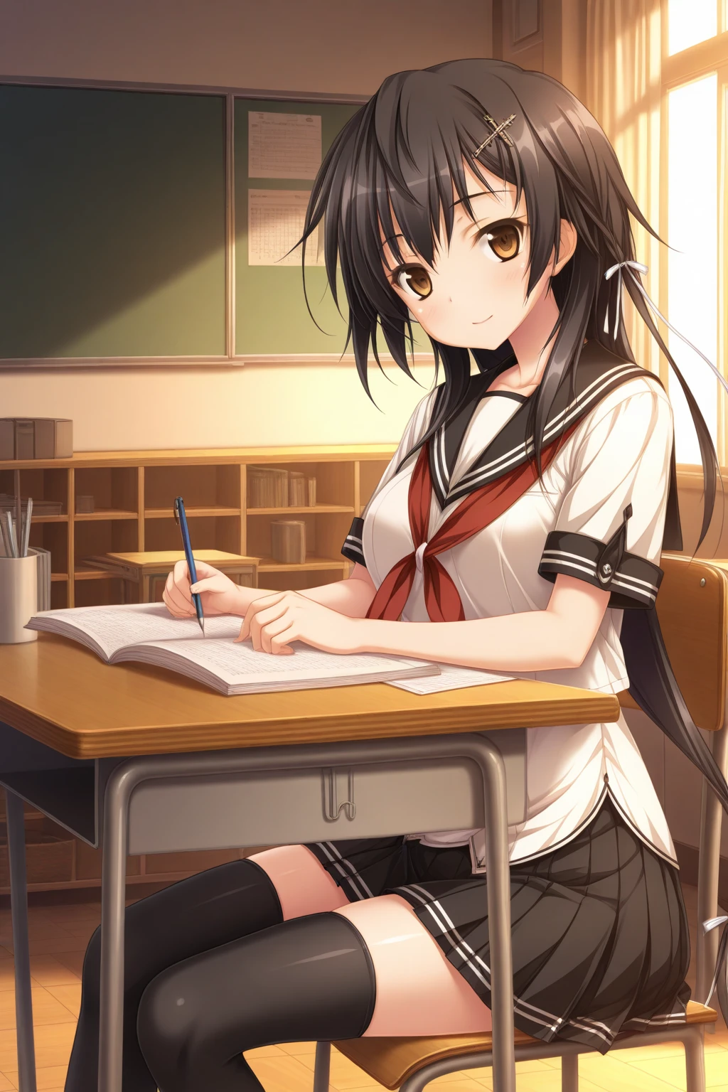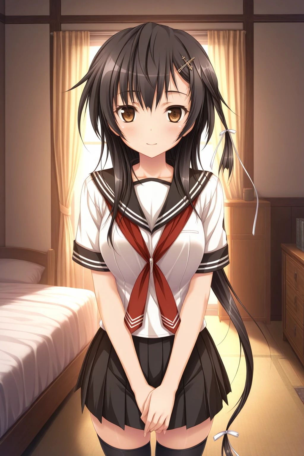aakyouko, brown eyes, black hair, long hair, white ribbon, school uniform, serafuku, sailor collar, neckerchief, black skirt, pleated skirt, black thighhighs,