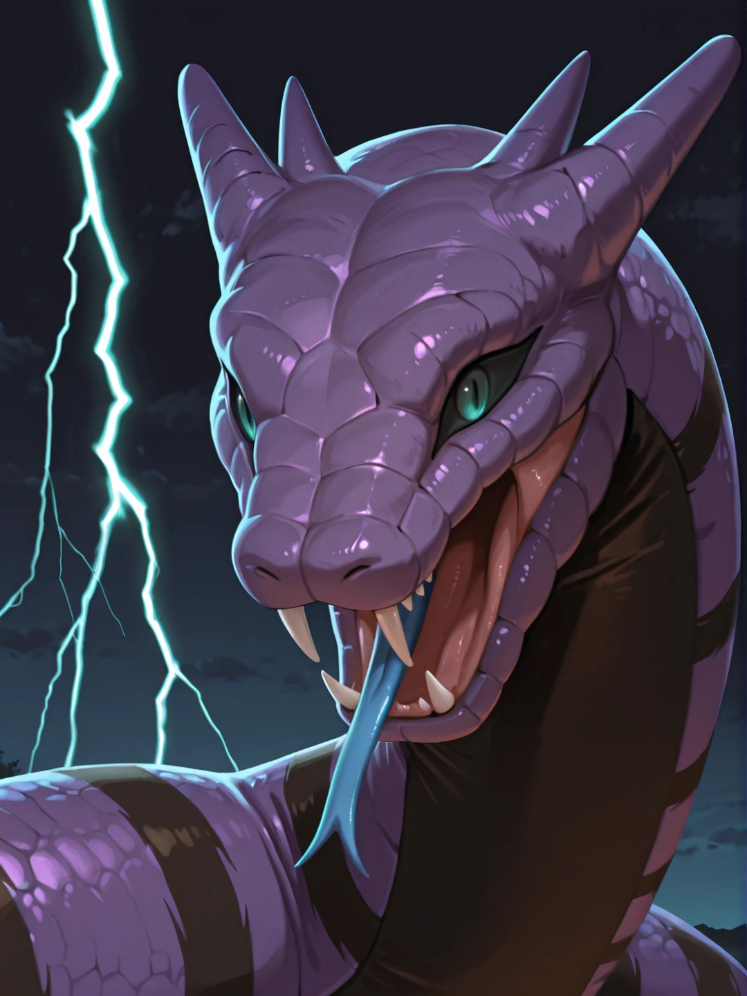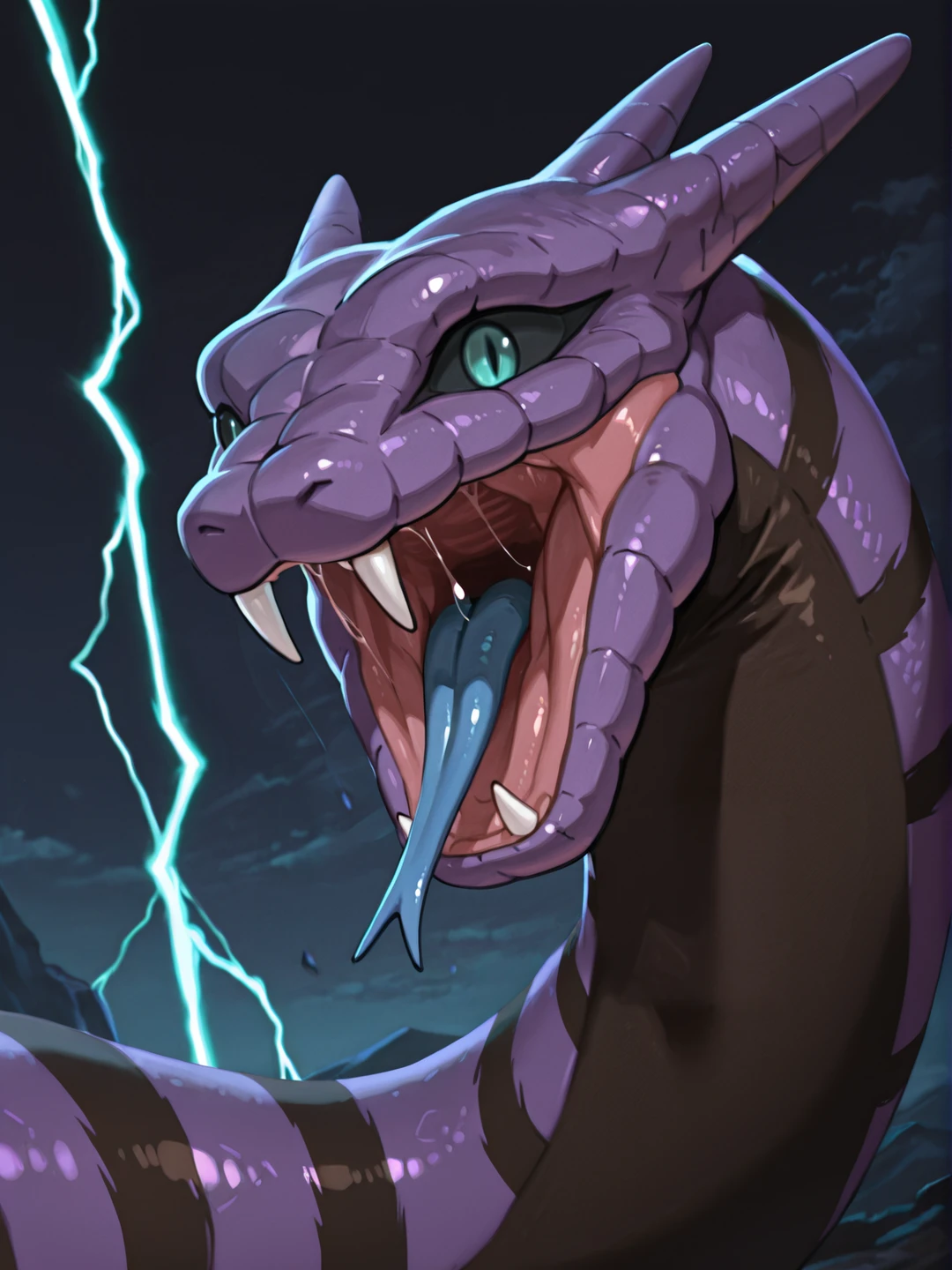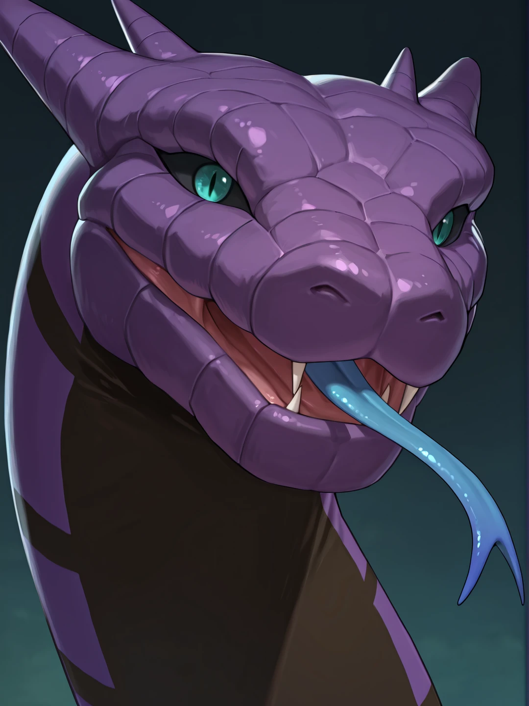 open mouth, fangs, sharp teeth, blue forked tongue,