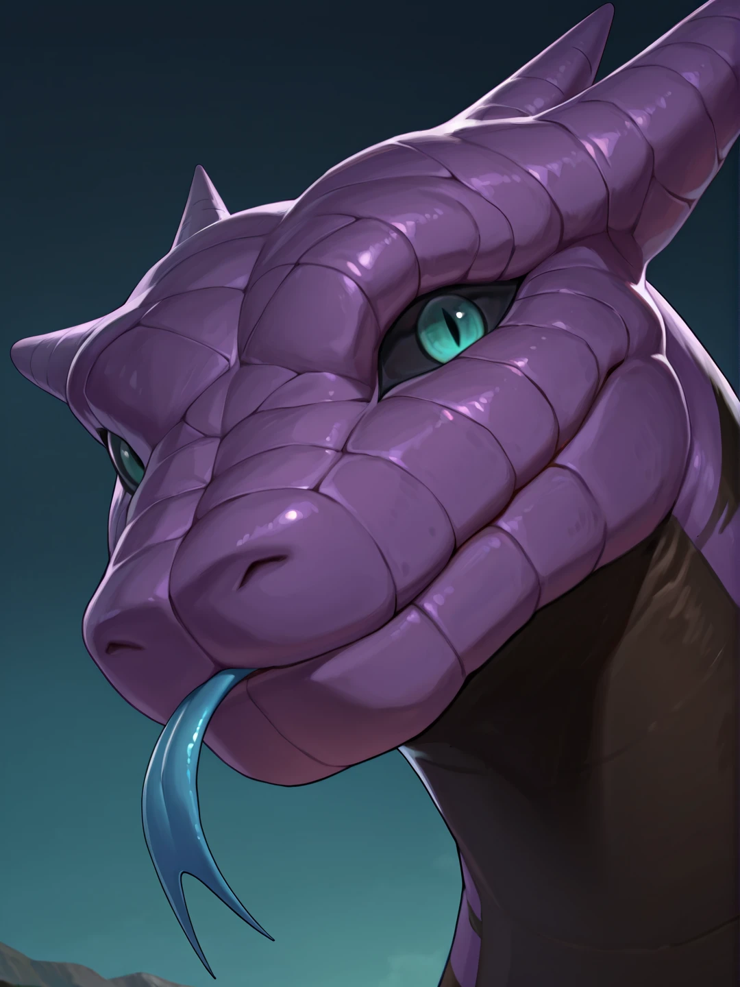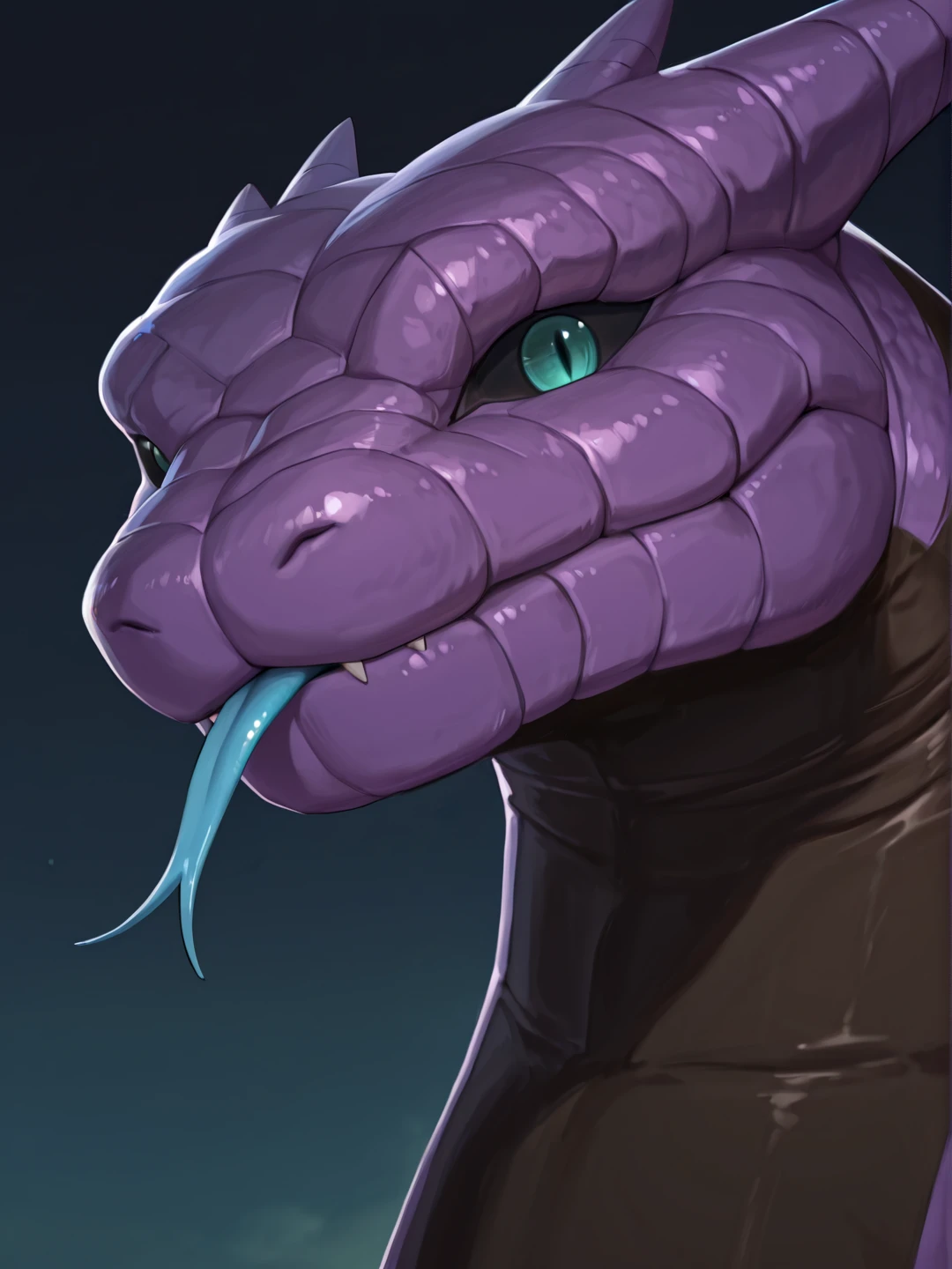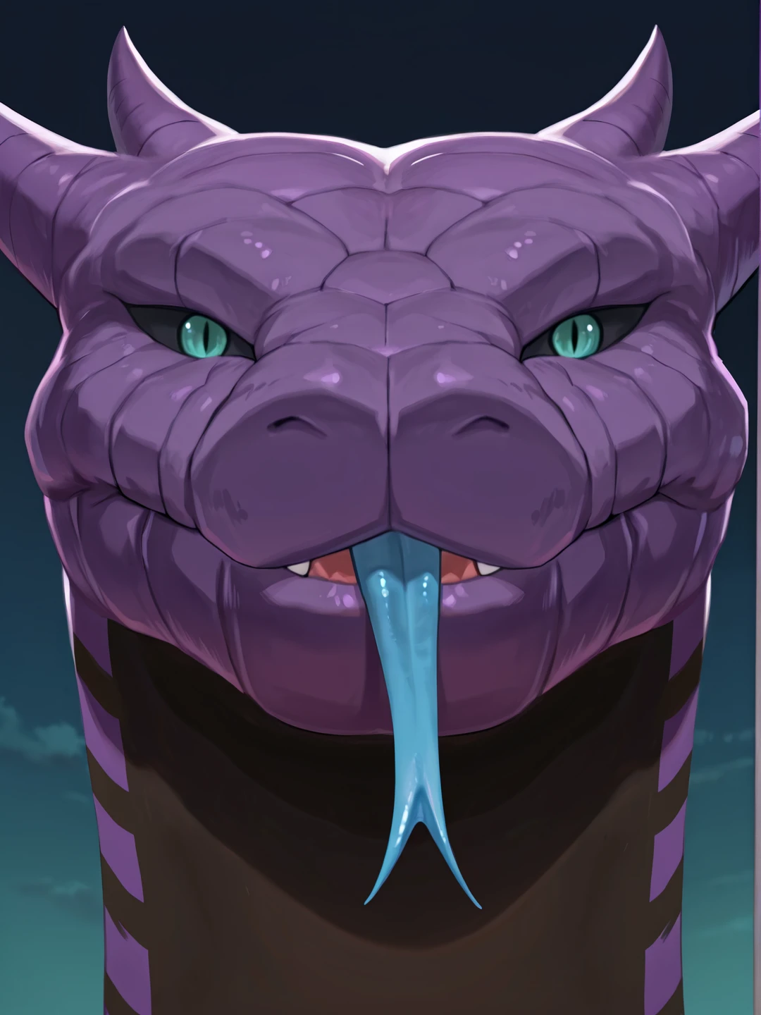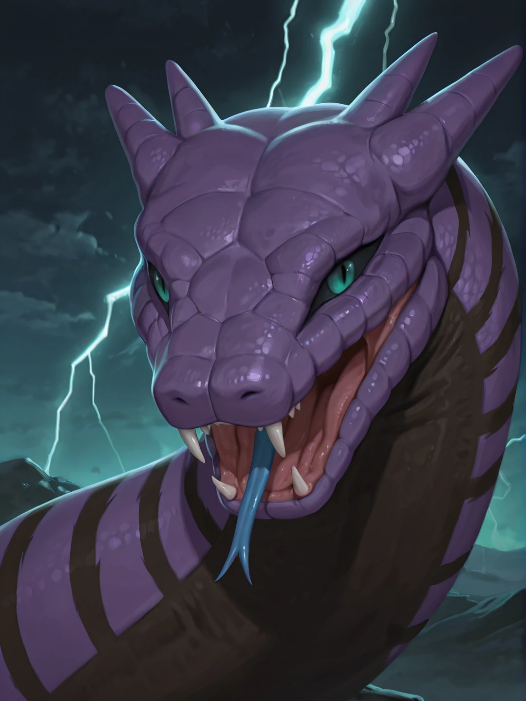 m4nd4sn4k3, male, teal eyes, black sclera, slit pupils, purple scales, black scales, two-tone skin, striped skin, purple horns, low hornsOTHER TRIGGERS: