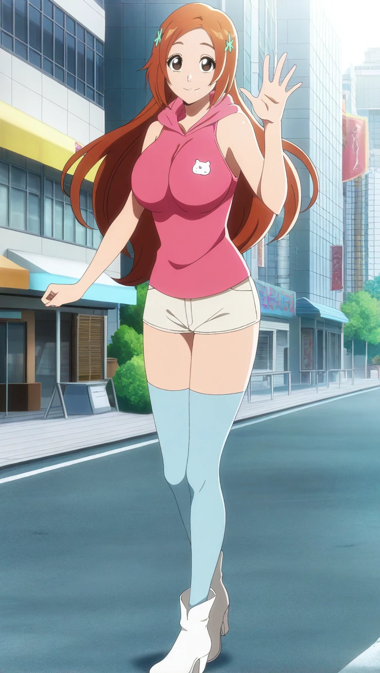 part 1 outfit, breasts, large breasts, shirt, thighhighs, shorts, sleeveless, hood, short shorts, sleeveless shirt, hoodie, blue thighhighs, pink hoodie, white boots, ankle boots, heels,
