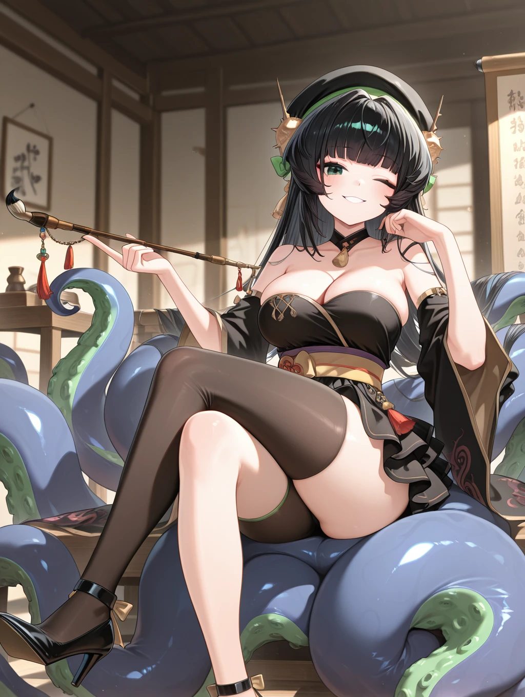 ara, 1girl, solo, long hair, medium breasts, black hair, hat, dress, cleavage, bare shoulders, green eyes, pantyhose, detached sleeves, black footwear, high heels, black headwear, beret, tentacles, asymmetrical legwear, paintbrush, kiseru,, suction cups,