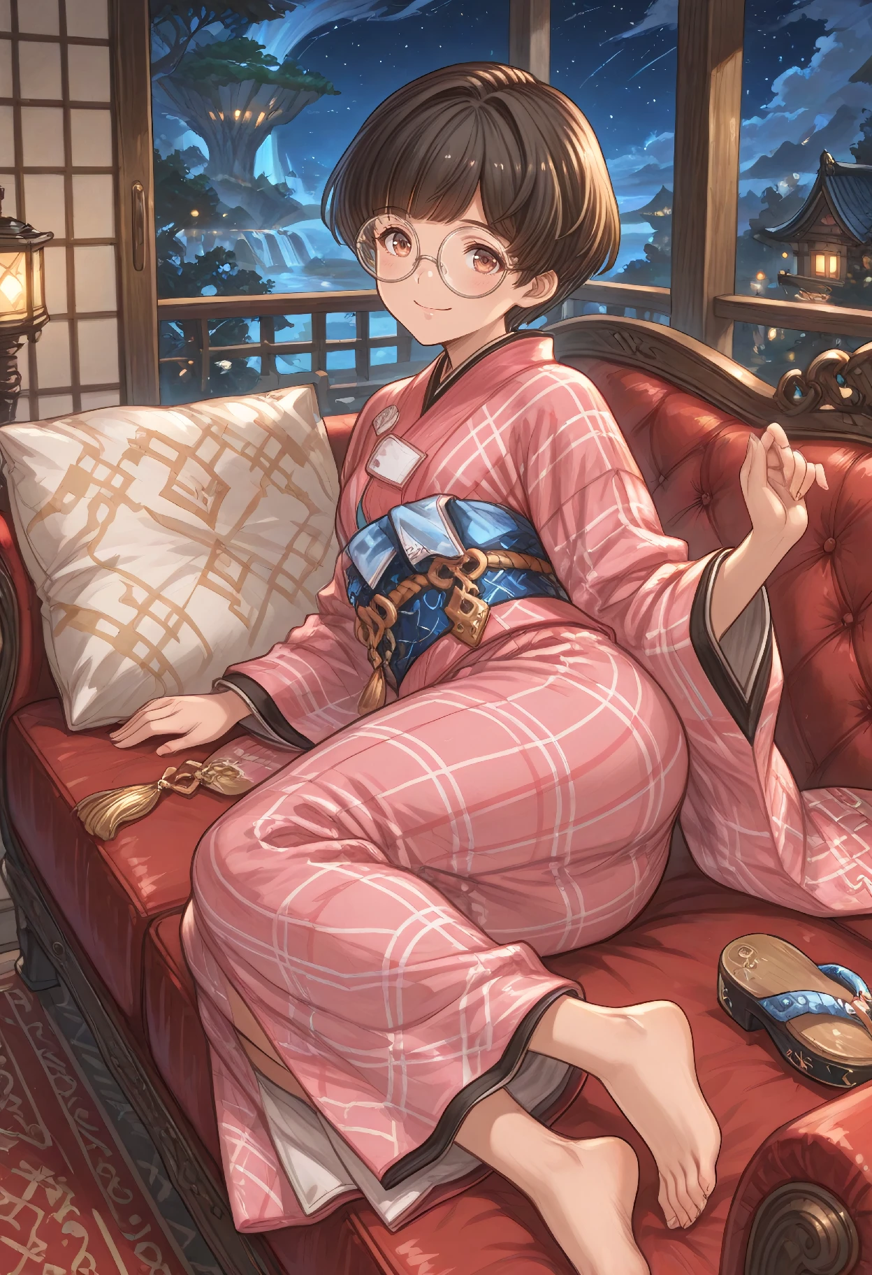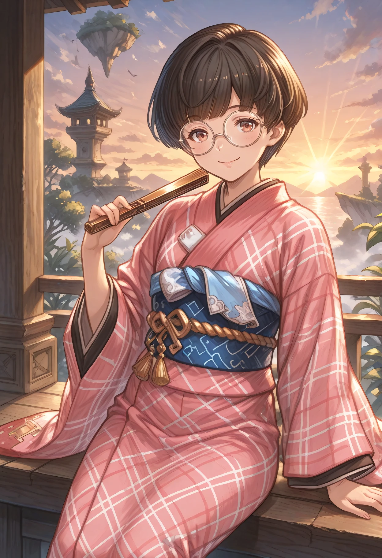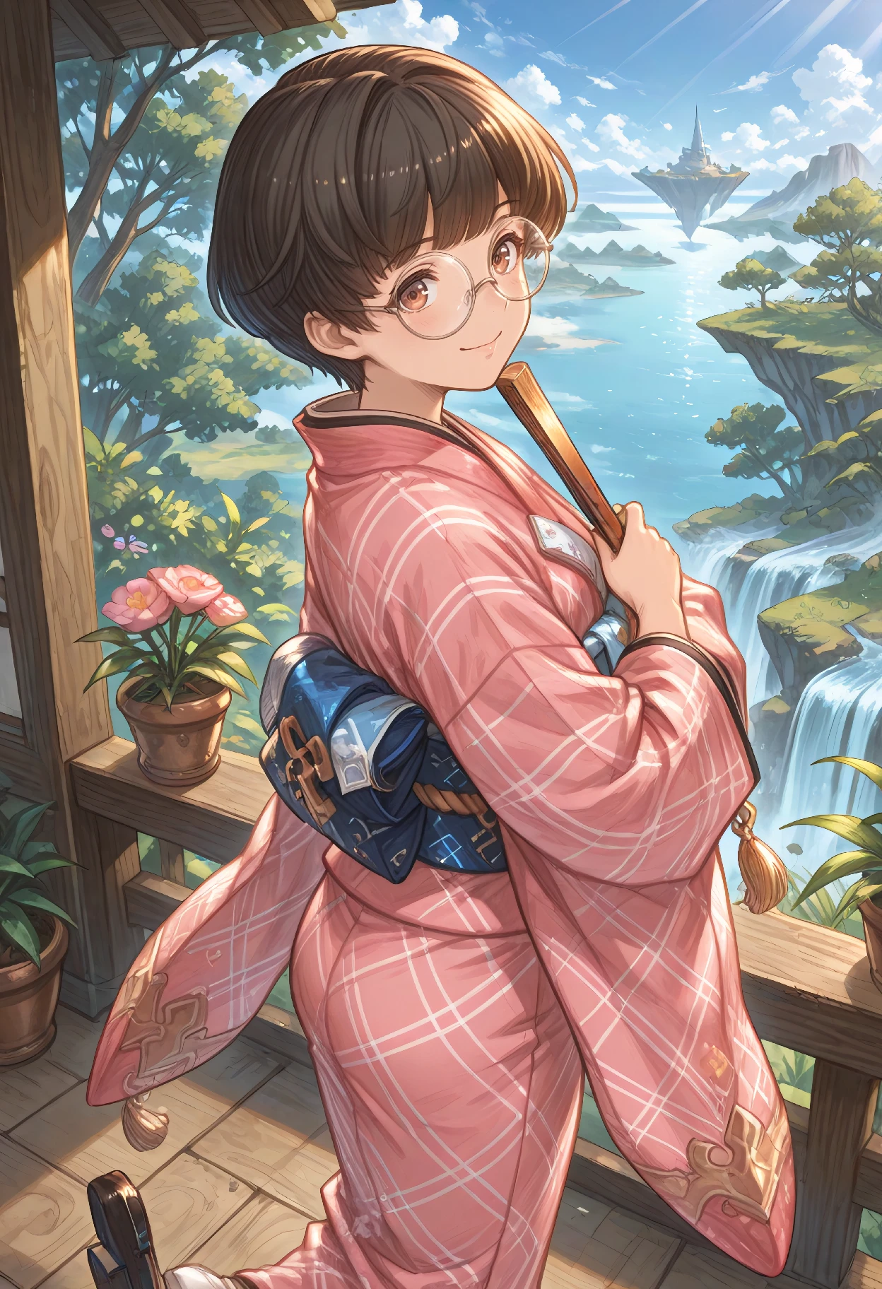 RakkoBase (Granblue Fantasy), black hair, brown hair, short hair, blunt bangs, brown eyes, glasses, round eyewear, japanese clothes, kimono, pink kimono, yukata, long sleeves, wide sleeves, sash, blue sash, obi, tassel, pom pom (clothes), white socks, tabi, sandals, zouri, geta,