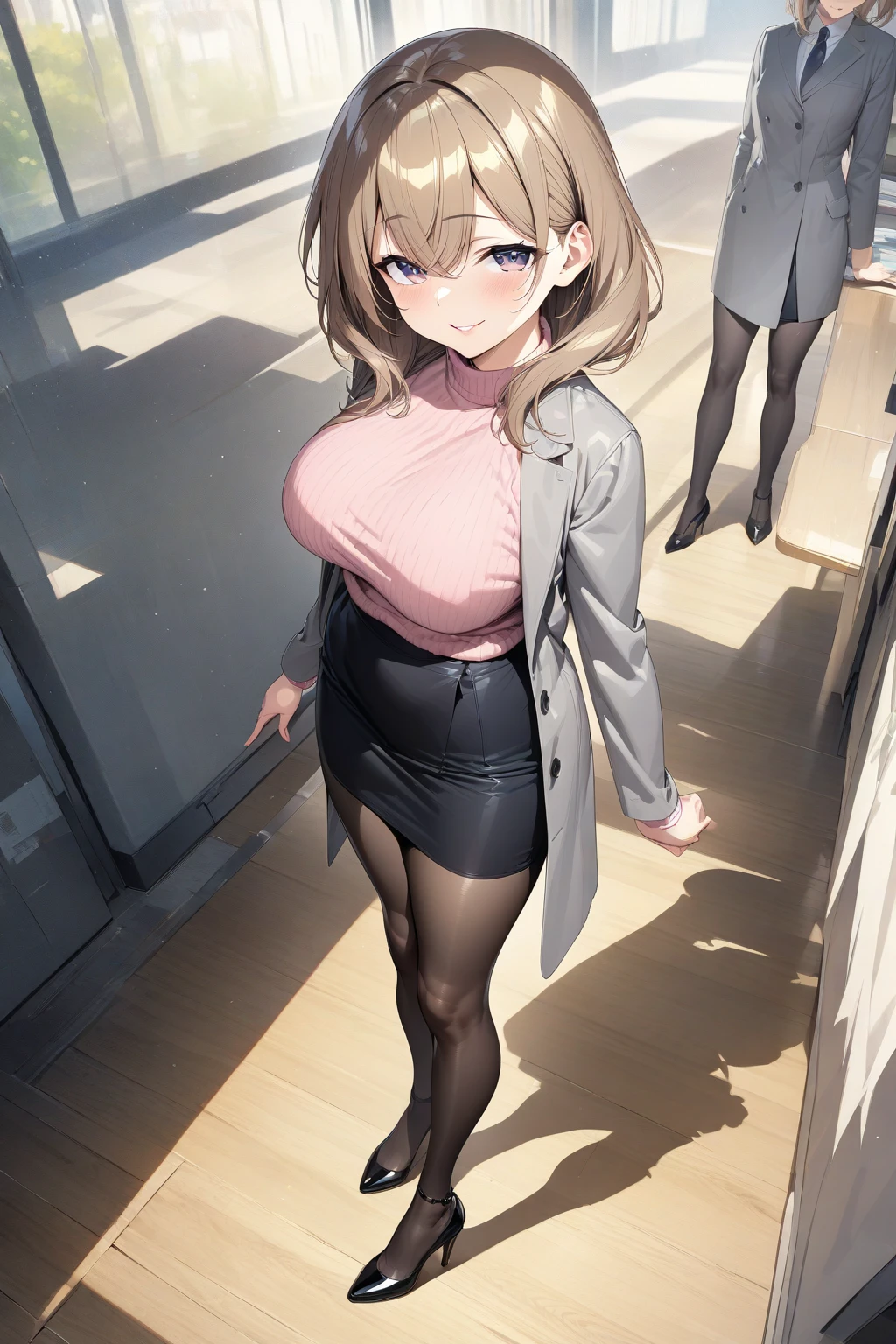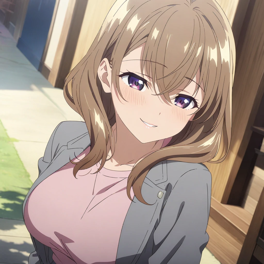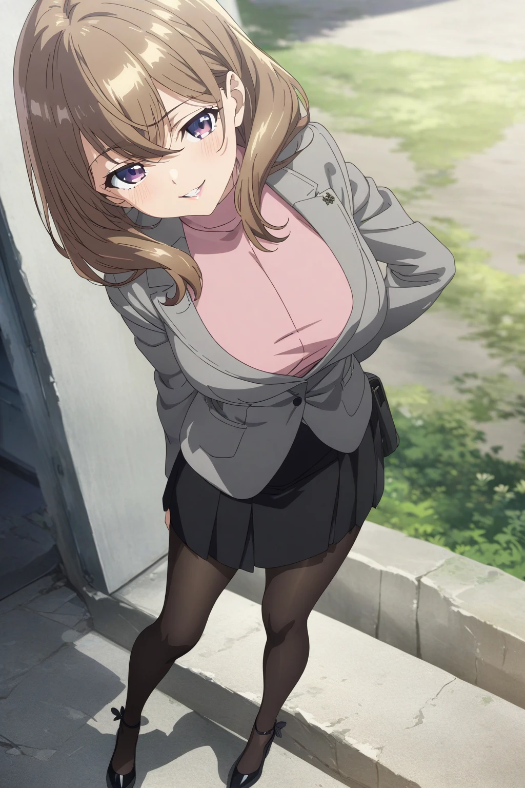 Activate using "senpai, brown hair, purple eyes, large breasts,", Outfit tag of "pink sweater, gray jacket, black skirt, black pantyhose, black heels," But seriously, do you guys really need a tag of her outfit, its literally everyday clothes, with everyday adjustment, sometimes, she doesnt wear the pantyhose, sometimes she does, the sweater changes to blue sometimes. I'm pretty sure you know how to tag it.