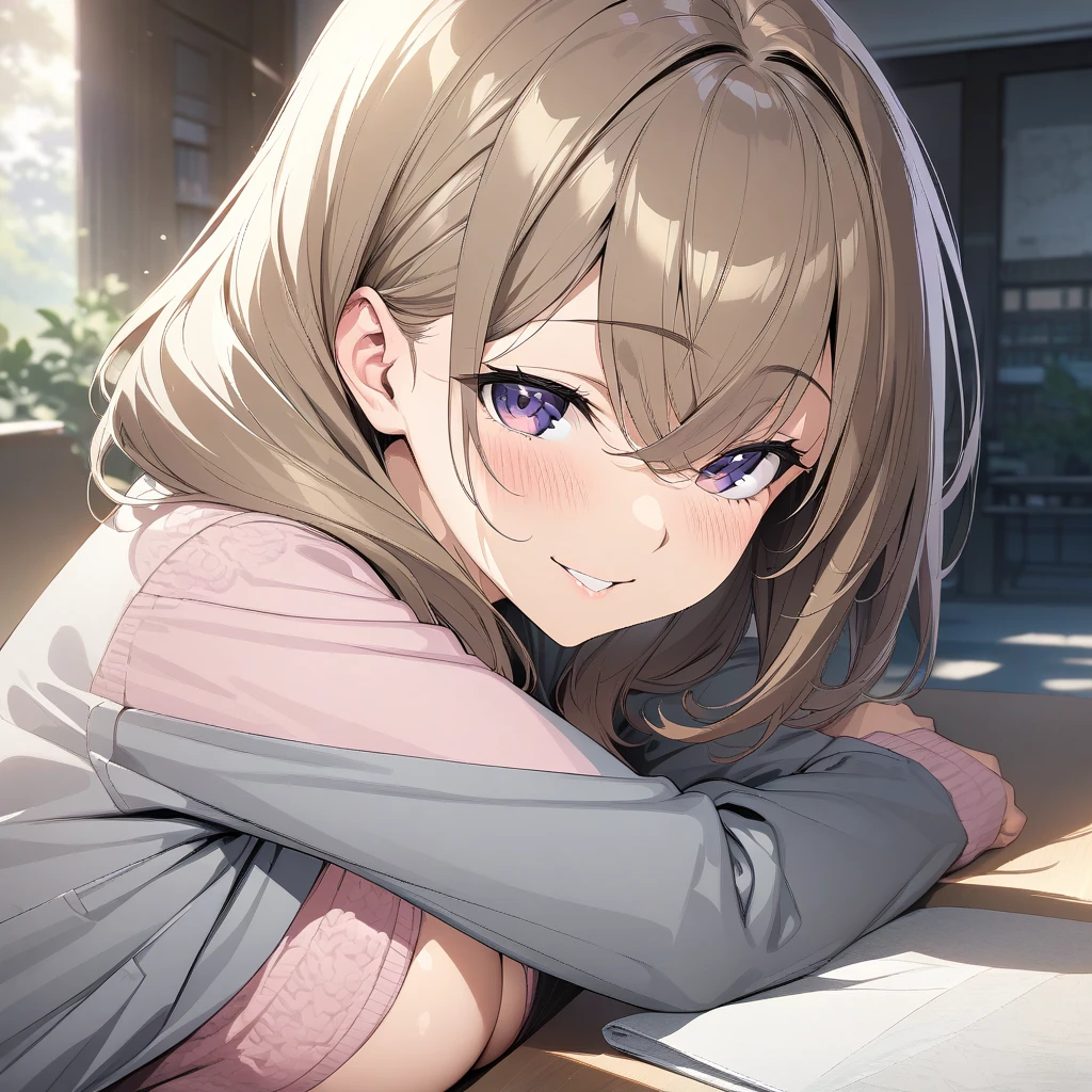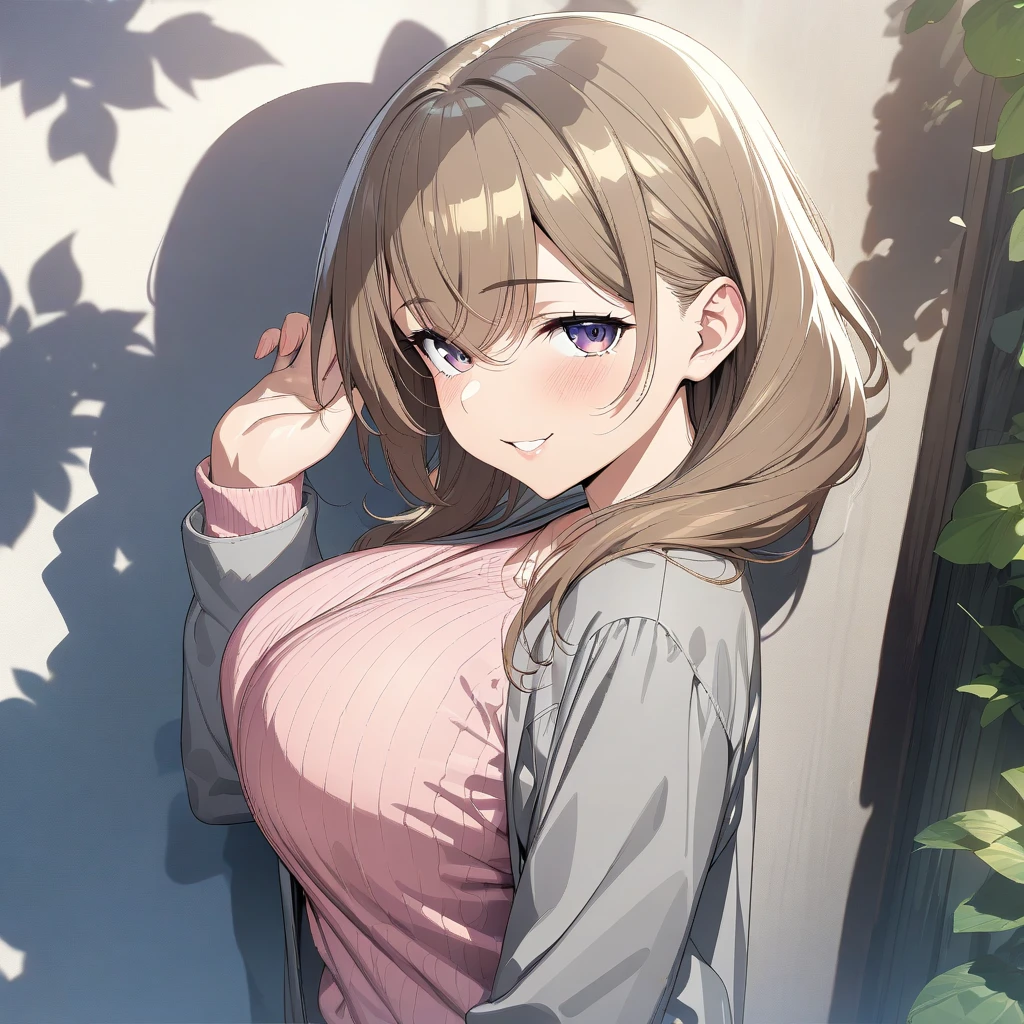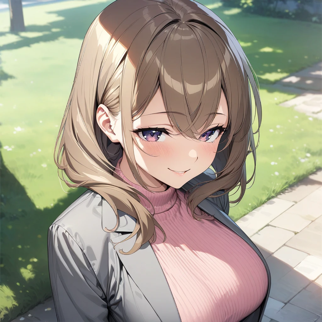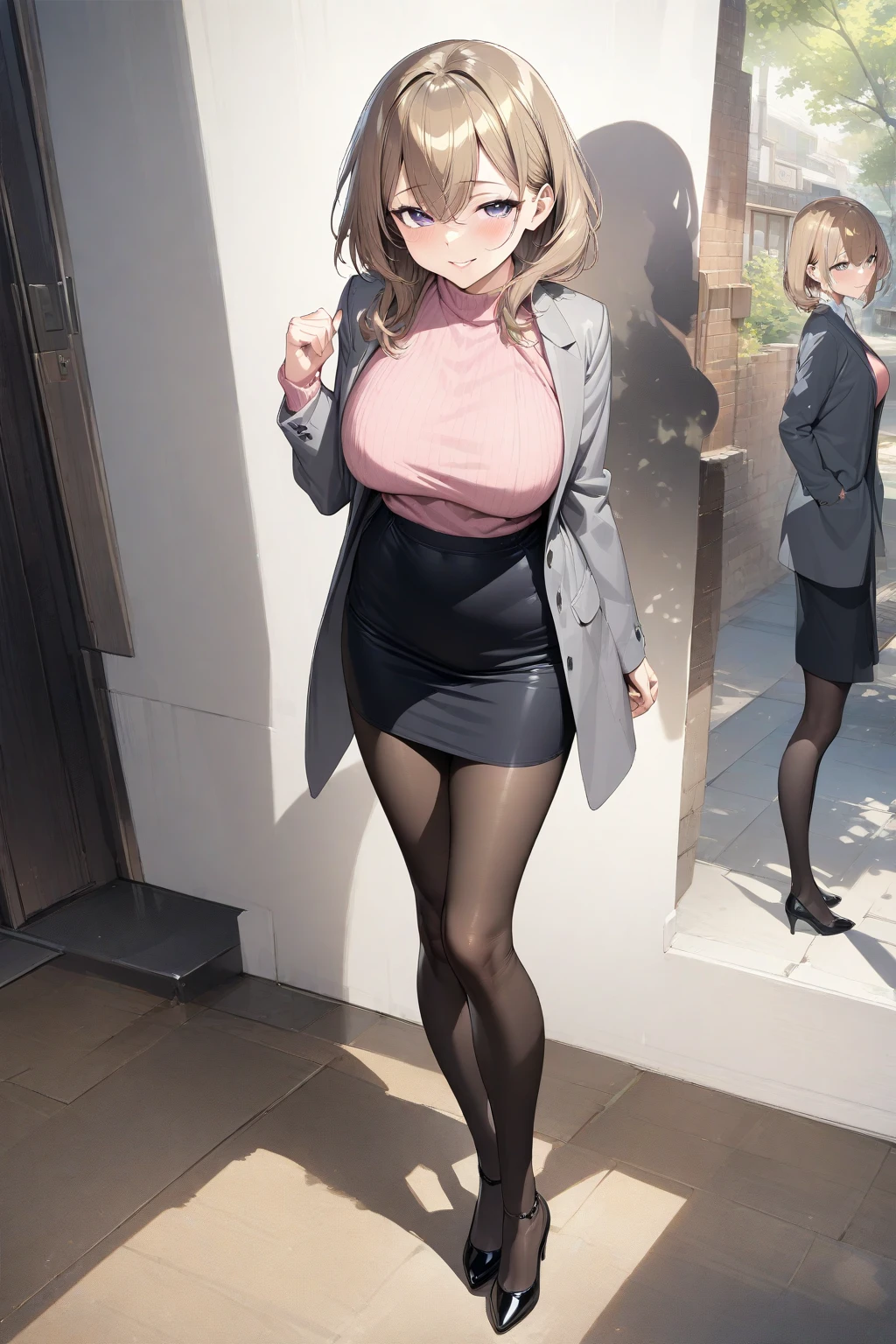 Activate using "senpai, brown hair, purple eyes, large breasts,", Outfit tag of "pink sweater, gray jacket, black skirt, black pantyhose, black heels," But seriously, do you guys really need a tag of her outfit, its literally everyday clothes, with everyday adjustment, sometimes, she doesnt wear the pantyhose, sometimes she does, the sweater changes to blue sometimes. I'm pretty sure you know how to tag it.
