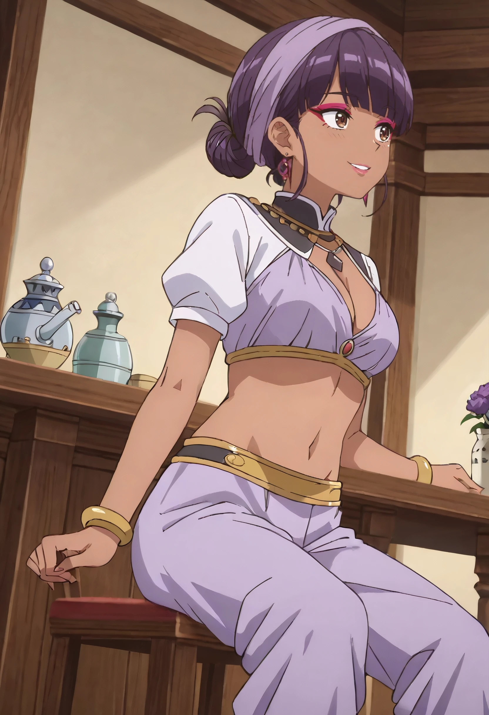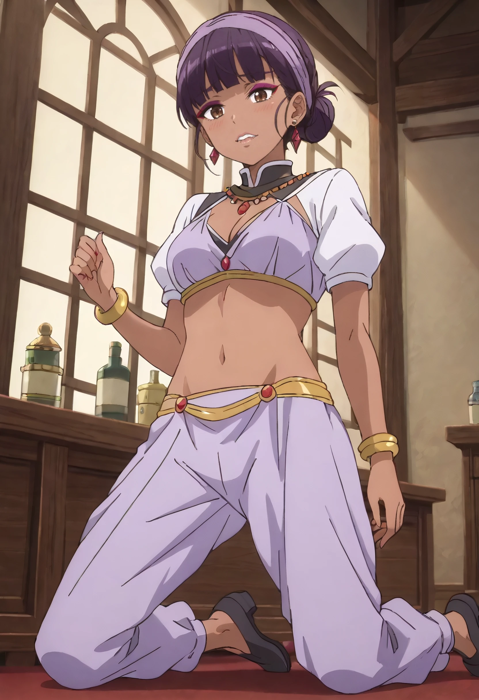 MerchantOutfit, jewelry, bandana, pants, short sleeves, purple pants, cleavage, midriff, earrings, bracelet, crop top, hairband, necklace, headband, puffy pants, puffy sleeves, baggy pants,