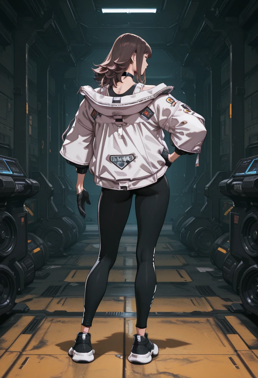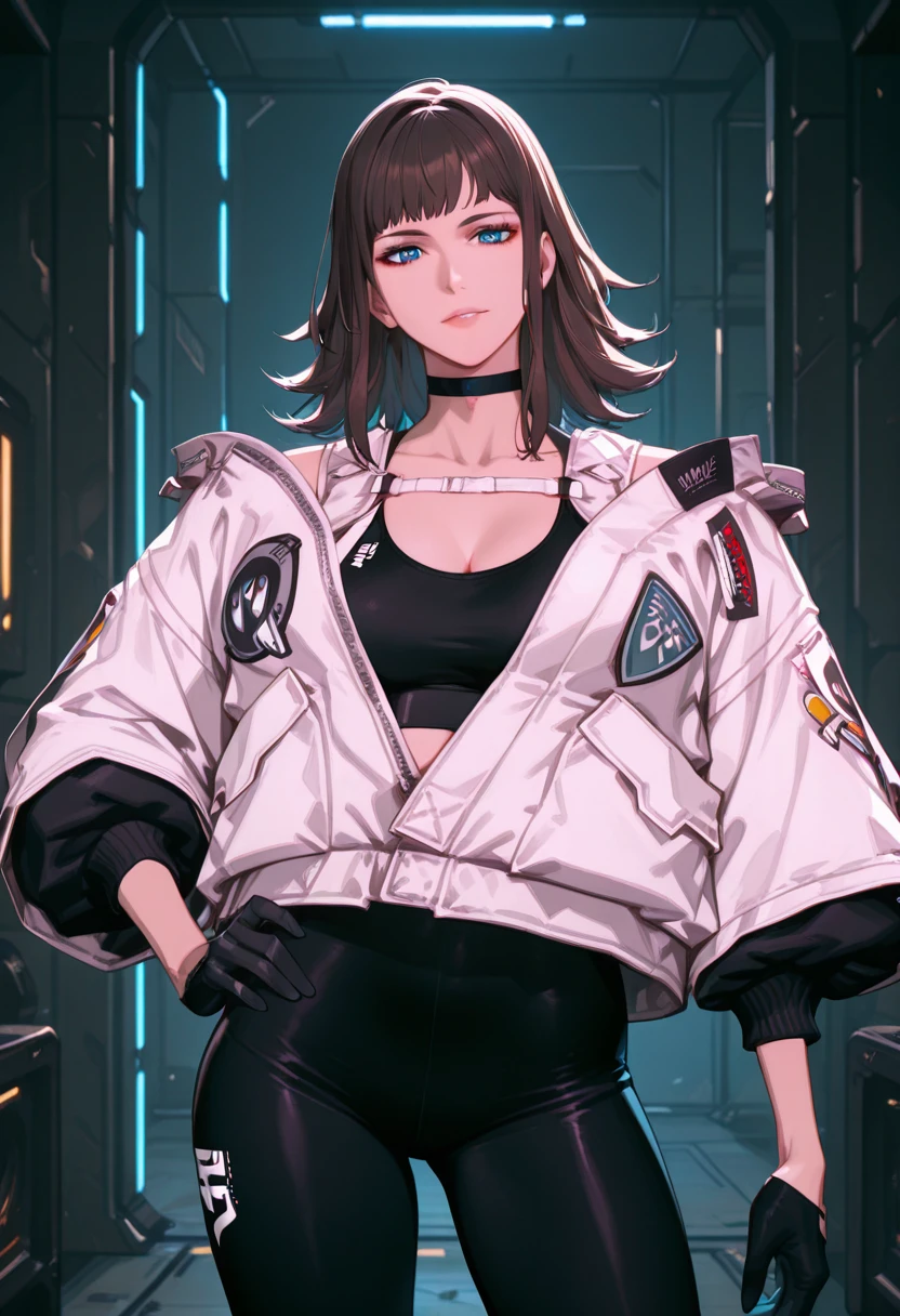 black choker, black cropped tank top, white jacket, black leggings, black gloves, sneakers