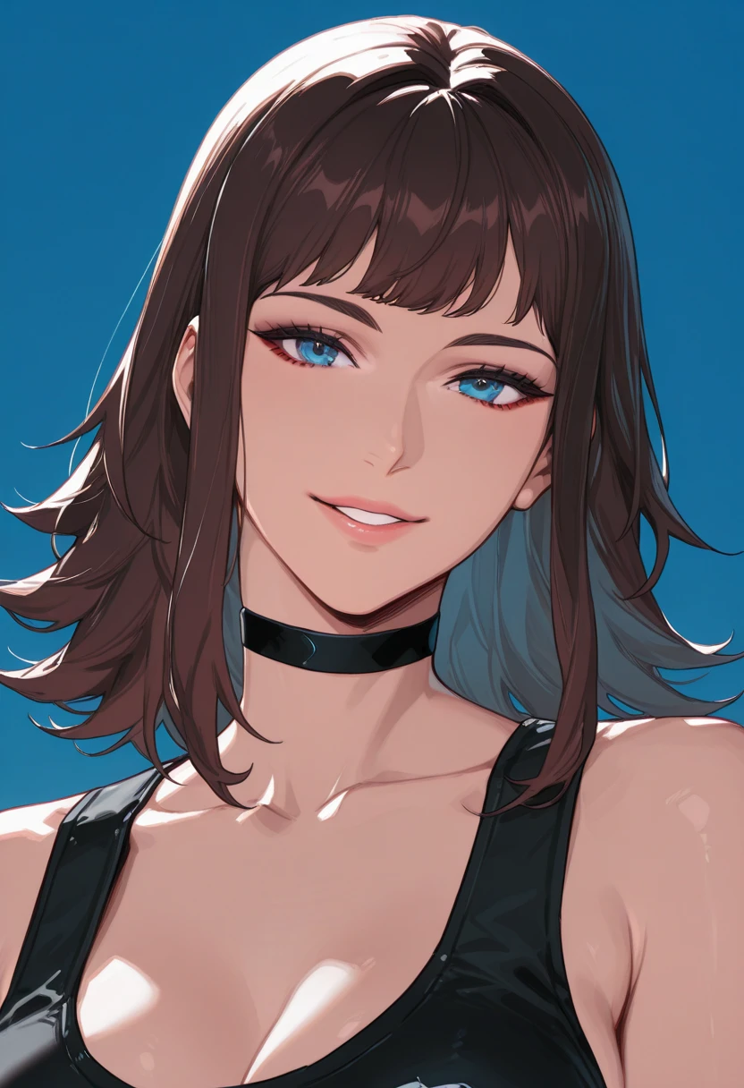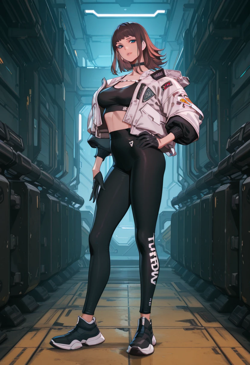black choker, black cropped tank top, white jacket, black gloves, black leggings, sneakers