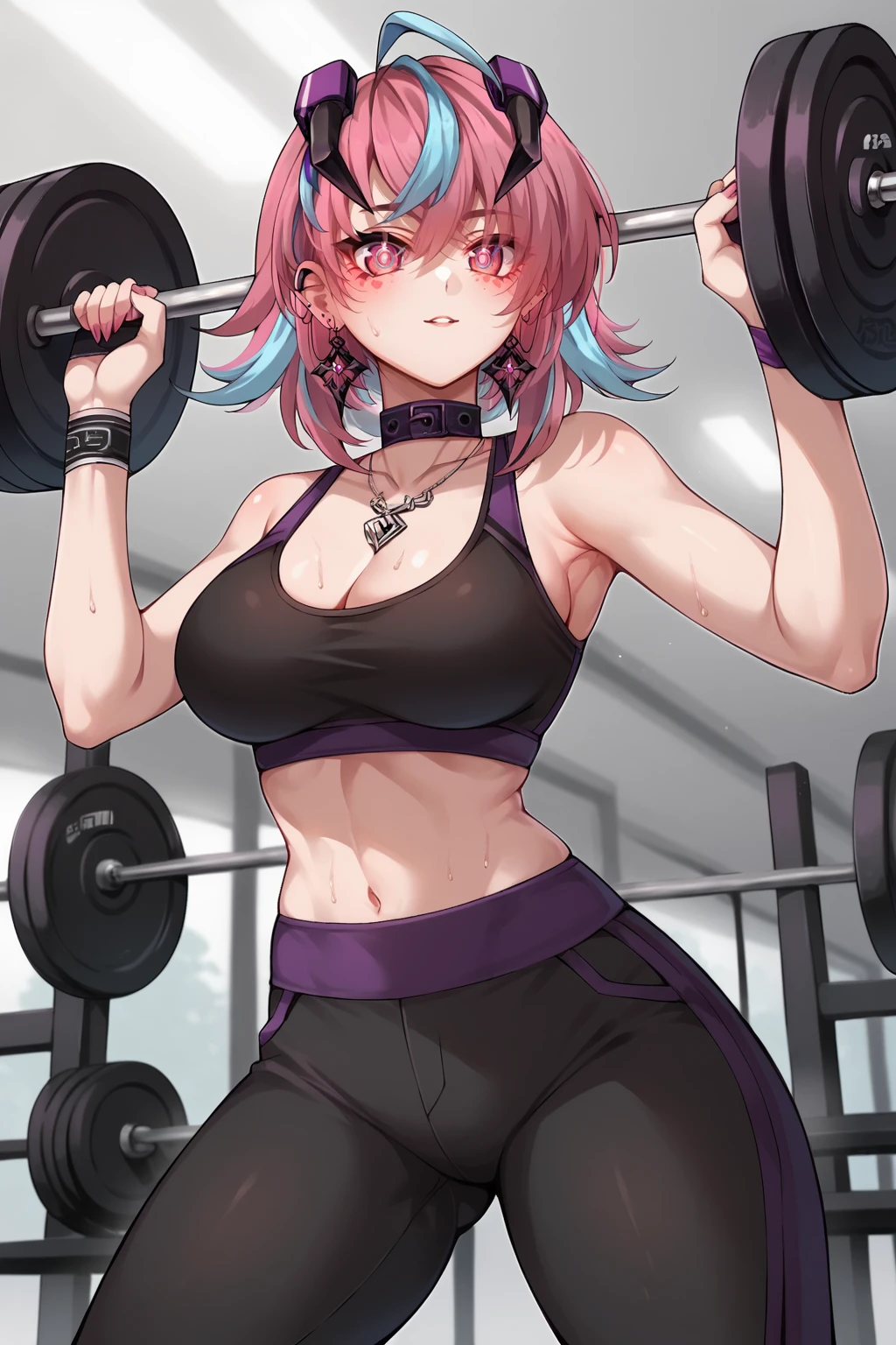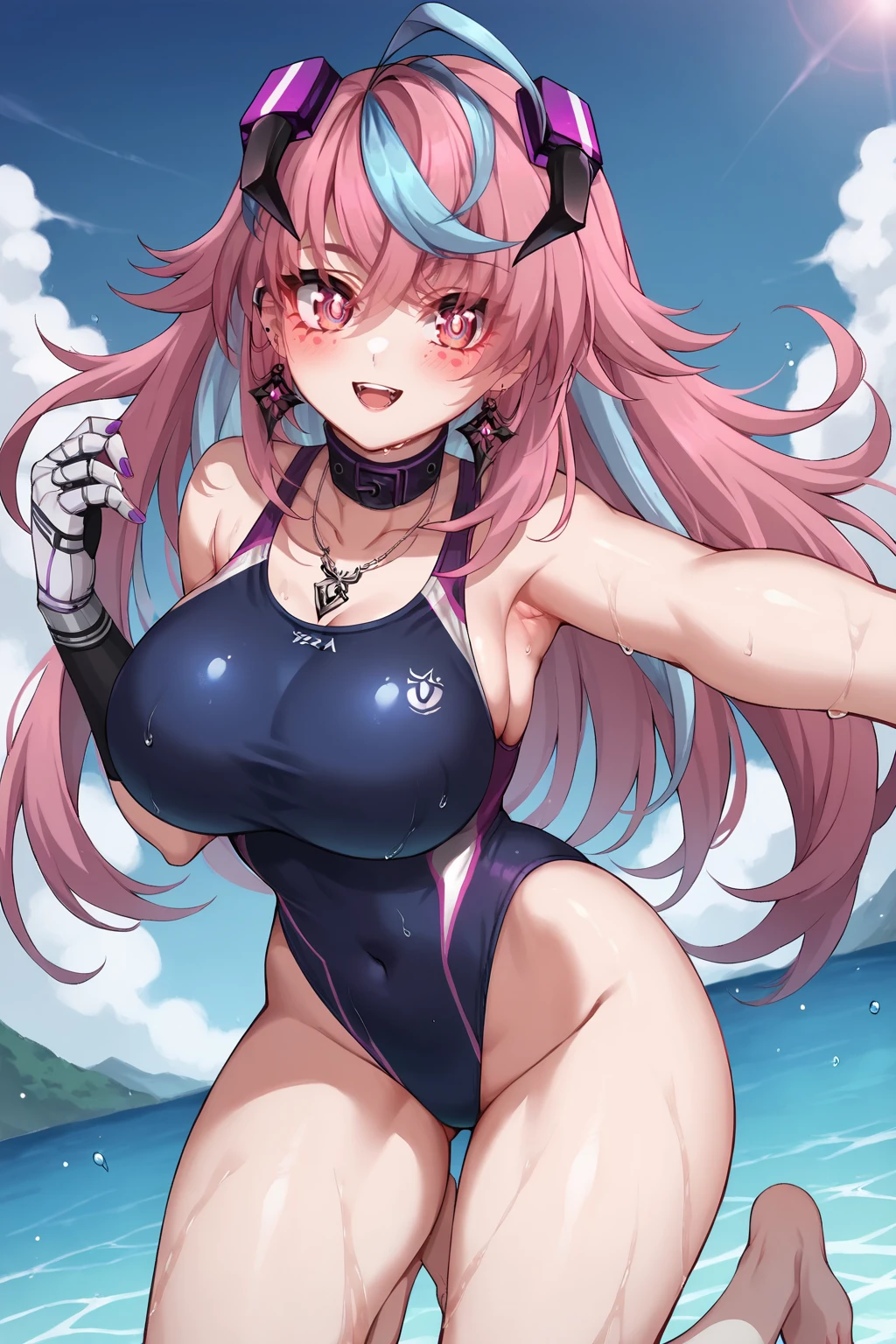 purple skirt, midriff, clothing cutout, underboob, single thighhigh, asymmetrical legwear, thigh strap,collar, necklace, jewelry, earrings, horns, single mechanical arm,extras