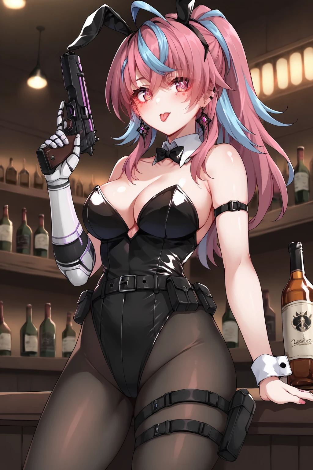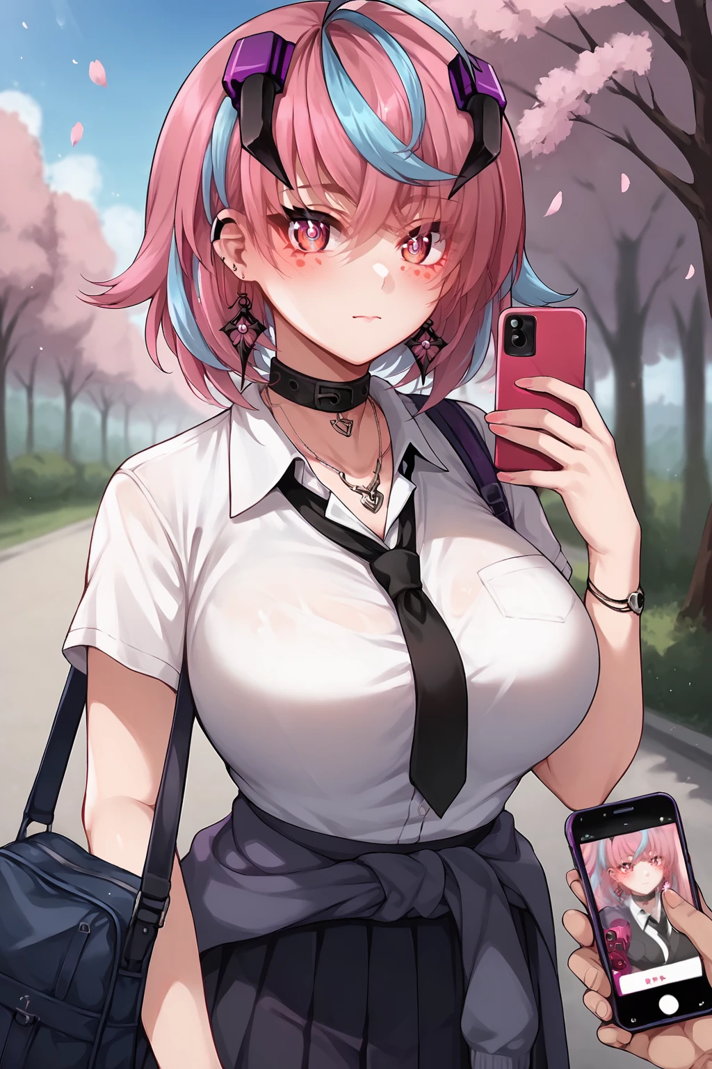 Emi, 1girl, solo, purple eyes, pink eyes, red eyes, pink hair, blue hair, multicolored hair, ahoge,outfit