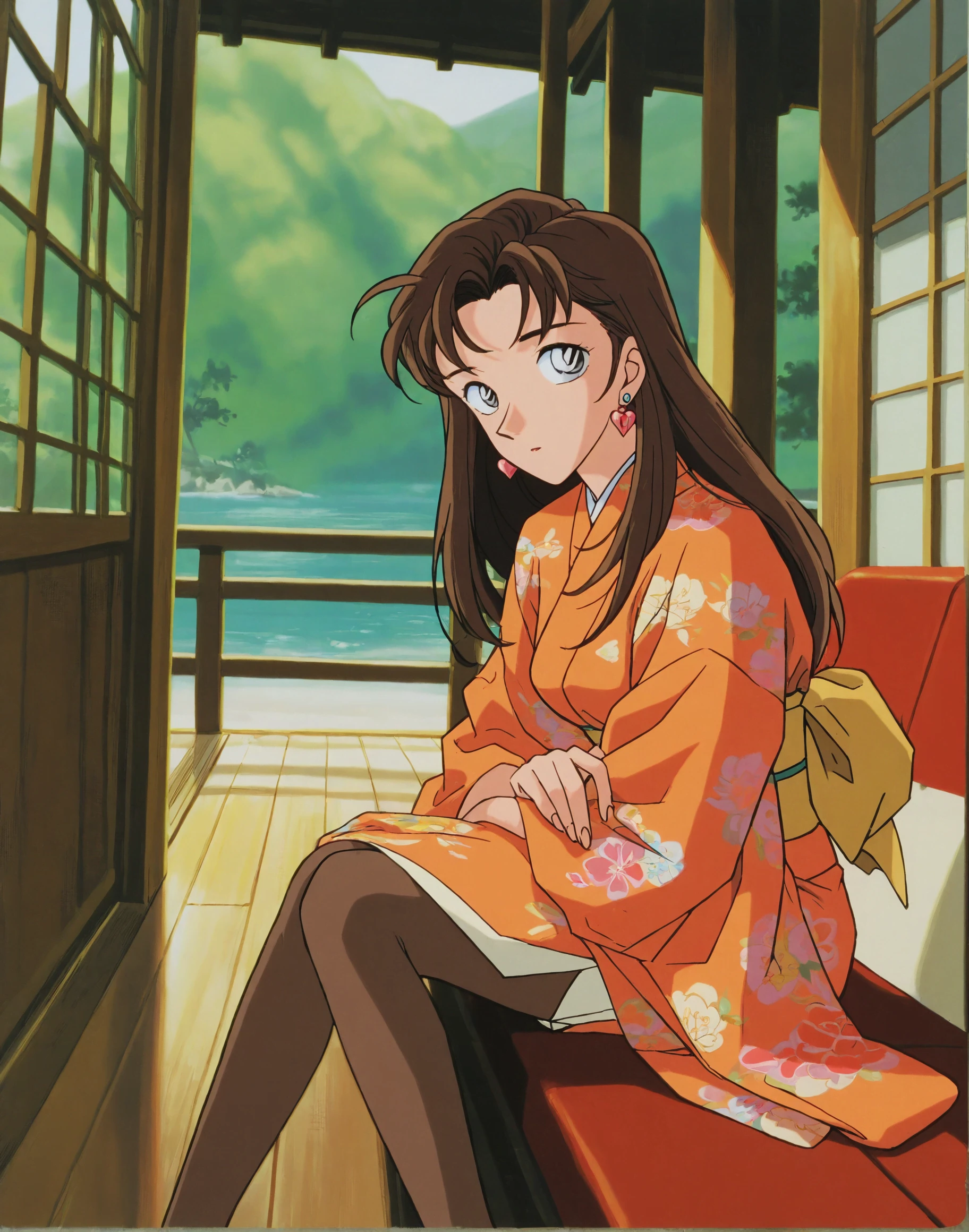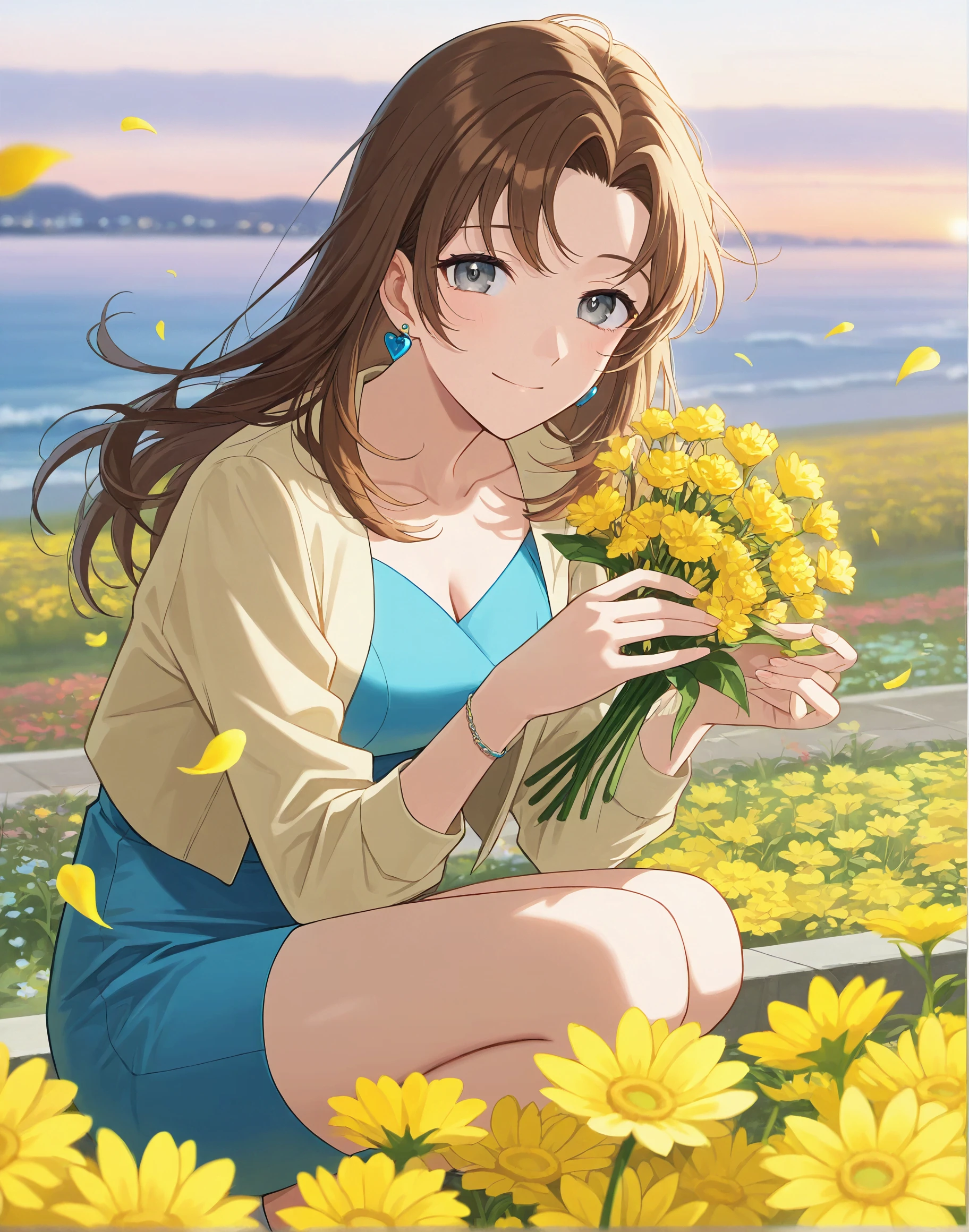 nastumi01, jewelry, earrings, brown hair, long hair, grey eyes, heart earrings,collarbone,parted bangs,light yellow jacket,blue pencil skirt,blue dress,