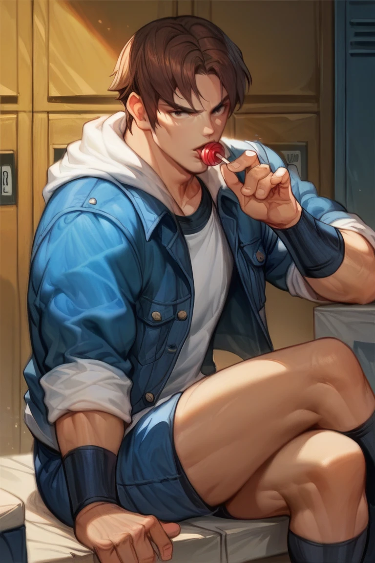 KOF94 tags: blue jacket, white t-shirt, white shorts, black socks, bracelets, sneakers
