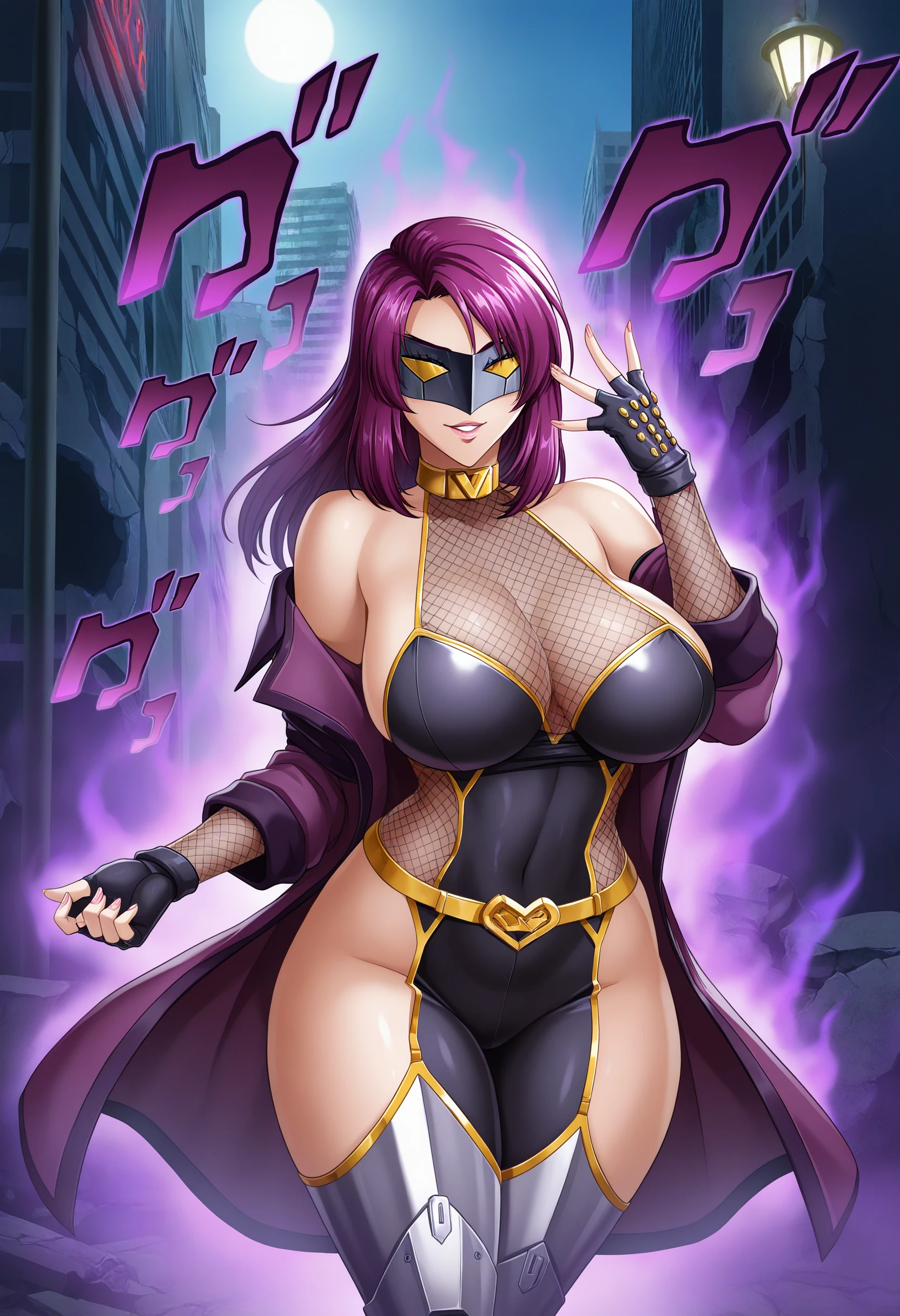 Altoutfit, battle mask, fishnets, fishnet top, sideboob, (armored boots:1.1),