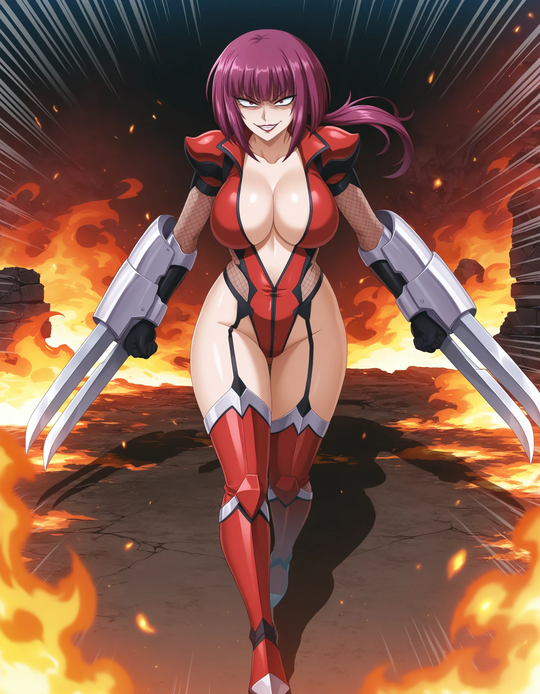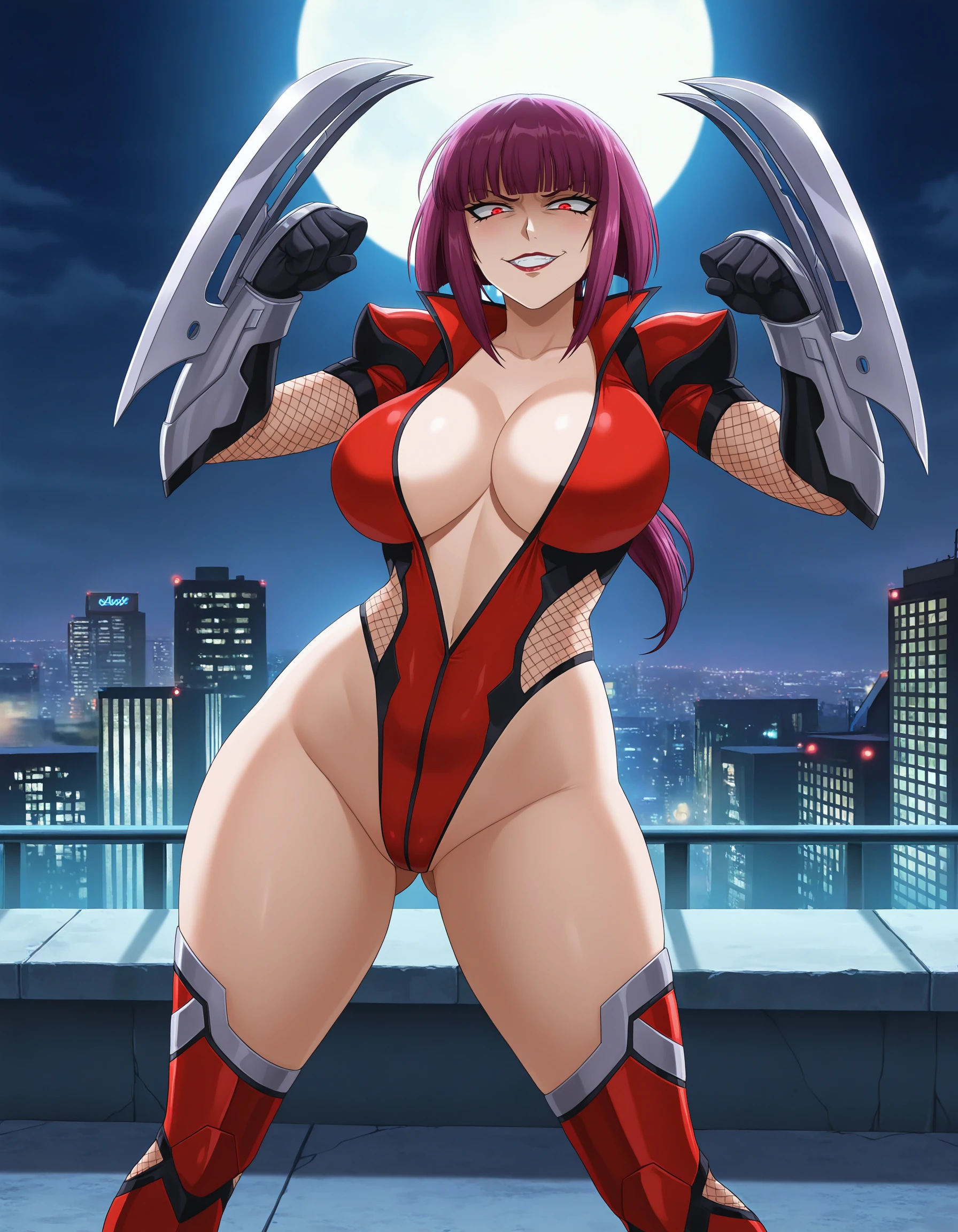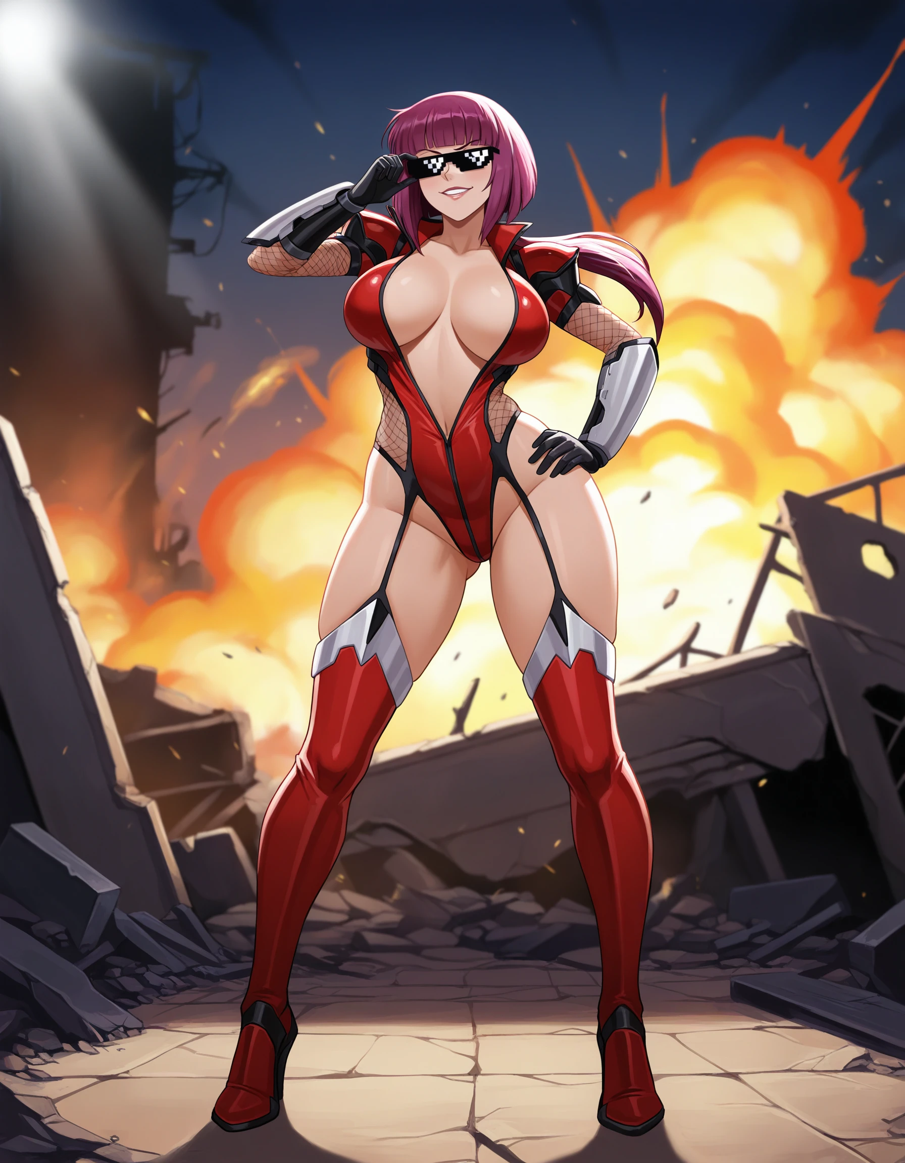 red leotard, black gloves, vambraces, fishnets, center opening, thigh boots,
