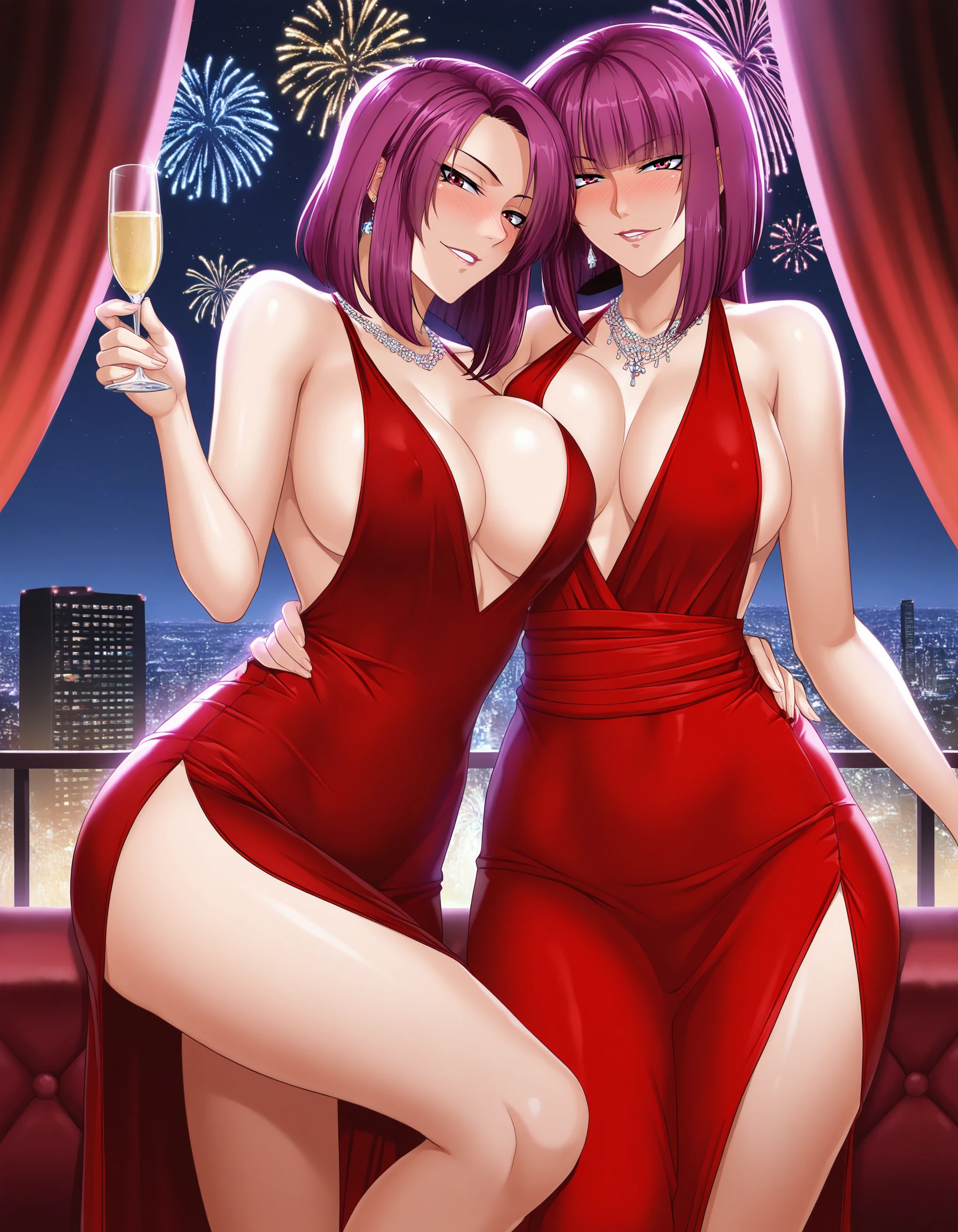 purple hair, short hair, bangs, eyeshadow, low ponytail, lipstick, makeup, detailed face, red eyes,
