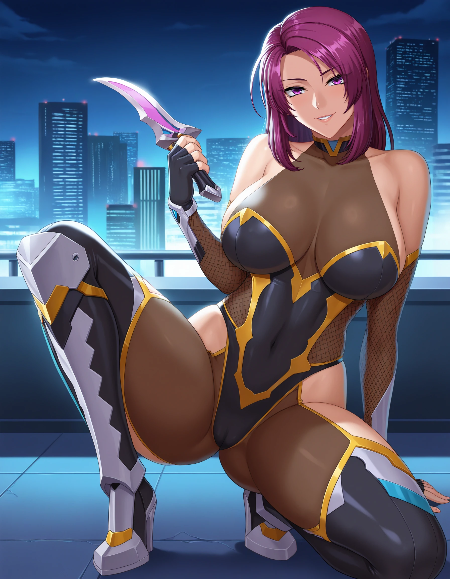 black bodysuit, gold trim, fishnets, armored boots, elbow fingerless gloves, bare shoulders,